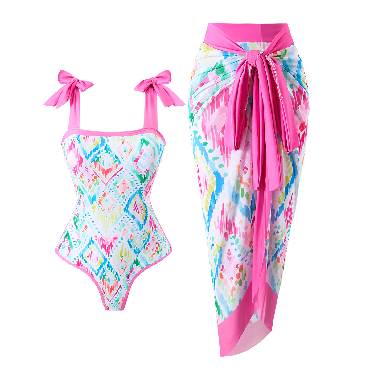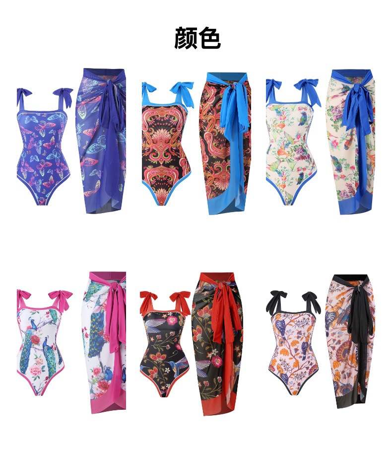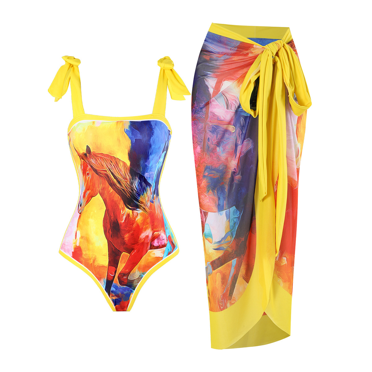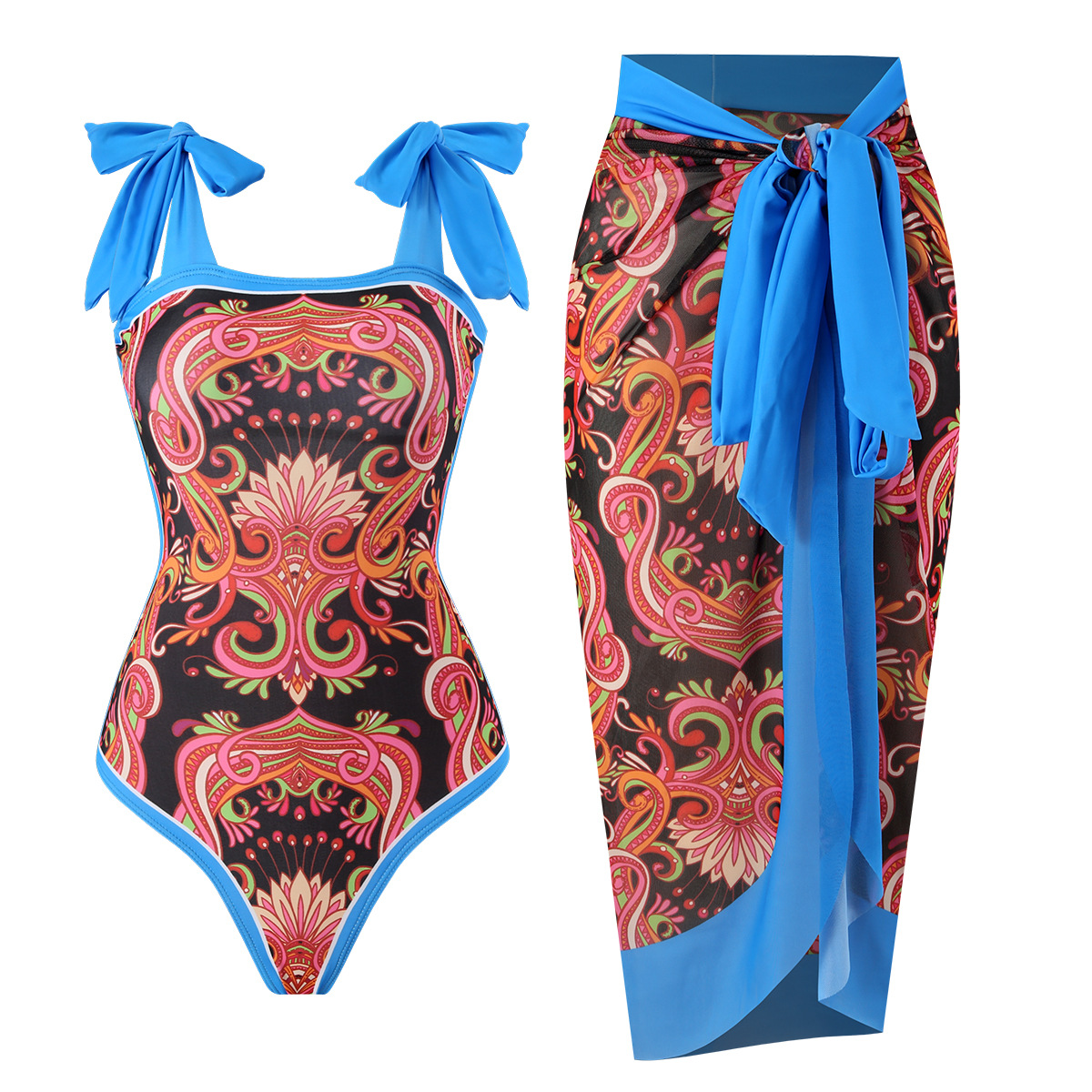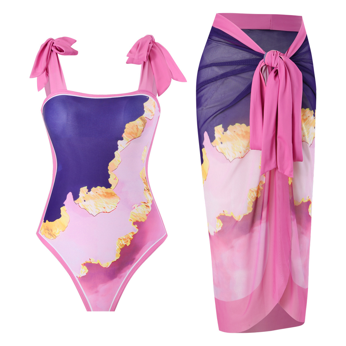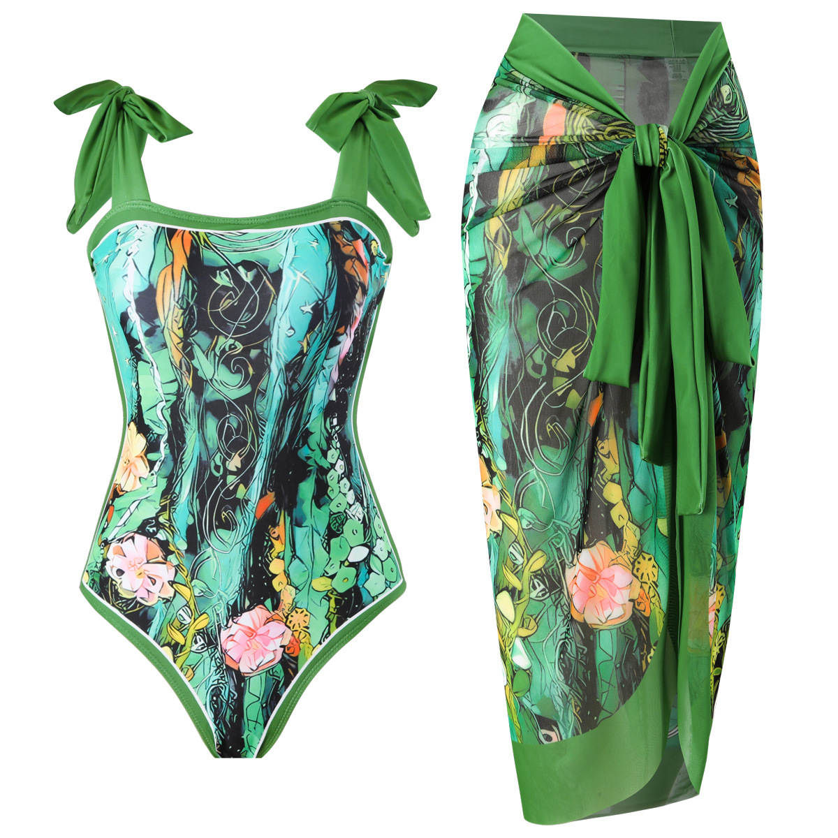 아마존의 새로운 원피스 수영복 멀티 컬러 프린트 힙 커버 거즈 스커트 노출 방지 투피스 여성용 자외선 차단 수영복