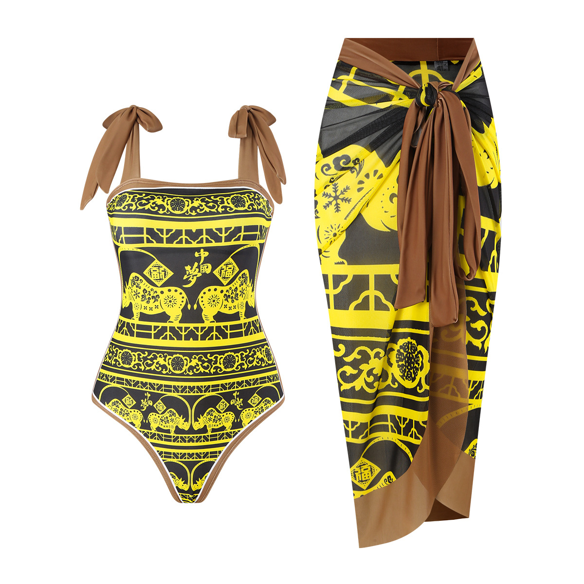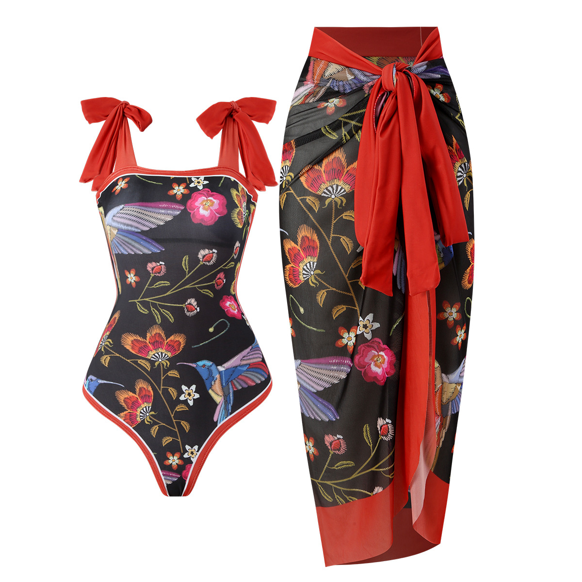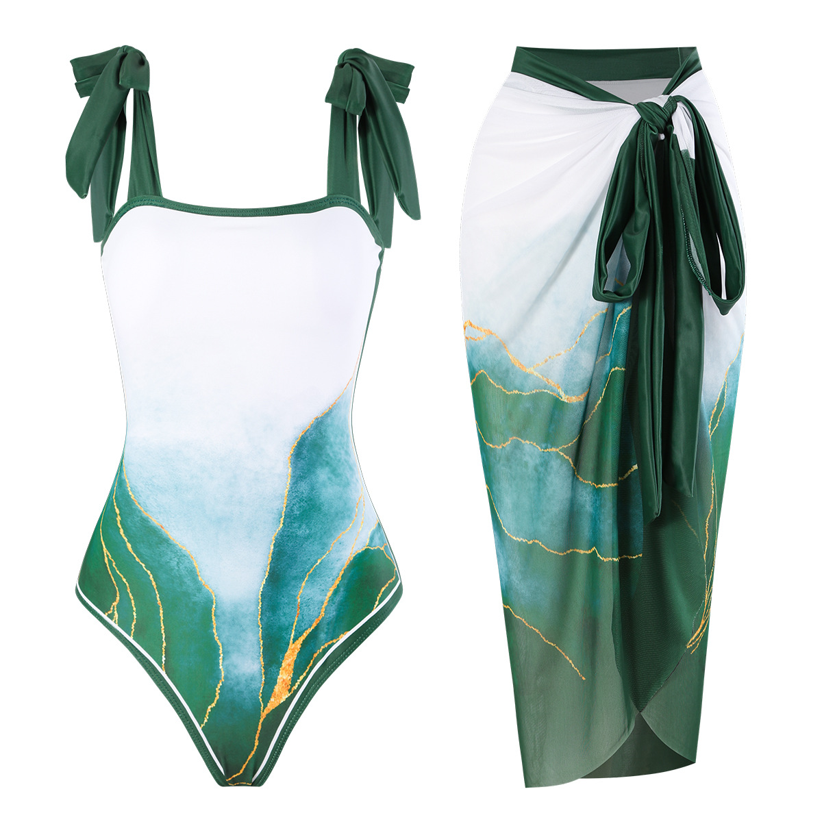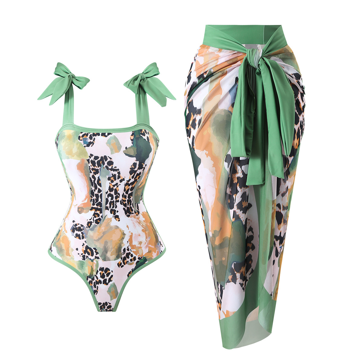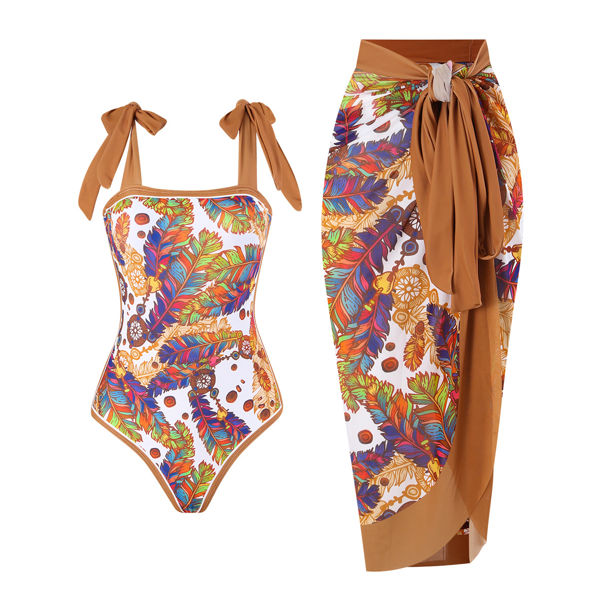 아마존의 새로운 원피스 수영복 멀티 컬러 프린트 힙 커버 거즈 스커트 노출 방지 투피스 여성용 자외선 차단 수영복