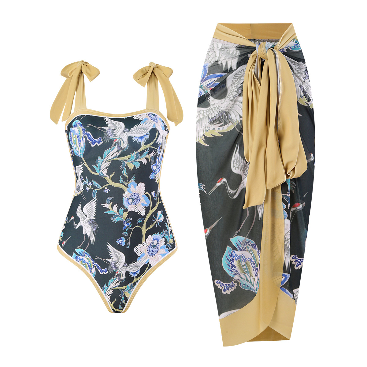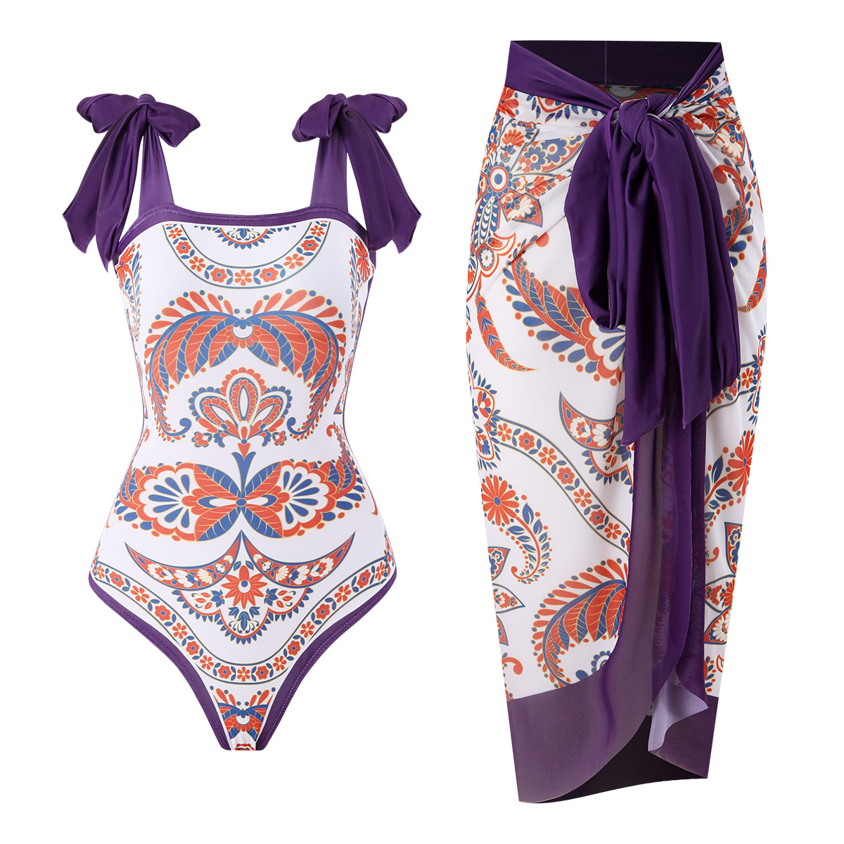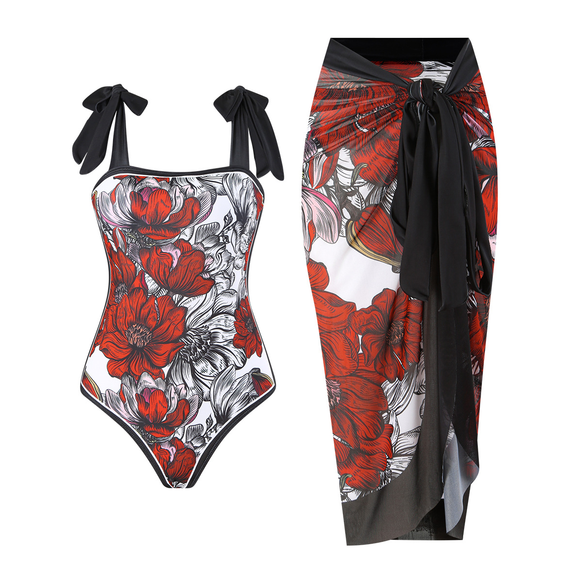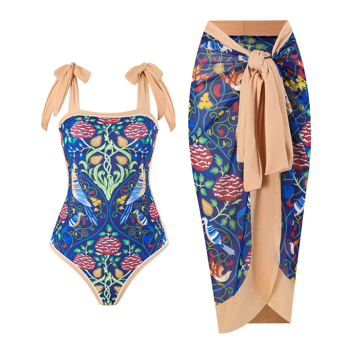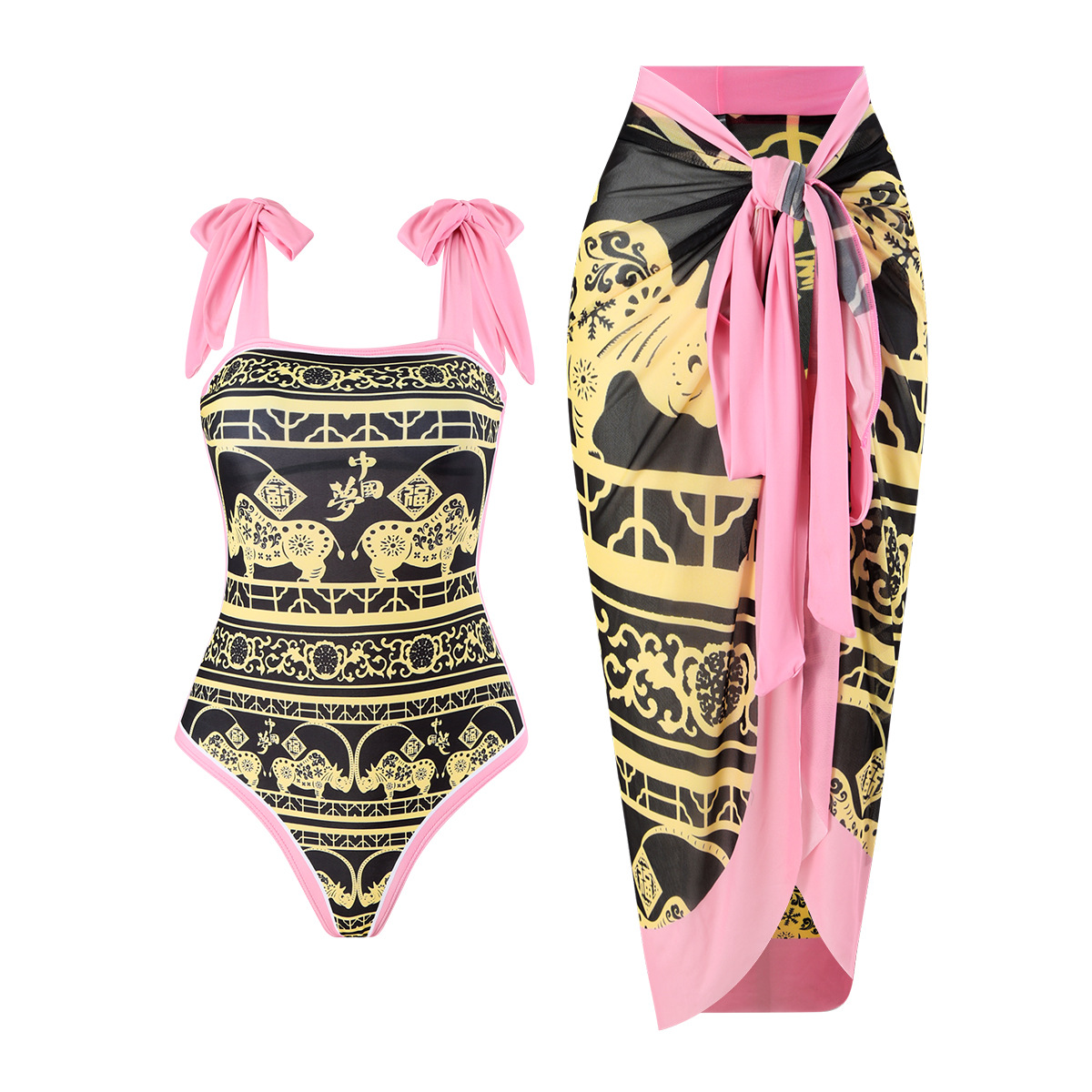아마존의 새로운 원피스 수영복 멀티 컬러 프린트 힙 커버 거즈 스커트 노출 방지 투피스 여성용 자외선 차단 수영복