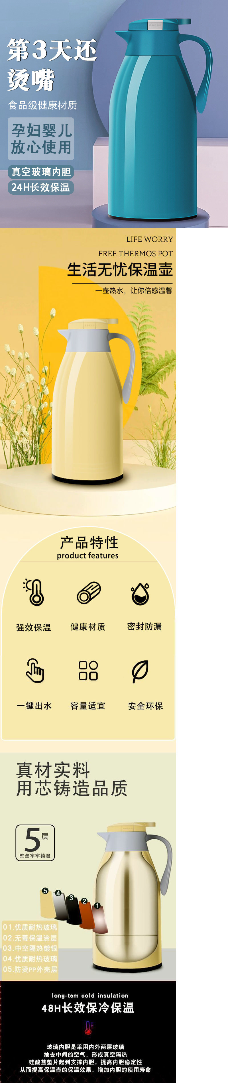 단열 주전자 가정용 병 뜨거운 물병 유리 라이너 따뜻한 물 가정용 대용량 보온병 휴대용 보온병 병