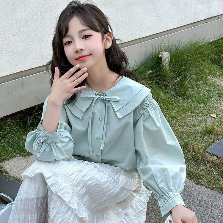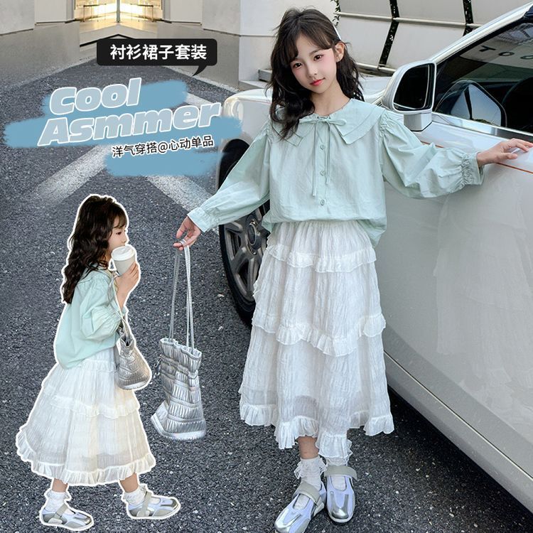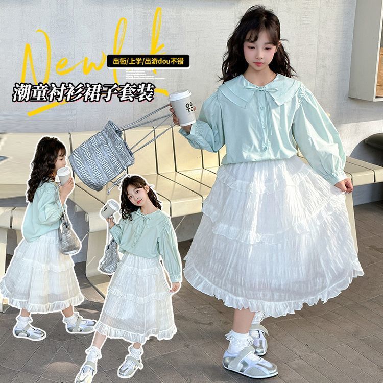 소녀 인형 칼라 셔츠 봄 2025 새로운 소녀 라이트 그린 긴 소매 탑 케이크 스커트 세트 봄과 가을스토어 가기