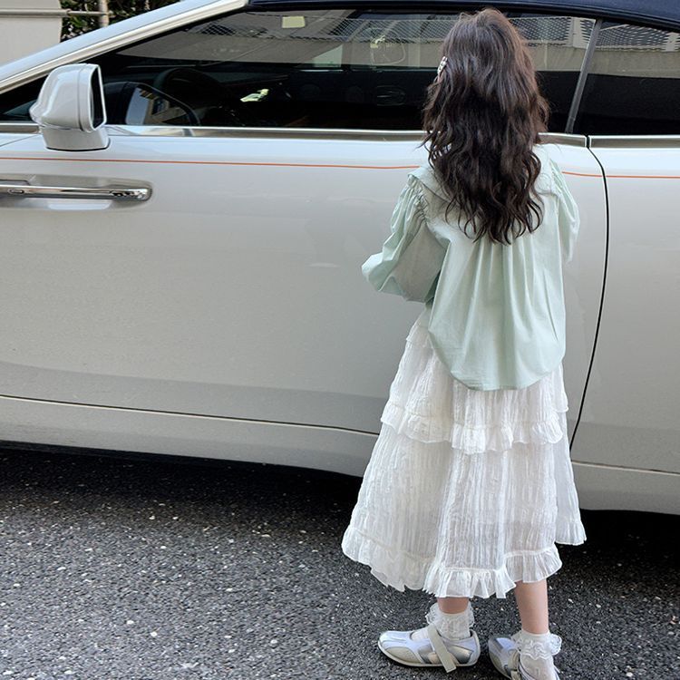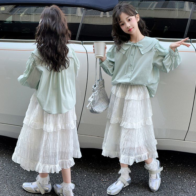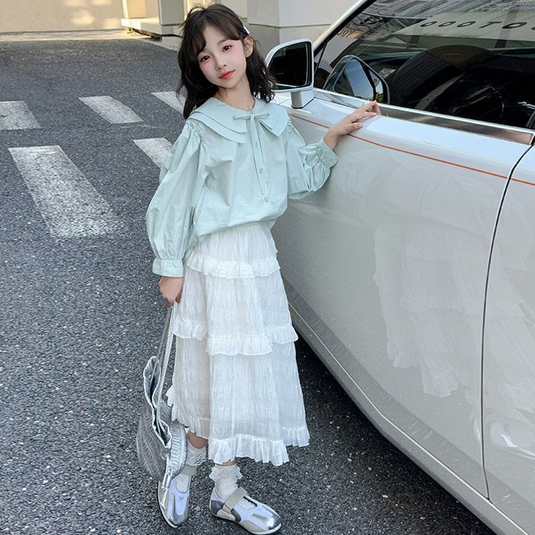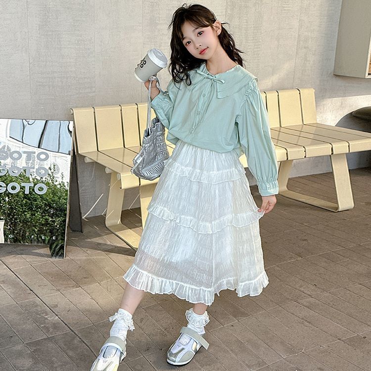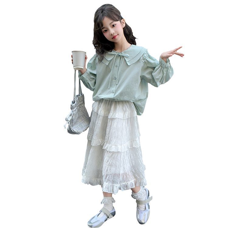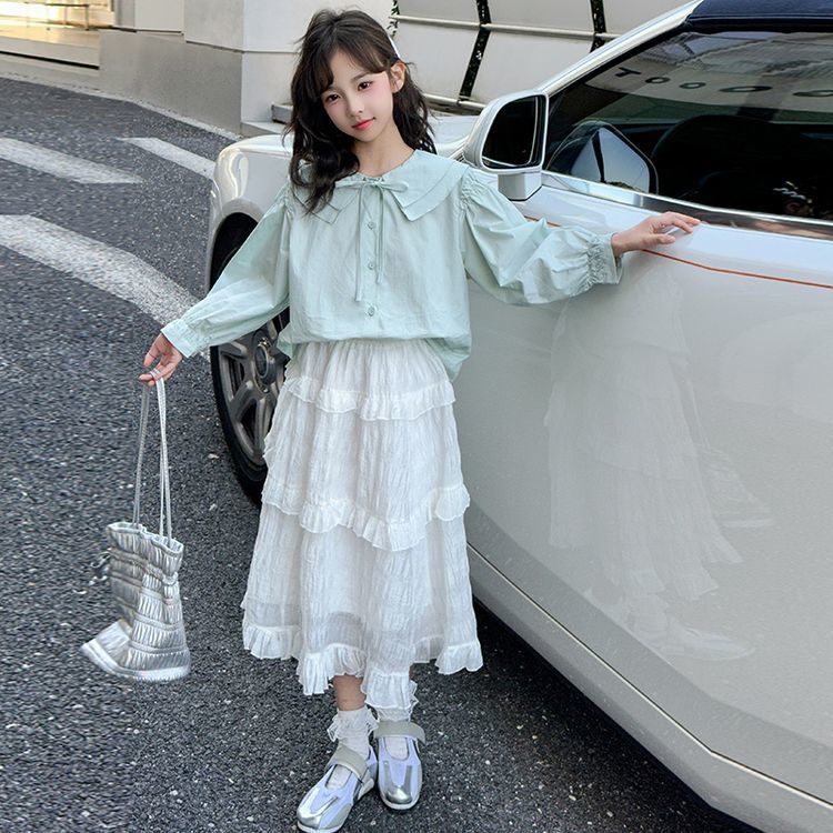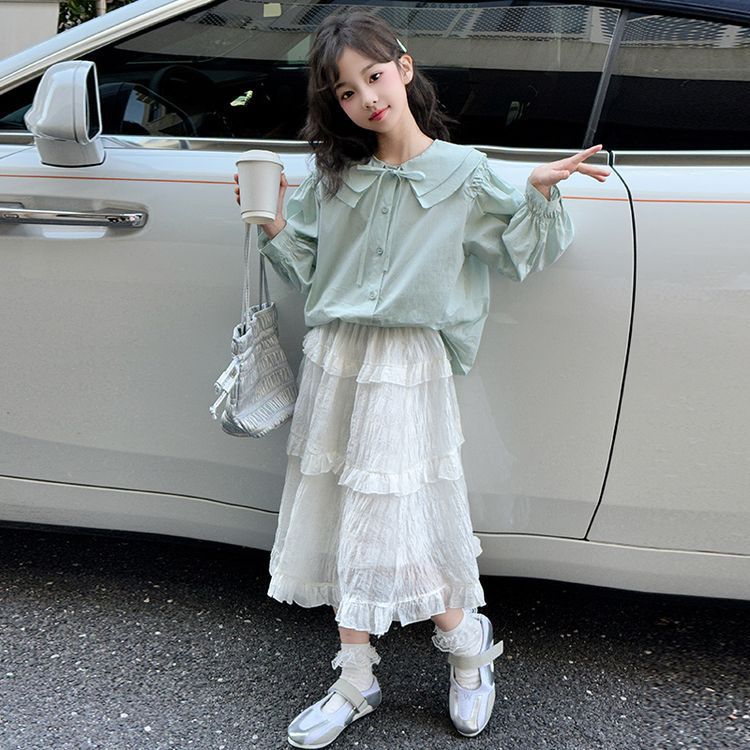 소녀 인형 칼라 셔츠 봄 2025 새로운 소녀 라이트 그린 긴 소매 탑 케이크 스커트 세트 봄과 가을