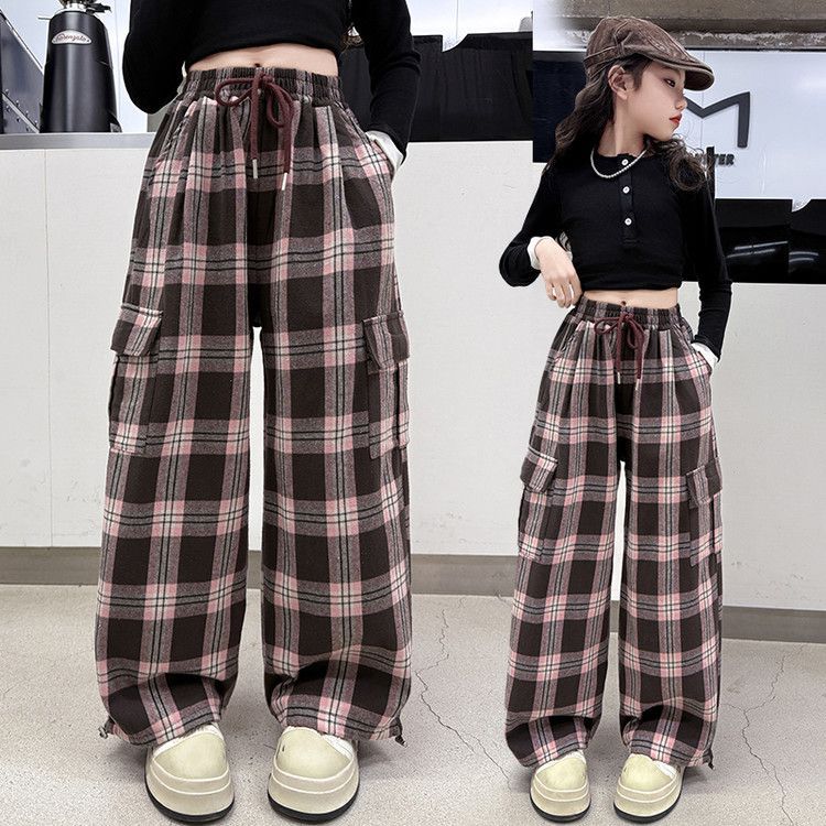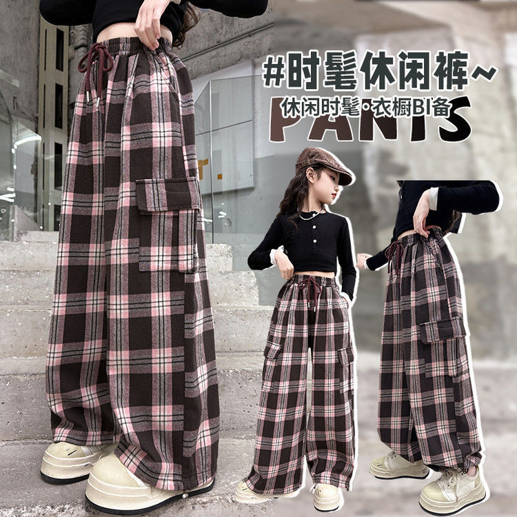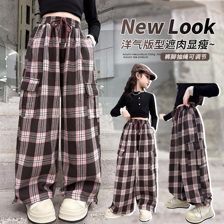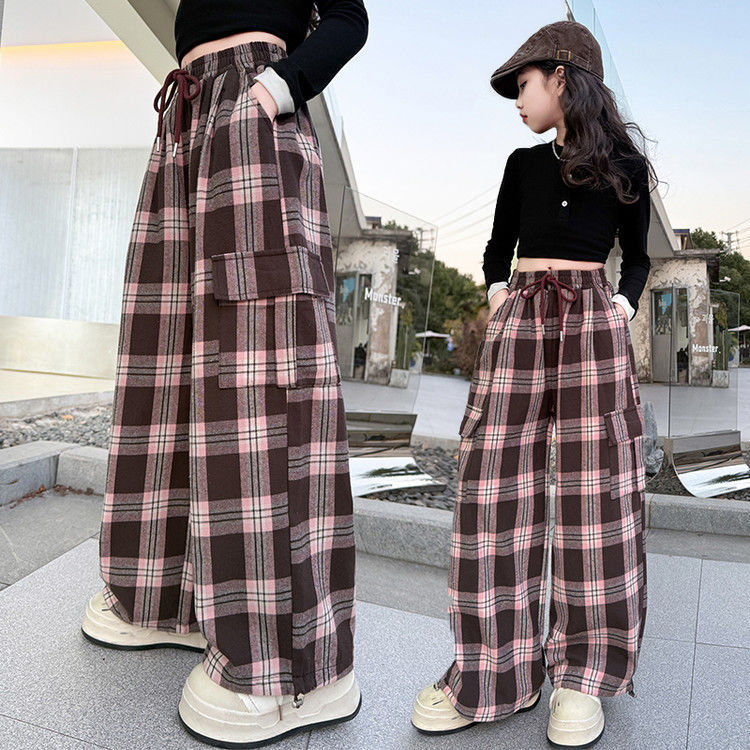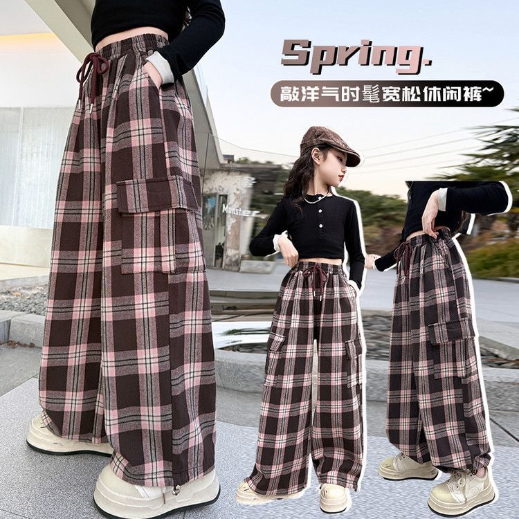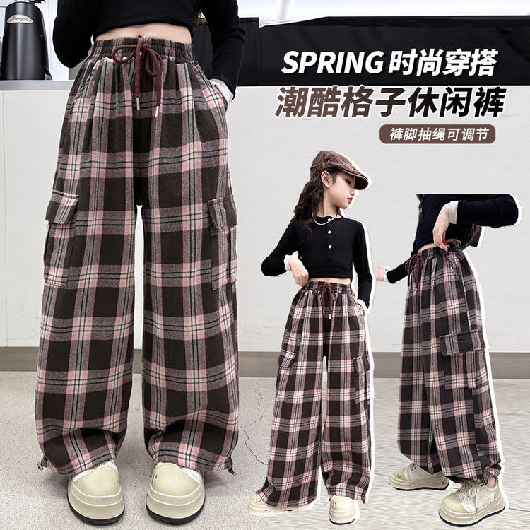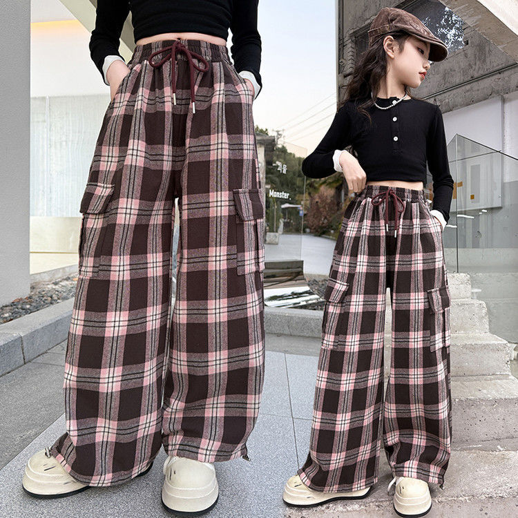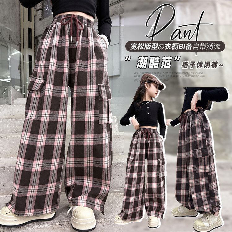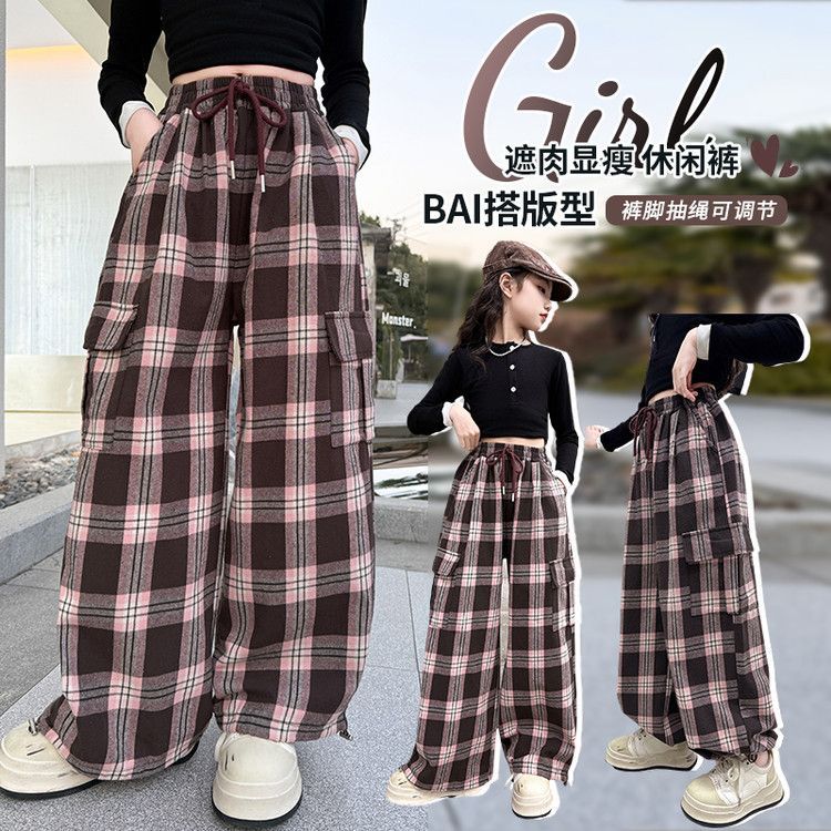 소녀 격자 무늬 크레인 바지 봄과 가을 2025 새로운 소녀 세련된 캐주얼 와이드 다리 바지 어린이 유행 바지스토어 가기