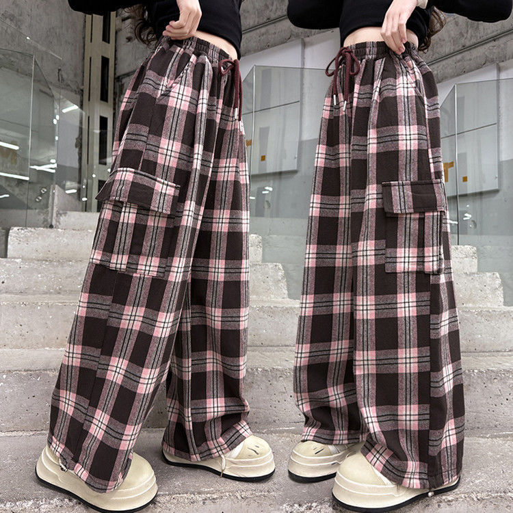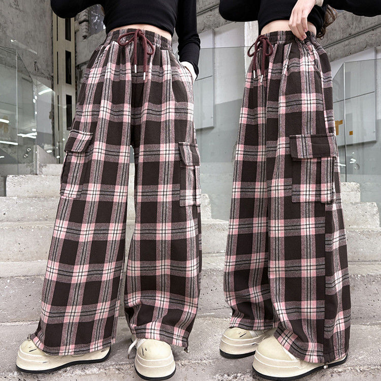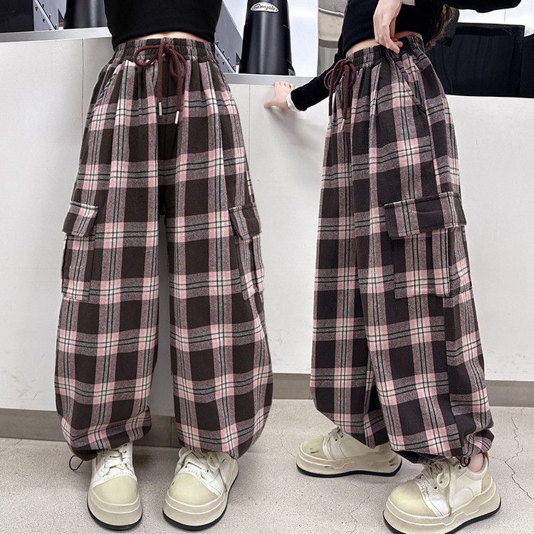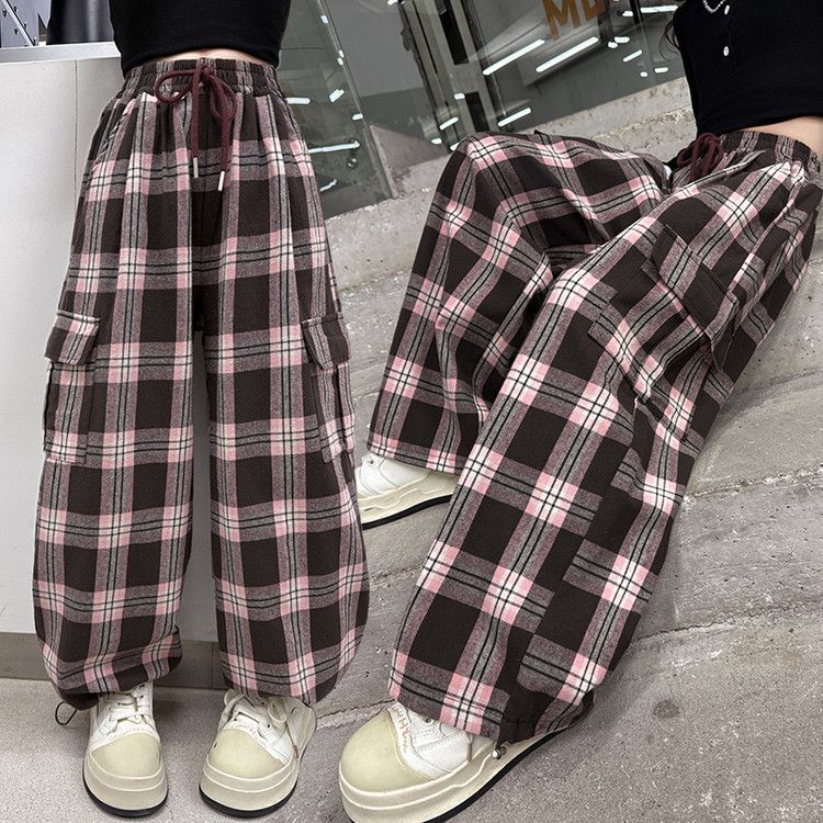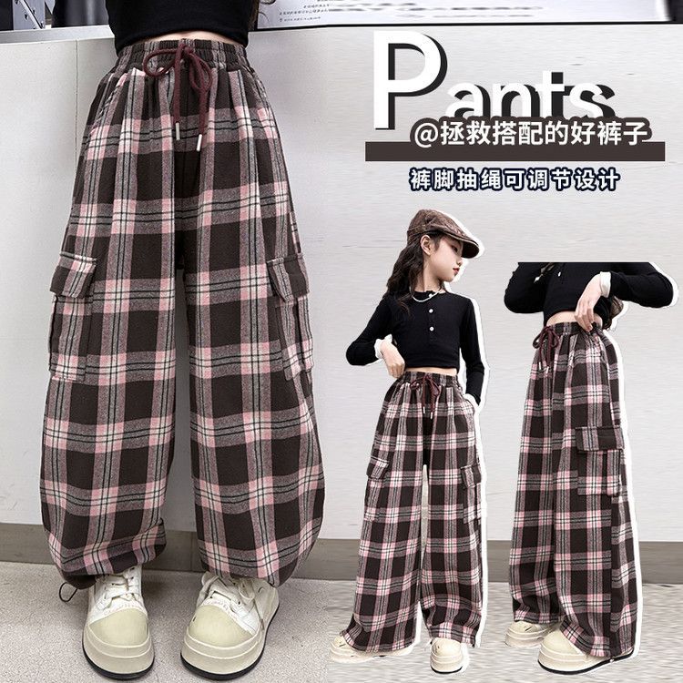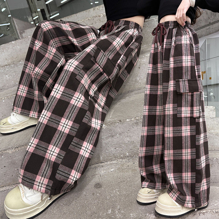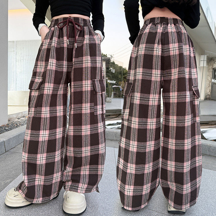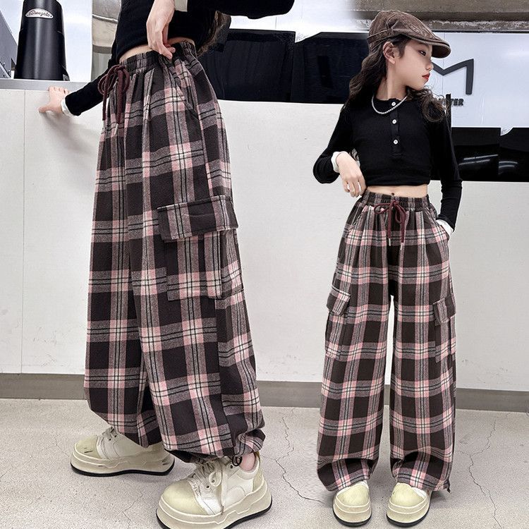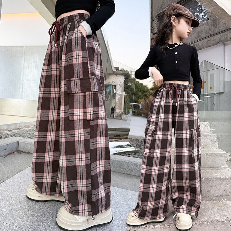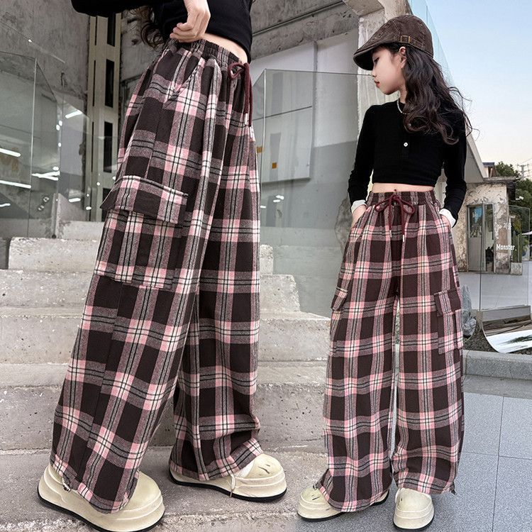 소녀 격자 무늬 크레인 바지 봄과 가을 2025 새로운 소녀 세련된 캐주얼 와이드 다리 바지 어린이 유행 바지스토어 가기