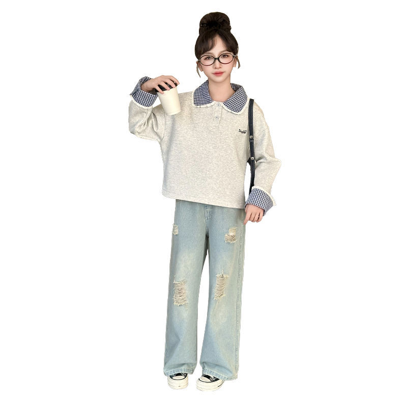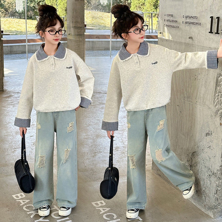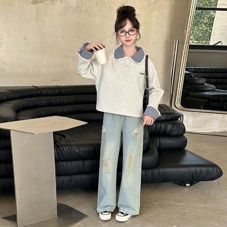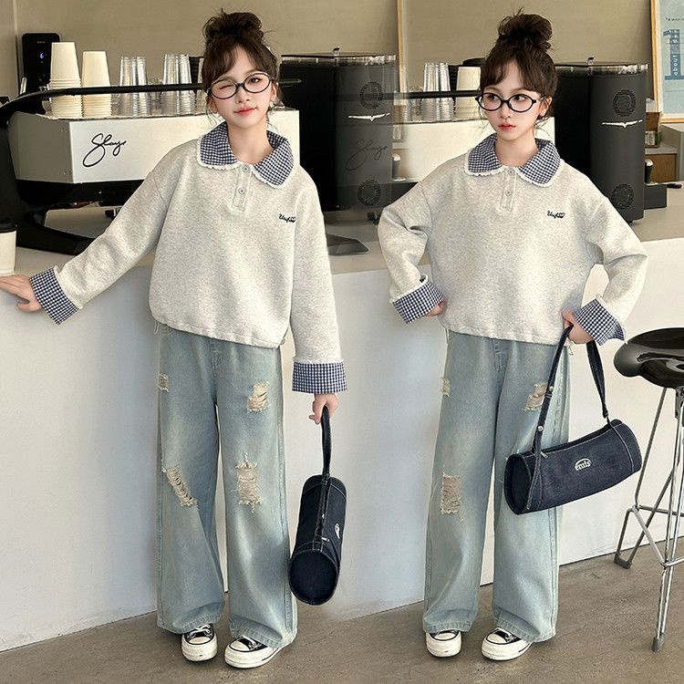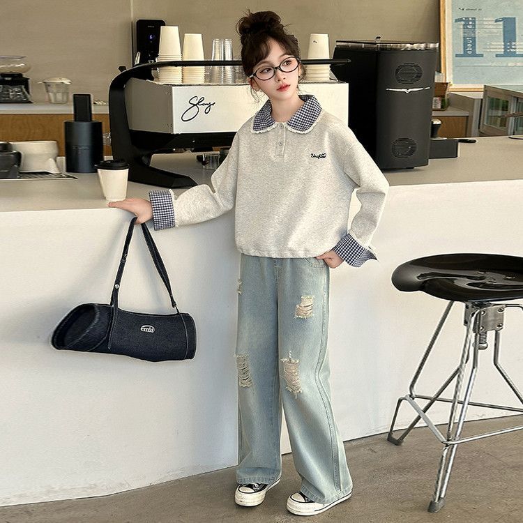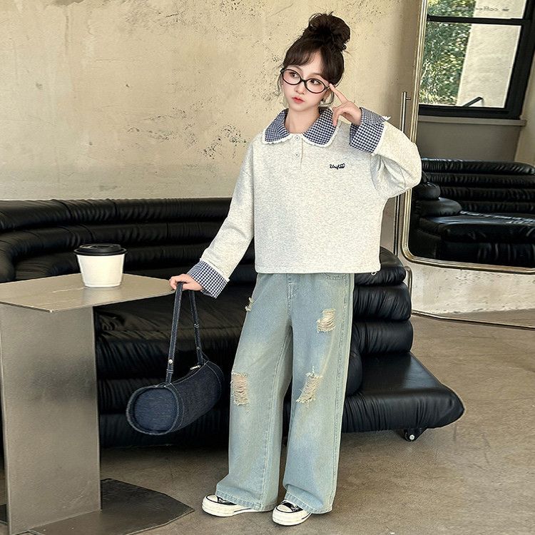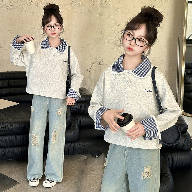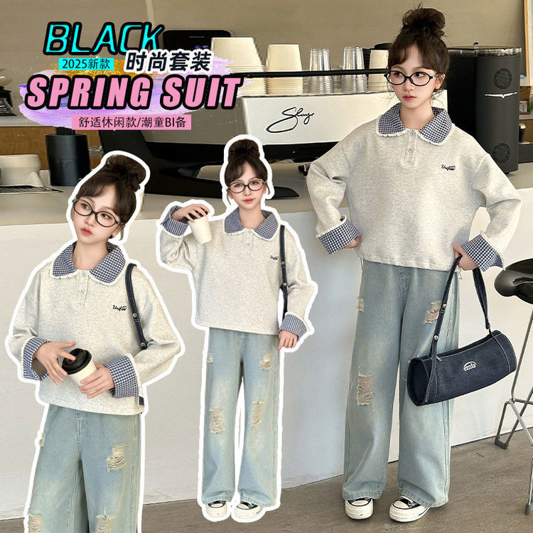 소녀 세트 봄 2025 새로운 어린이 서양 스타일 유행 큰 어린이 폴로 칼라 땀 봄과 가을 넓은 다리 바지스토어 가기
