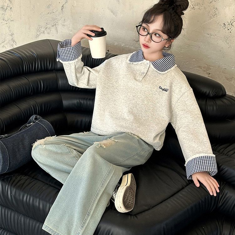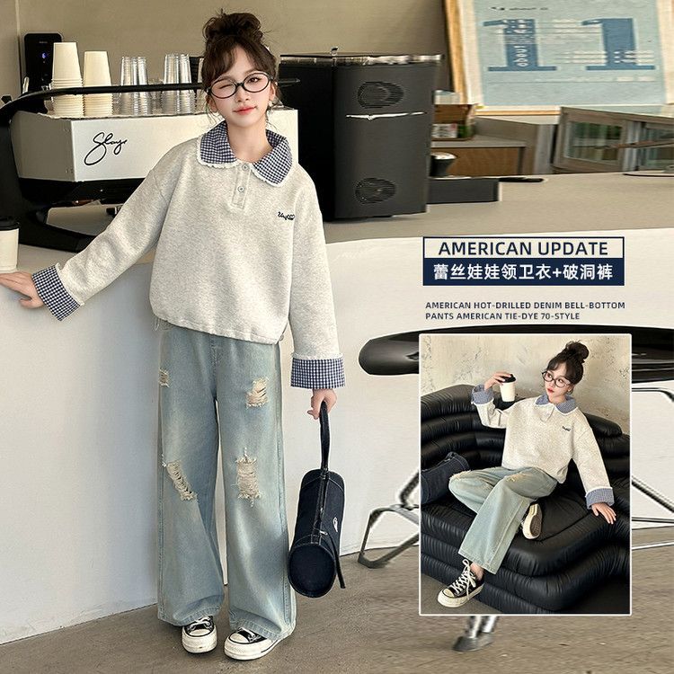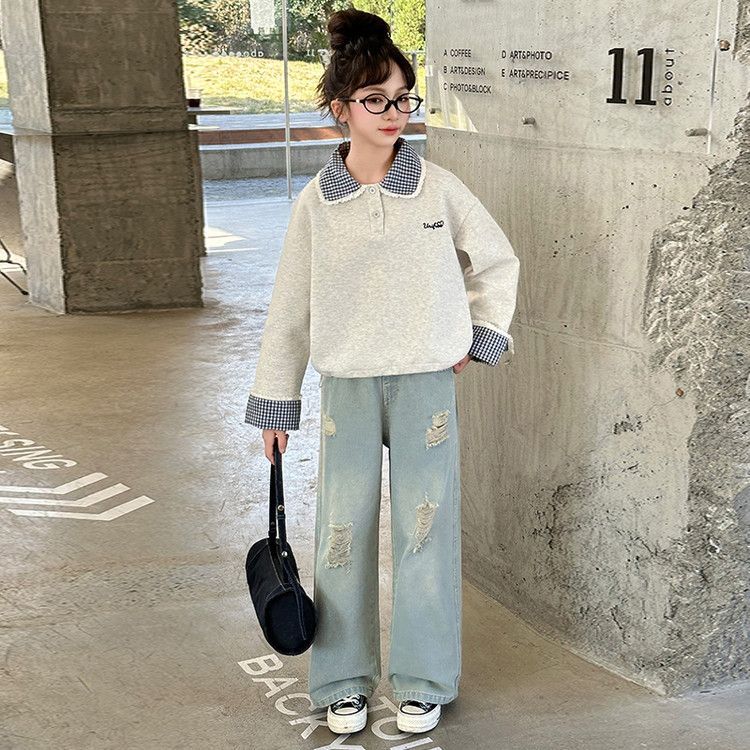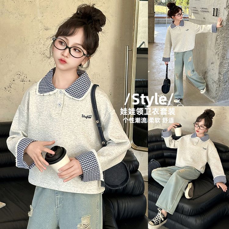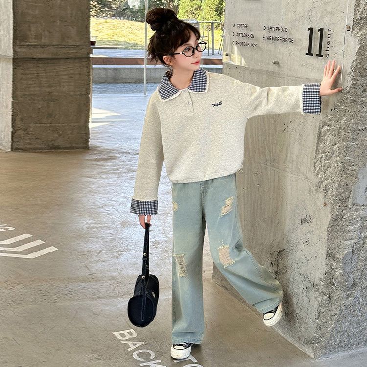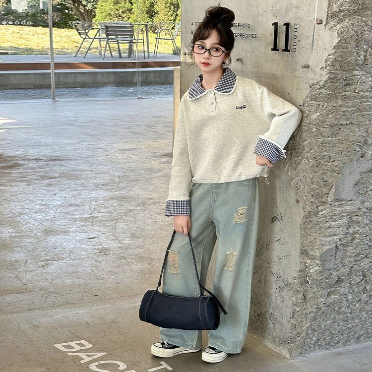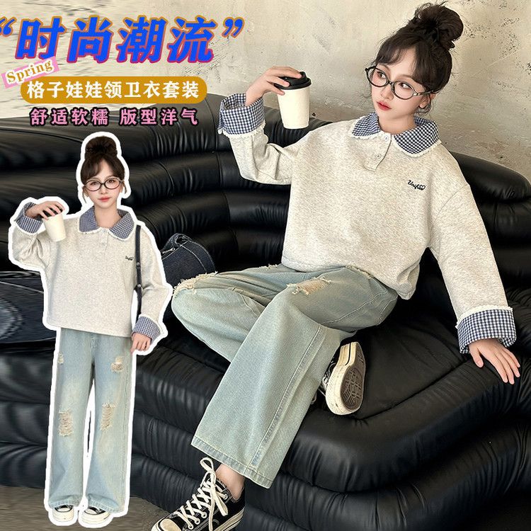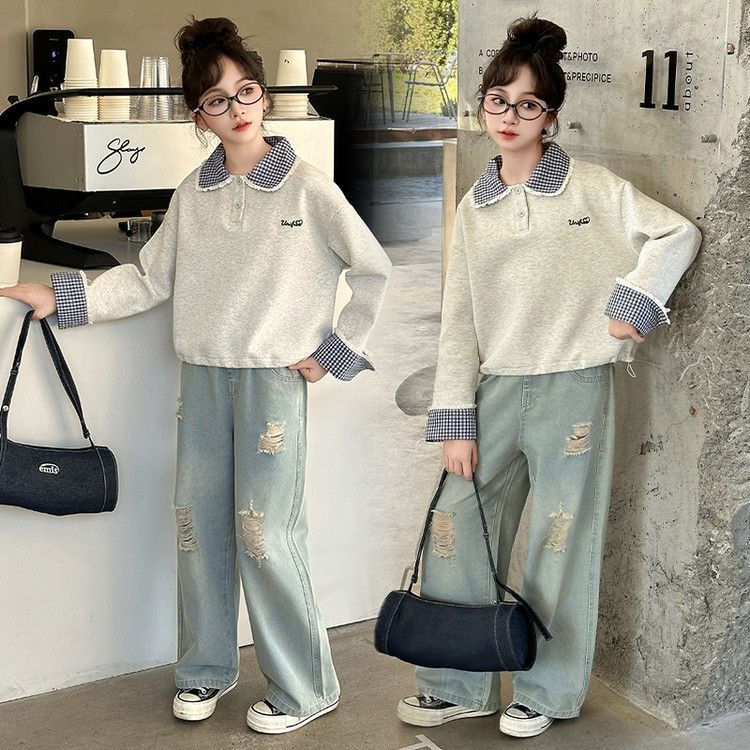 소녀 세트 봄 2025 새로운 어린이 서양 스타일 유행 큰 어린이 폴로 칼라 땀 봄과 가을 넓은 다리 바지스토어 가기