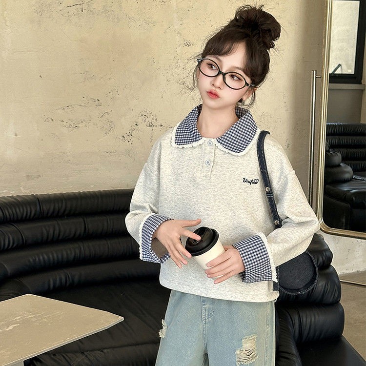 소녀 세트 봄 2025 새로운 어린이 서양 스타일 유행 큰 어린이 폴로 칼라 땀 봄과 가을 넓은 다리 바지