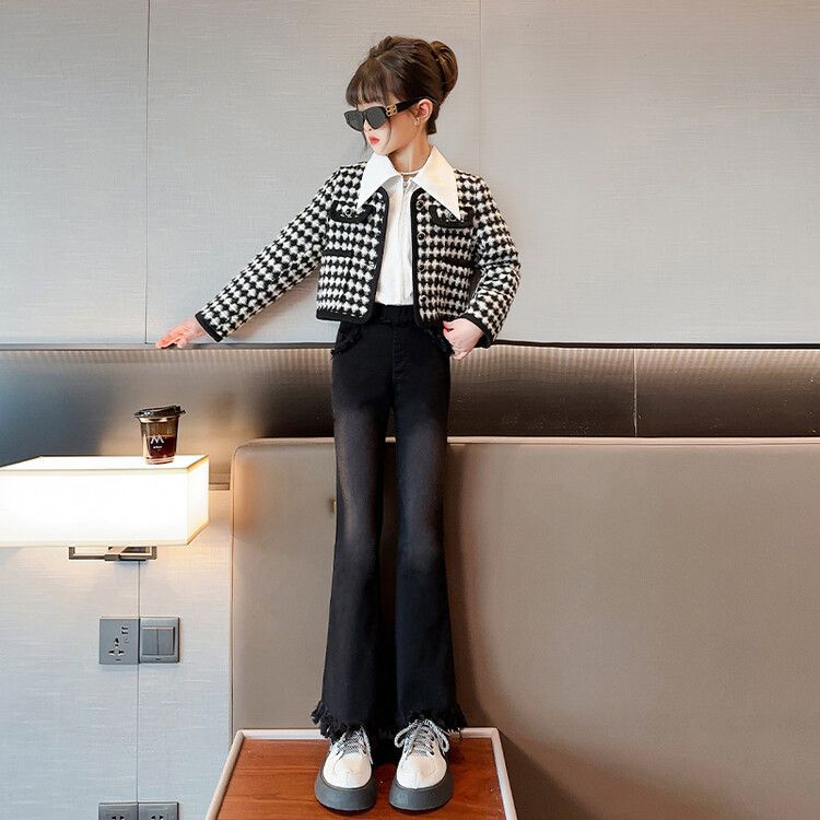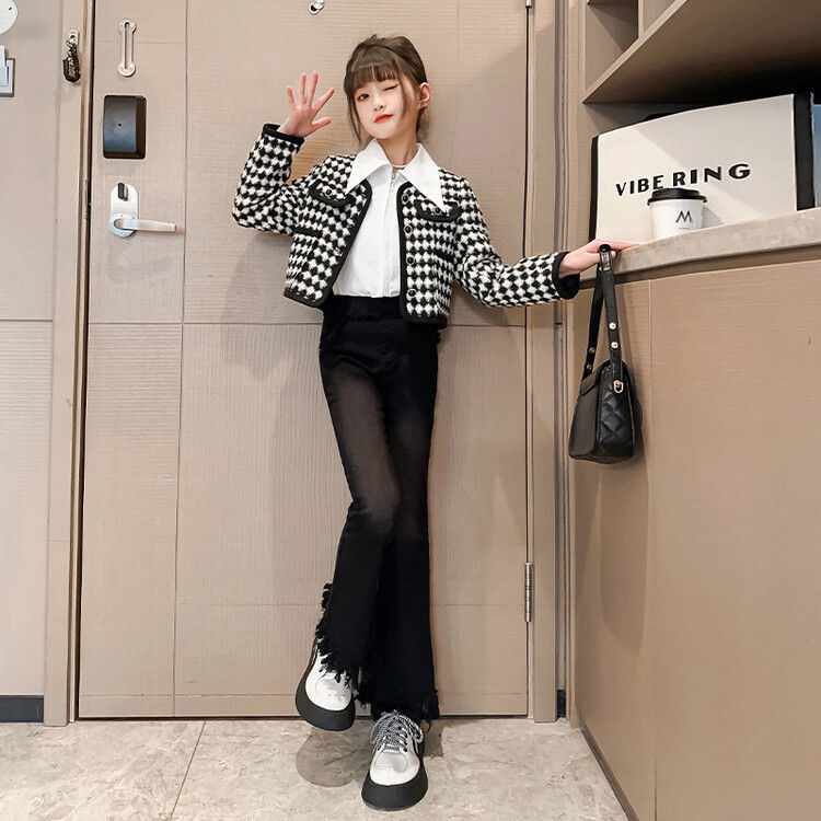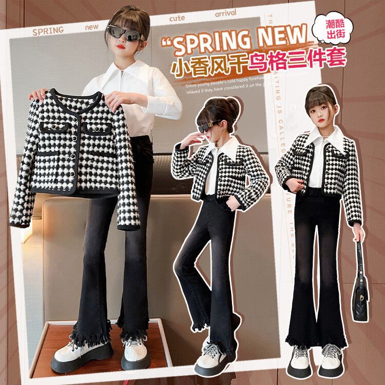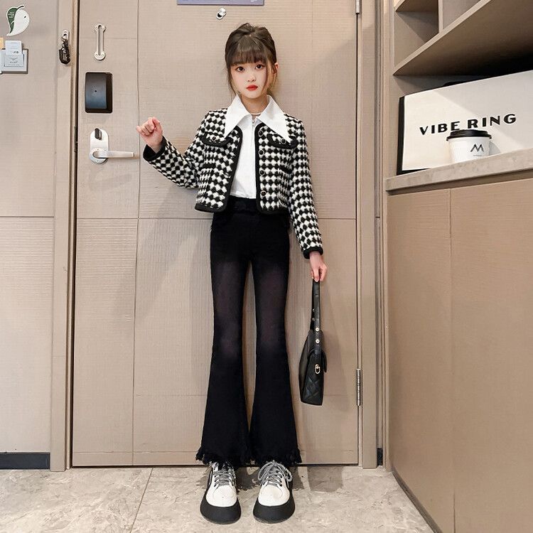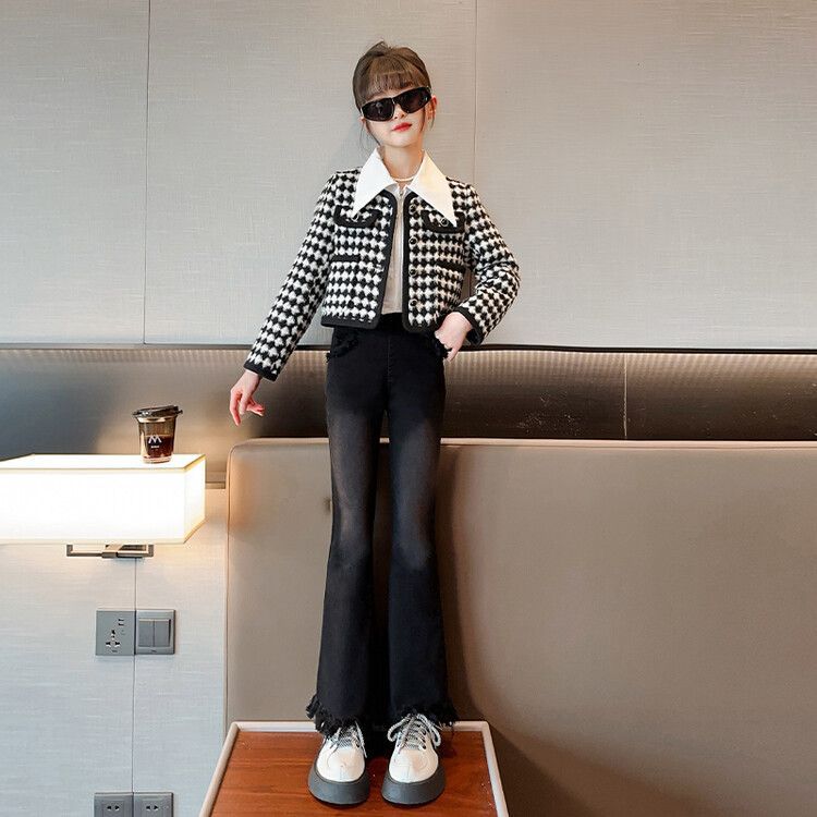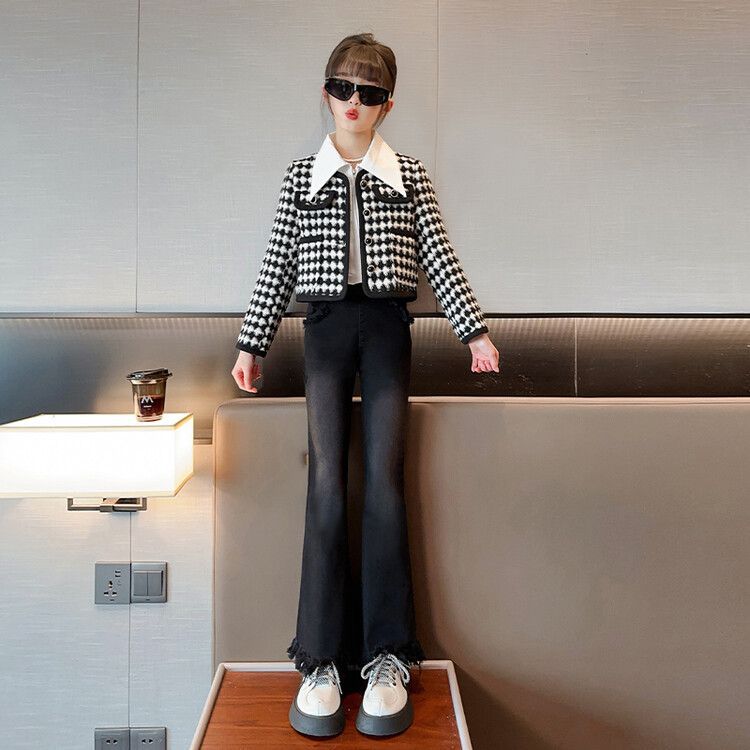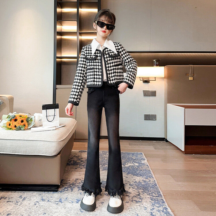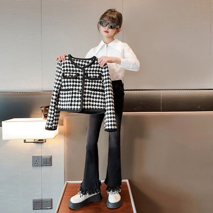 여성. 어린이 작은 향기로운 바람 코트 세트 봄과 가을 2025 새로운 누빔안감 houndstooth Zhongda. 어린이 코트스토어 가기