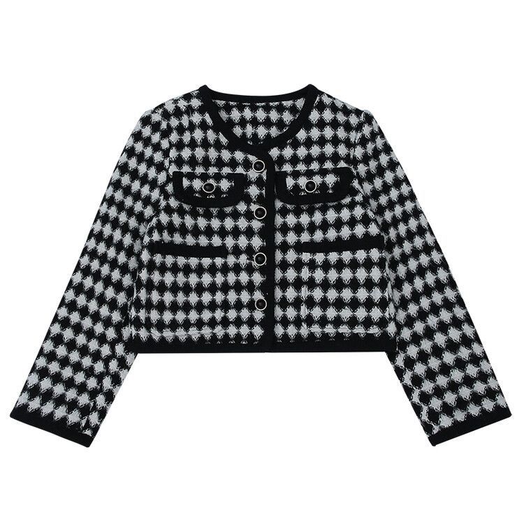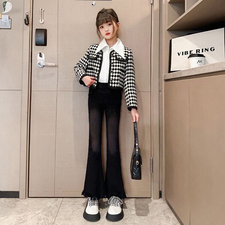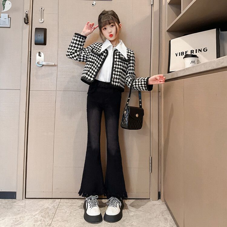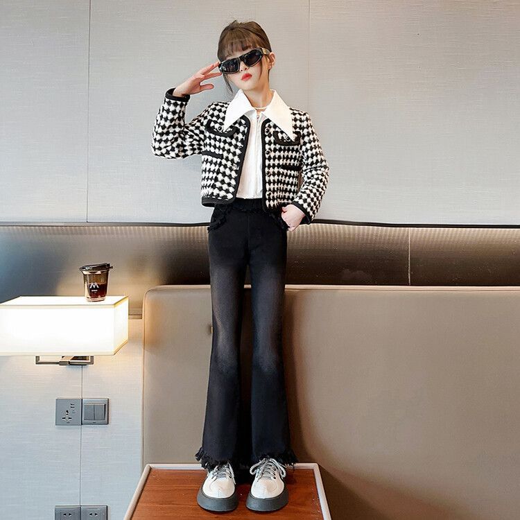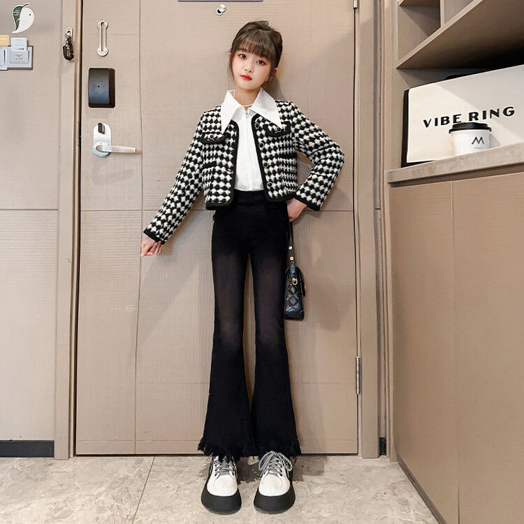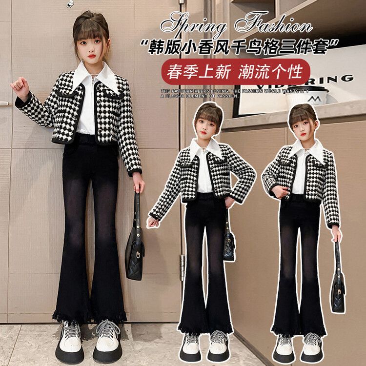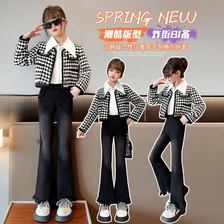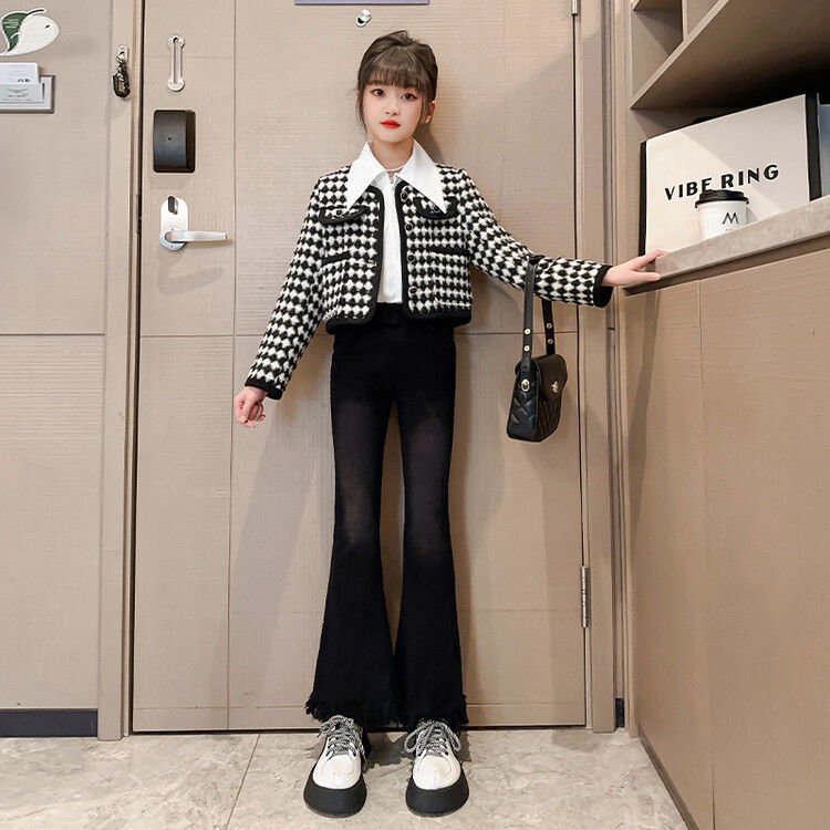 여성. 어린이 작은 향기로운 바람 코트 세트 봄과 가을 2025 새로운 누빔안감 houndstooth Zhongda. 어린이 코트스토어 가기