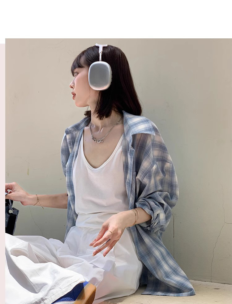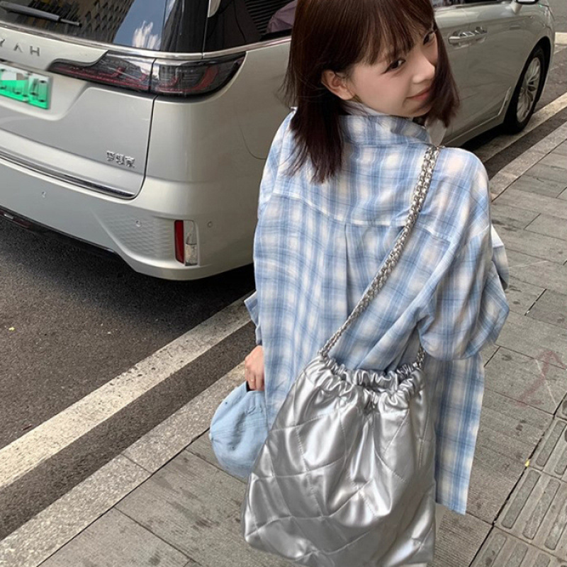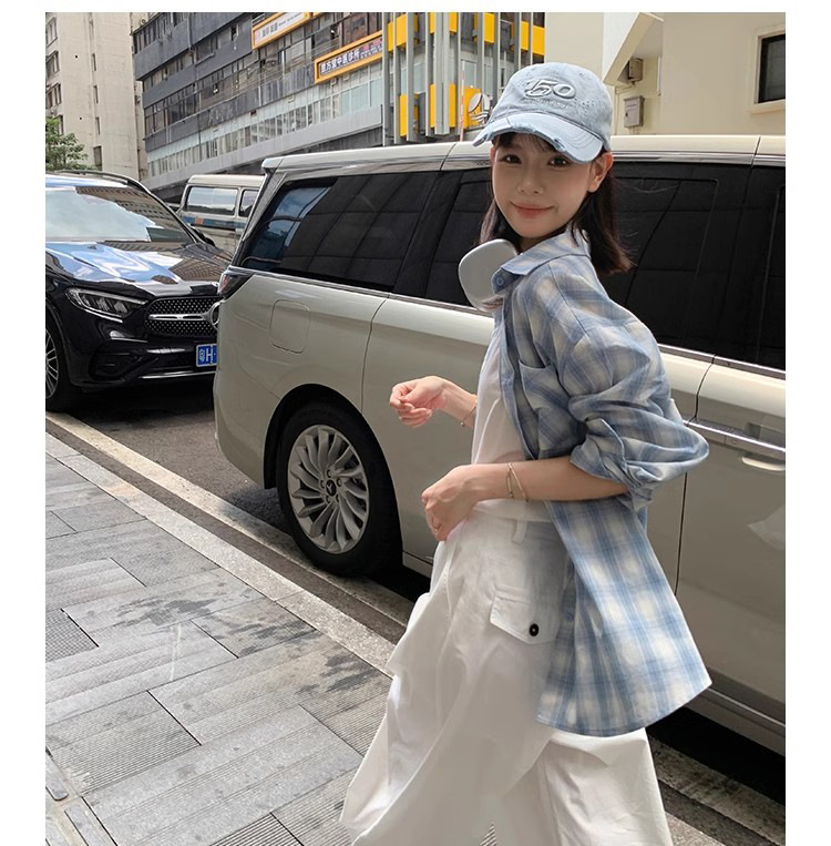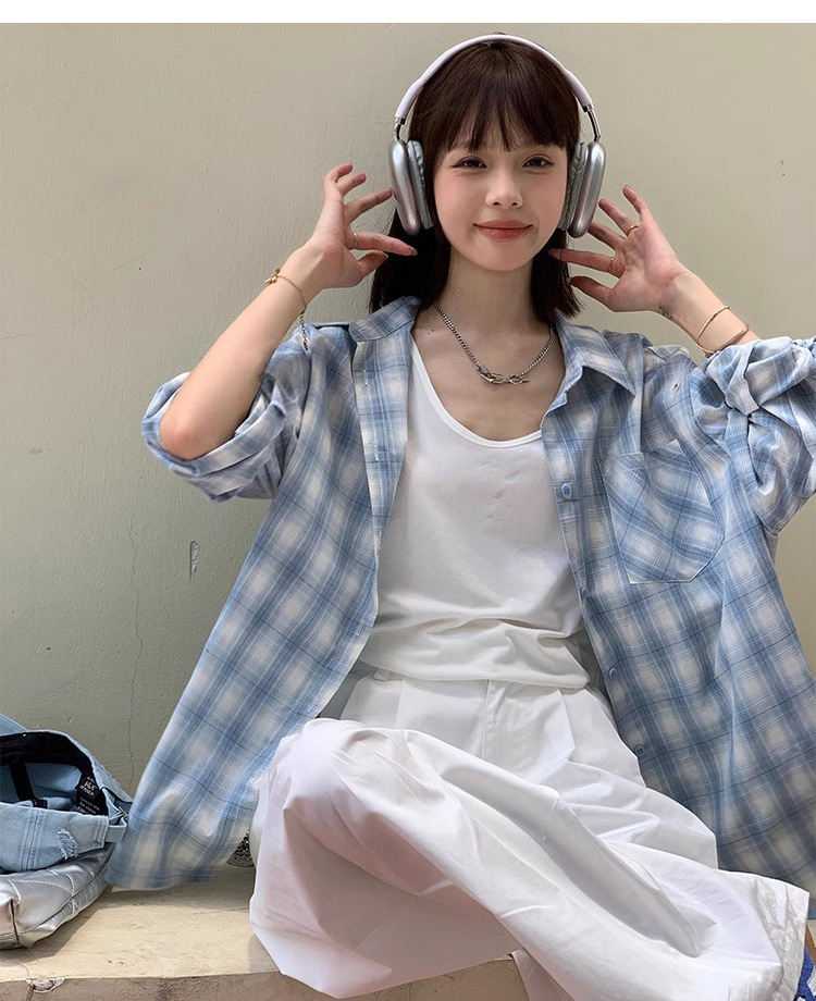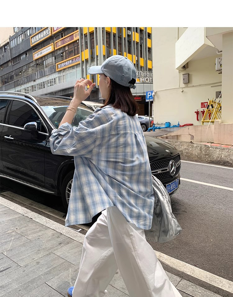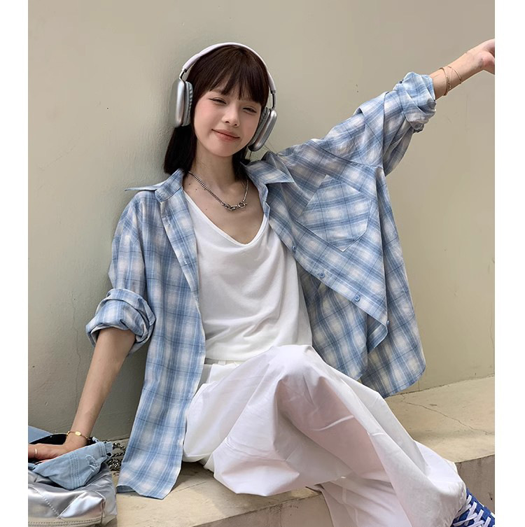 국경 새로운 블루 체크 무늬 셔츠 코트 여성의 봄과 가을 새로운 게으른 스타일 우아한 선 스크린 셔츠 코튼 탑스토어 가기