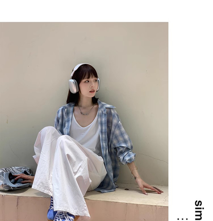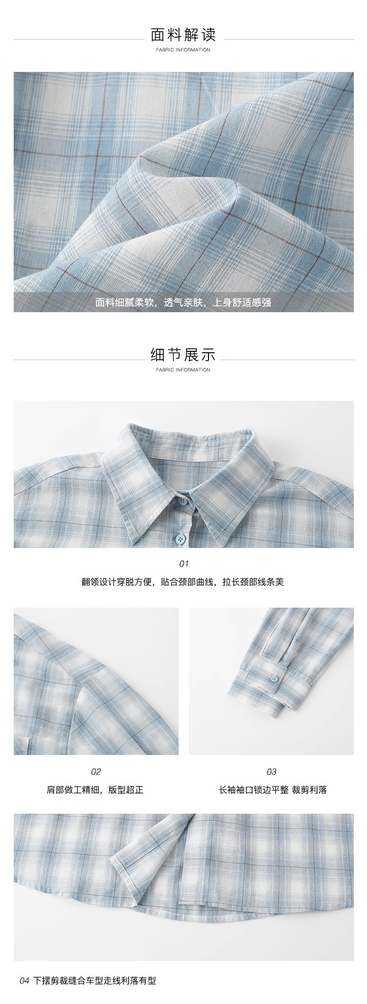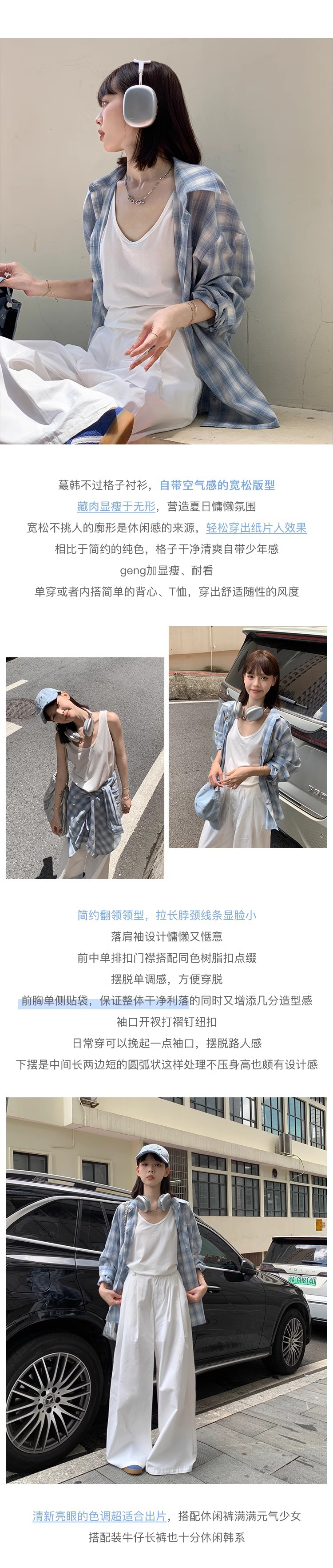 국경 새로운 블루 체크 무늬 셔츠 코트 여성의 봄과 가을 새로운 게으른 스타일 우아한 선 스크린 셔츠 코튼 탑