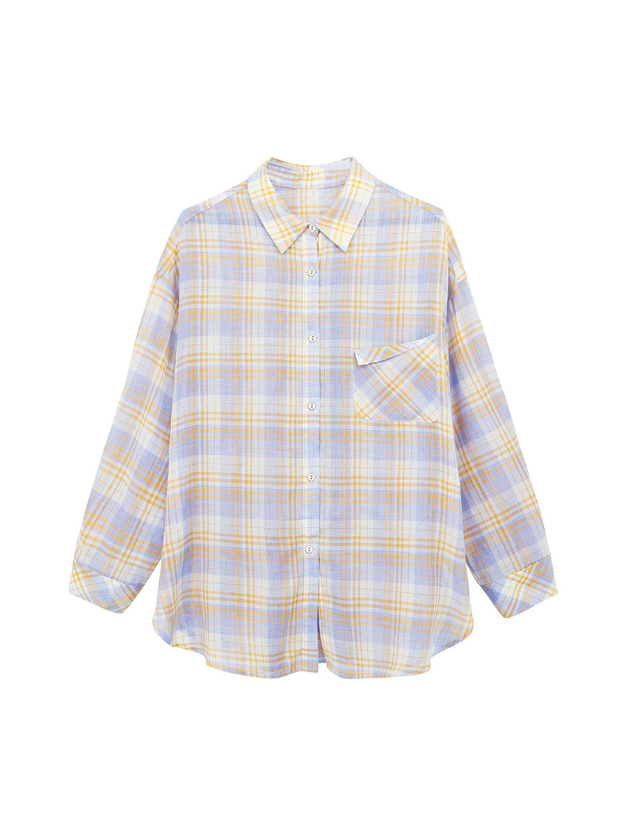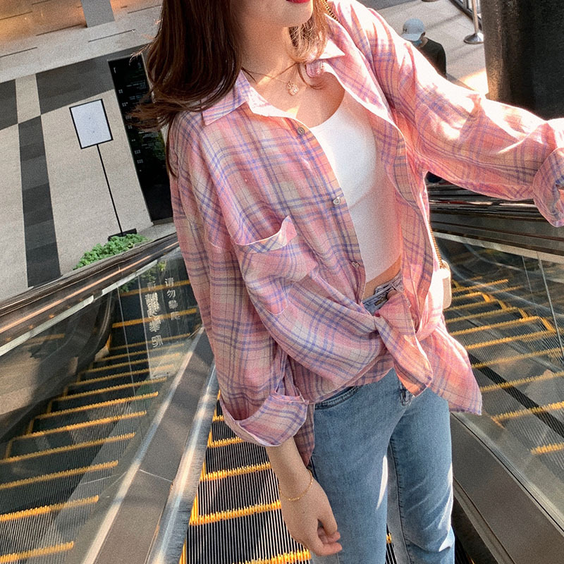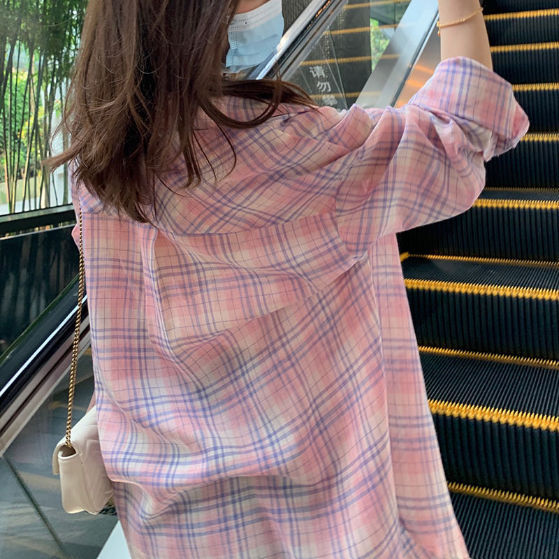 체크무늬 셔츠 재킷 여성 봄 여름 긴팔 상의 얇은 한국식 루즈한 자외선 차단 셔츠 서양식 셔츠 중간 길이