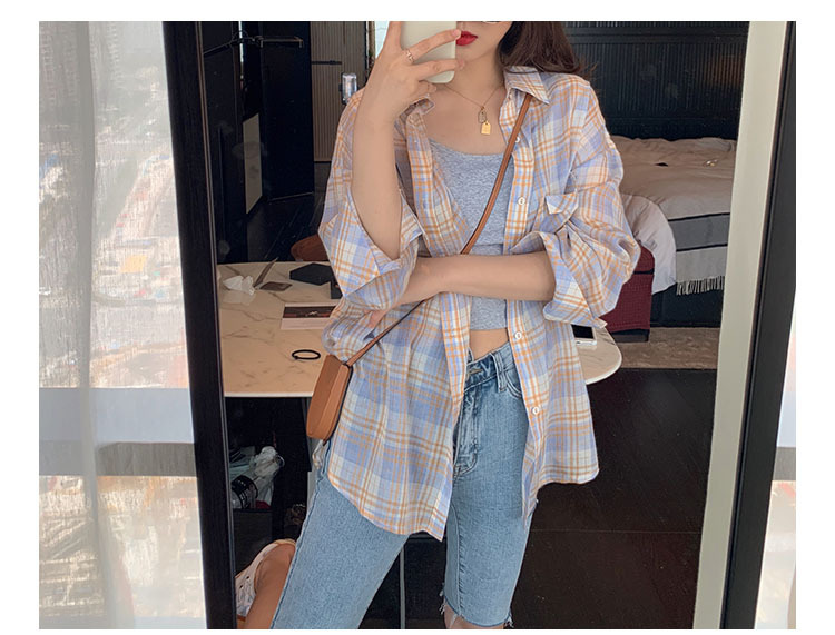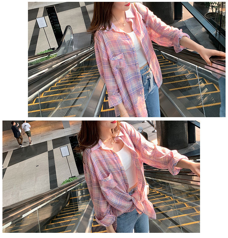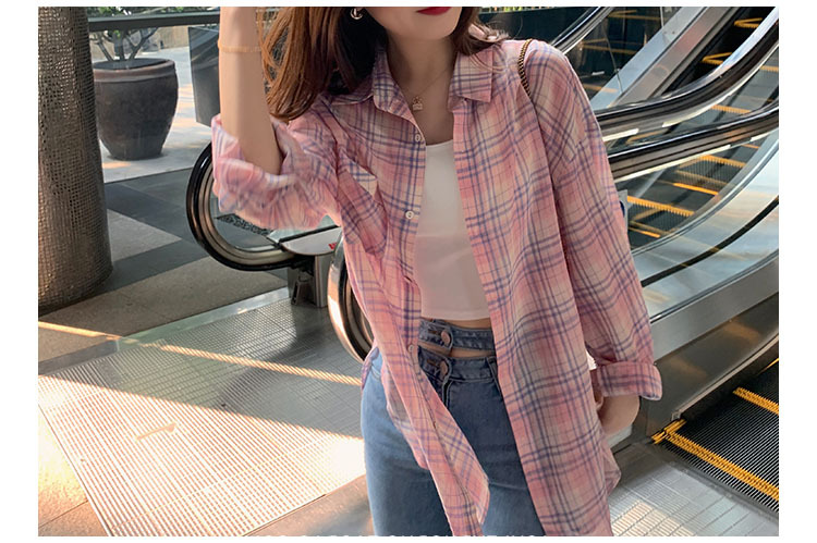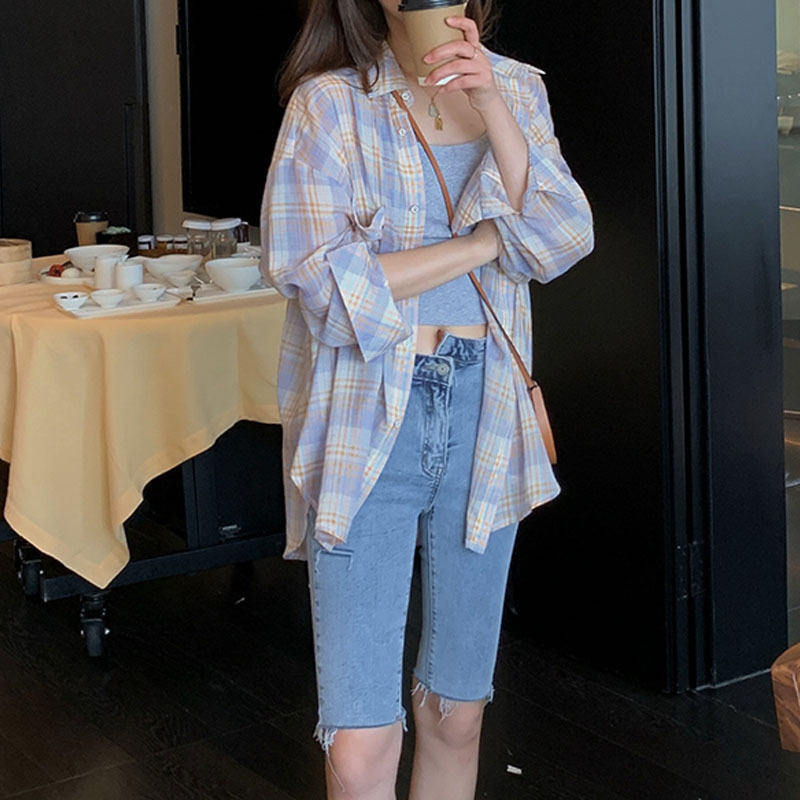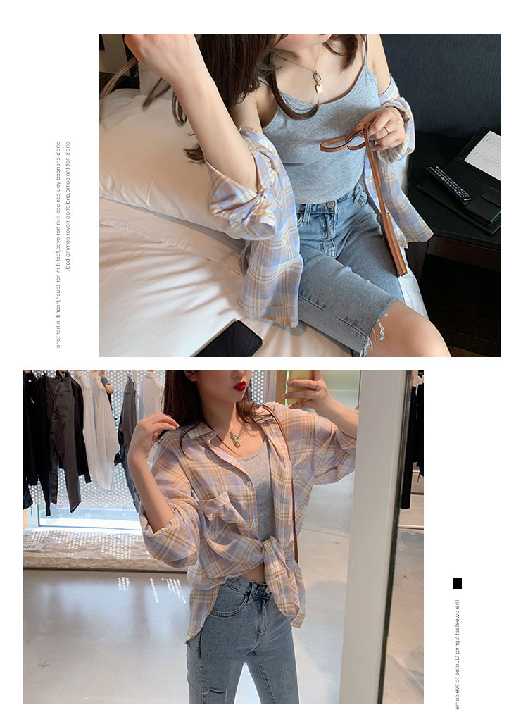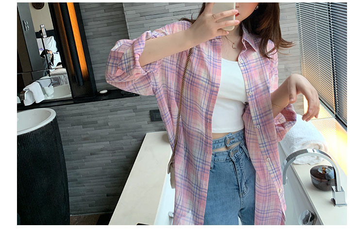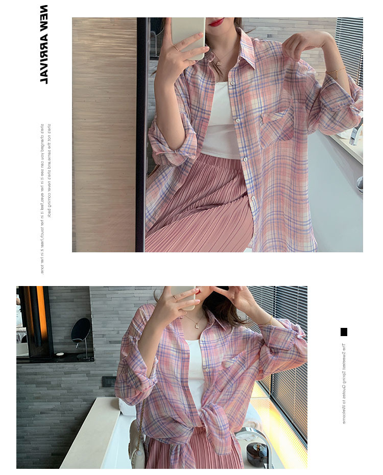 체크무늬 셔츠 재킷 여성 봄 여름 긴팔 상의 얇은 한국식 루즈한 자외선 차단 셔츠 서양식 셔츠 중간 길이스토어 가기