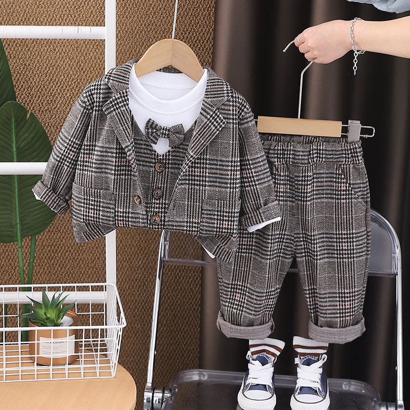 어린 소년 잘 생긴 체크 무늬 세트 양복 조끼 3 피스 세트 2025 봄과 가을 새로운 소년 패션 신사 가을 세트
