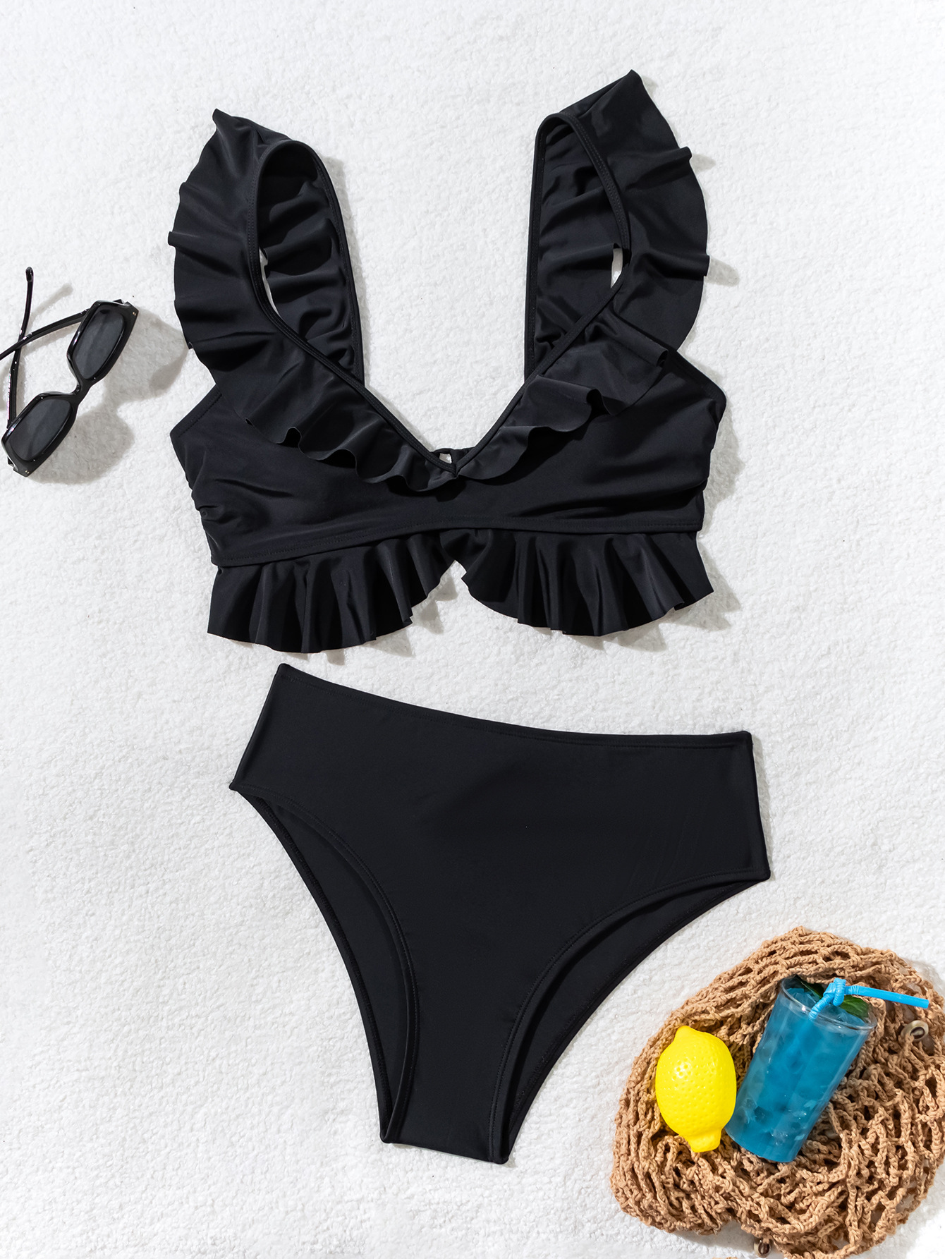 2025 유럽과 미국의 국경 간 새로운 여성 솔리드 컬러 프릴 서스펜더 레이스 업 비키니 투피스 수영복 도매스토어 가기