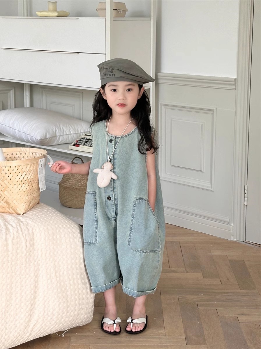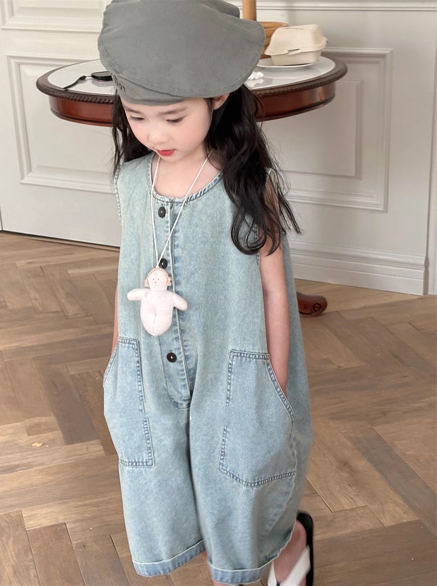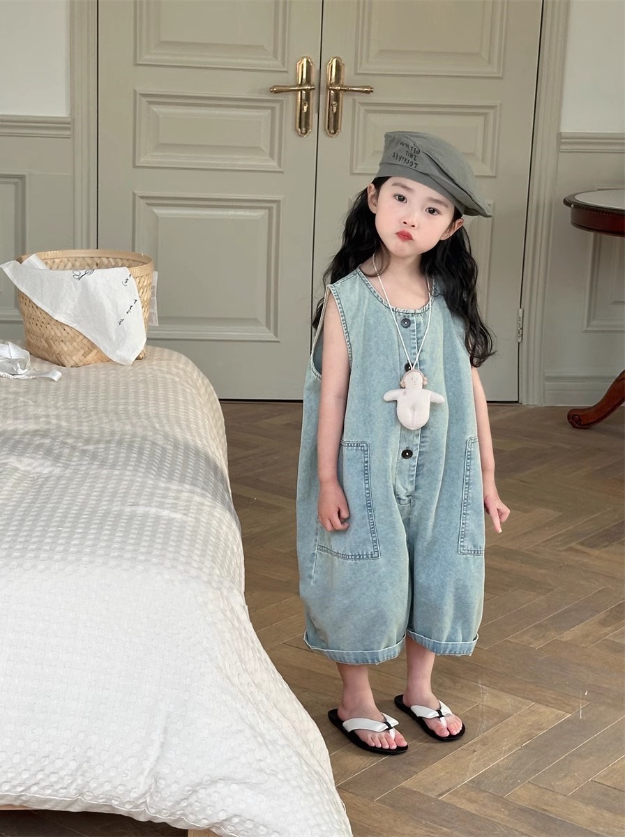 2025 여름 소녀 데님 귀여운 점프 슈트 한국 복고풍 스타일 귀여운 아기 패션 표준 매칭