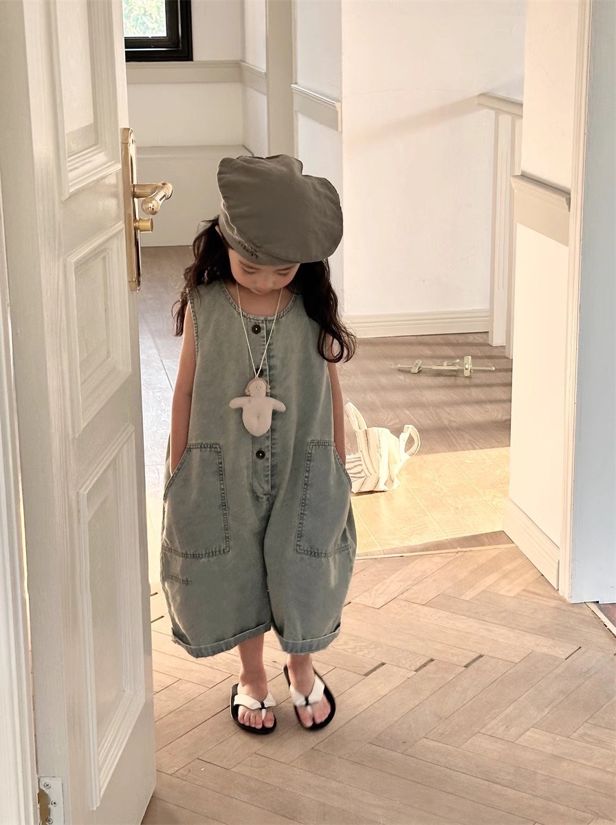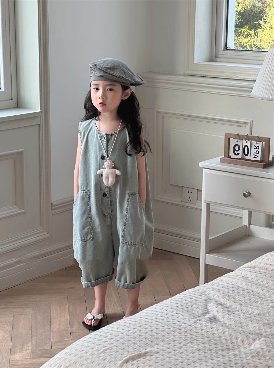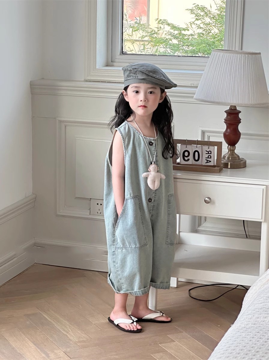 2025 여름 소녀 데님 귀여운 점프 슈트 한국 복고풍 스타일 귀여운 아기 패션 표준 매칭