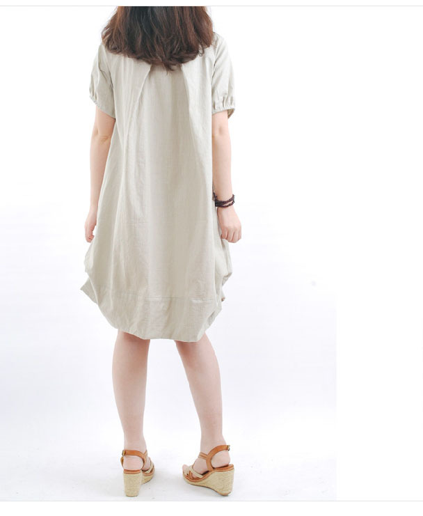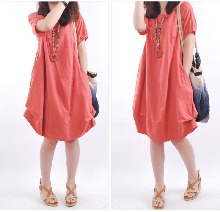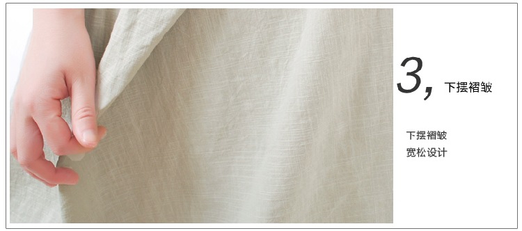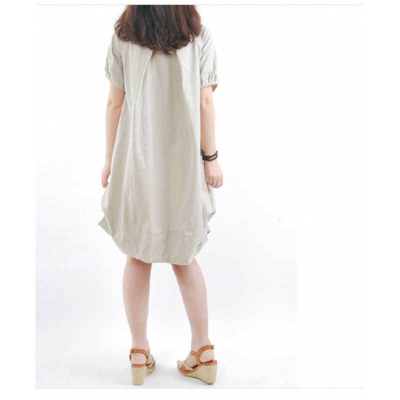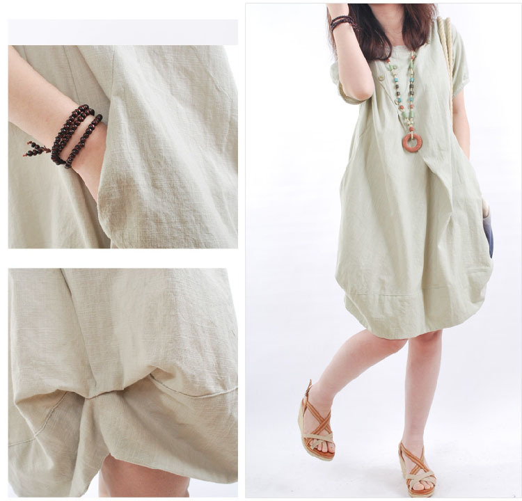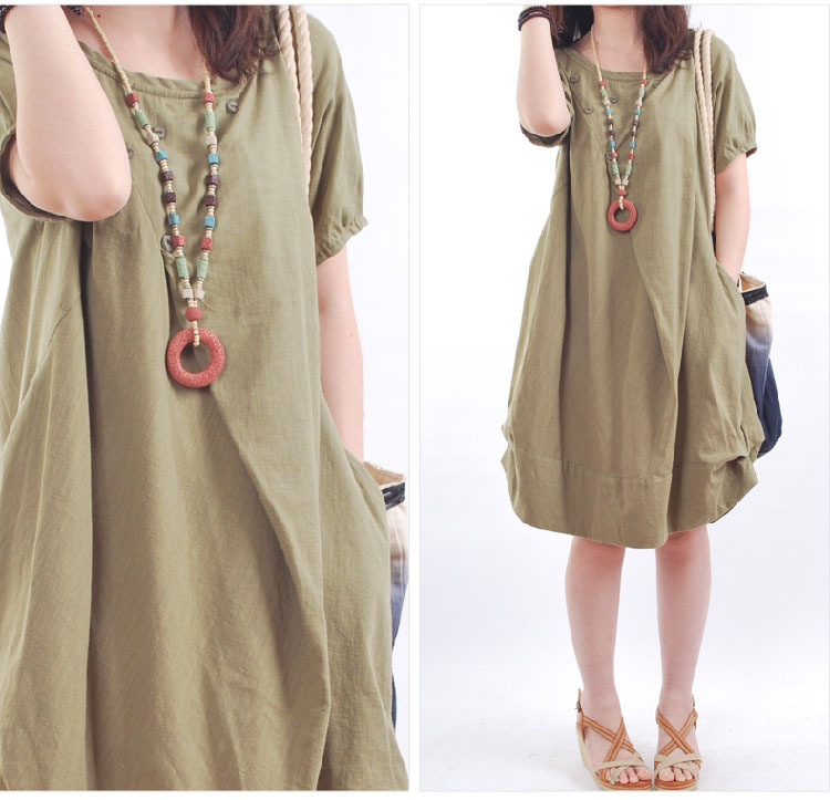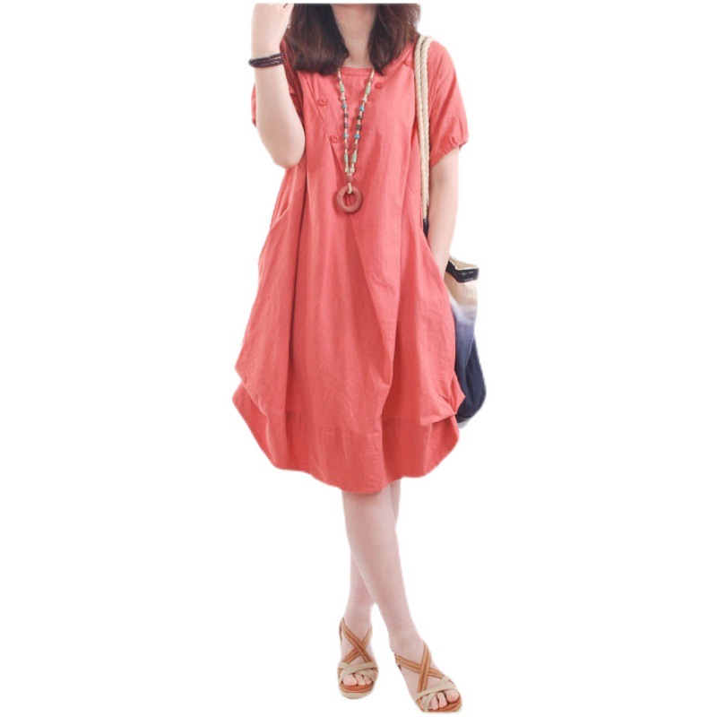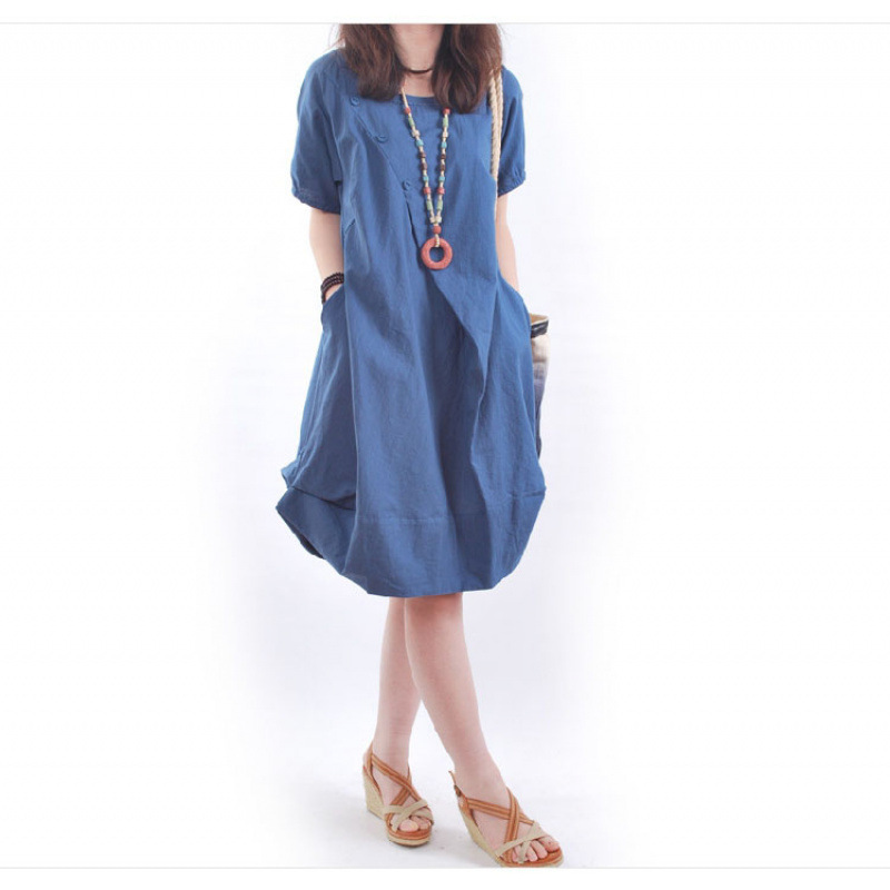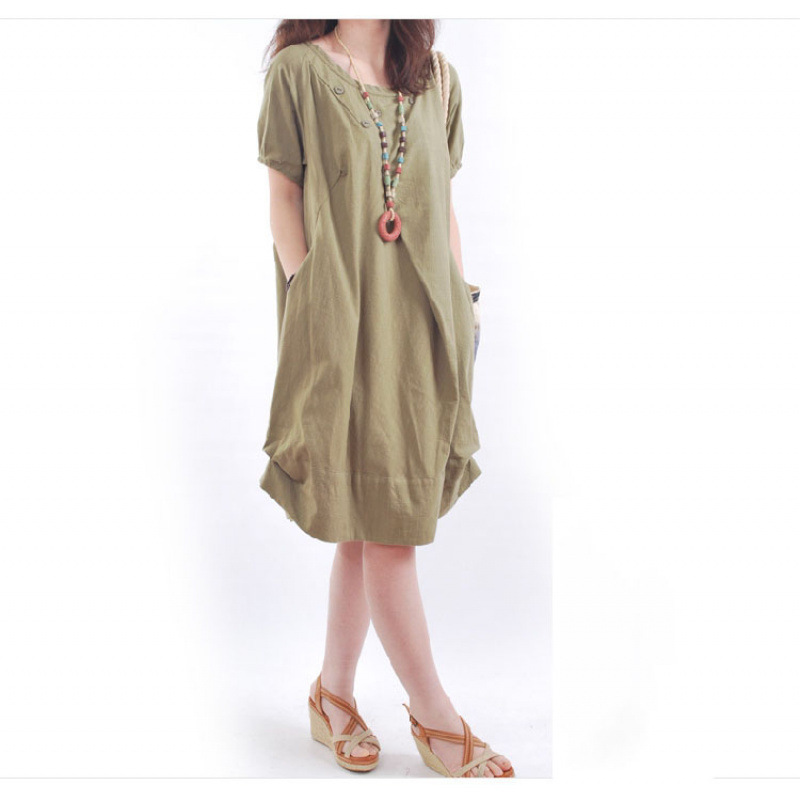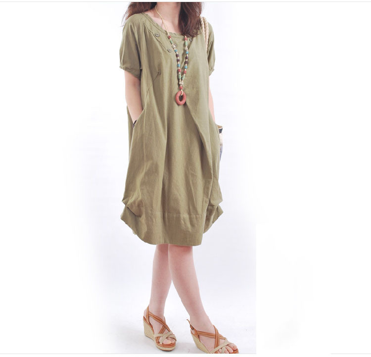 대외 무역 국경 단색 면화 및 리넨 스커트 중간 길이 2025 여름 느슨한 플러스 사이즈 주름진 A 자형 원피스 짧은 소매스토어 가기