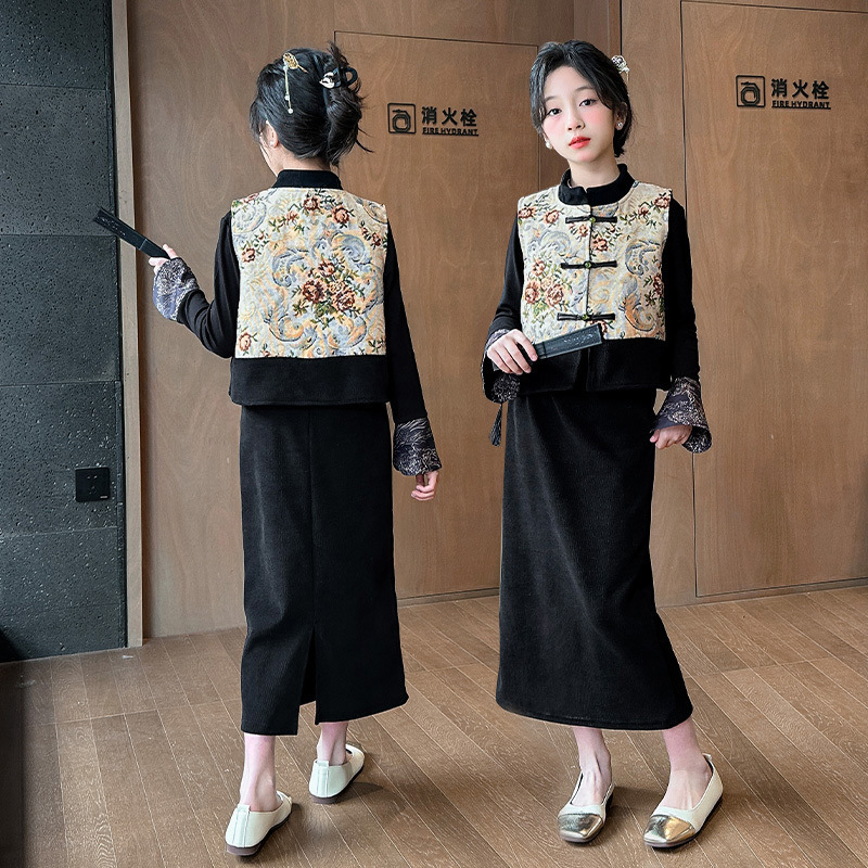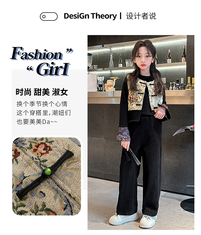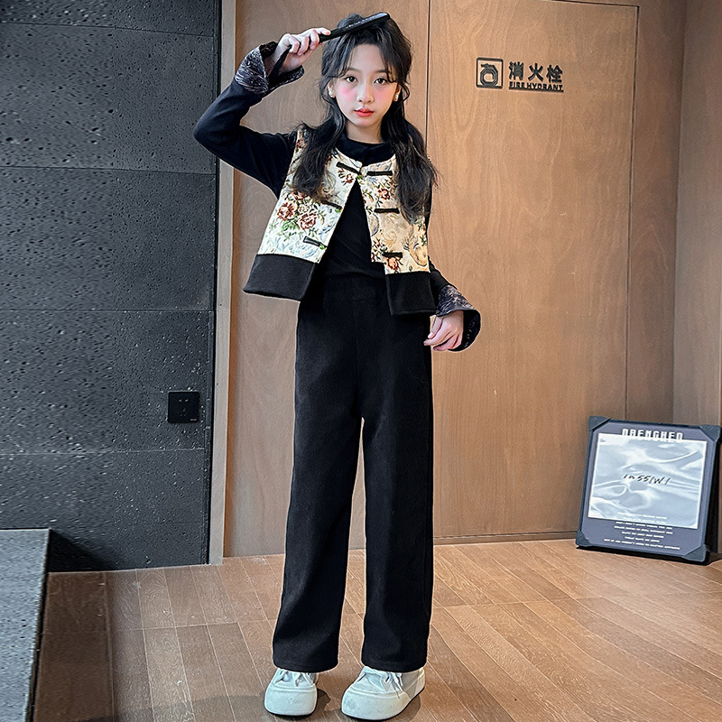 소녀의 봄 원피스 세트 2024 새로운 스타일 서양식 중국 스타일 어린이 봄 유행 조끼 넓은 다리 바지 3 조각 세트 패션스토어 가기