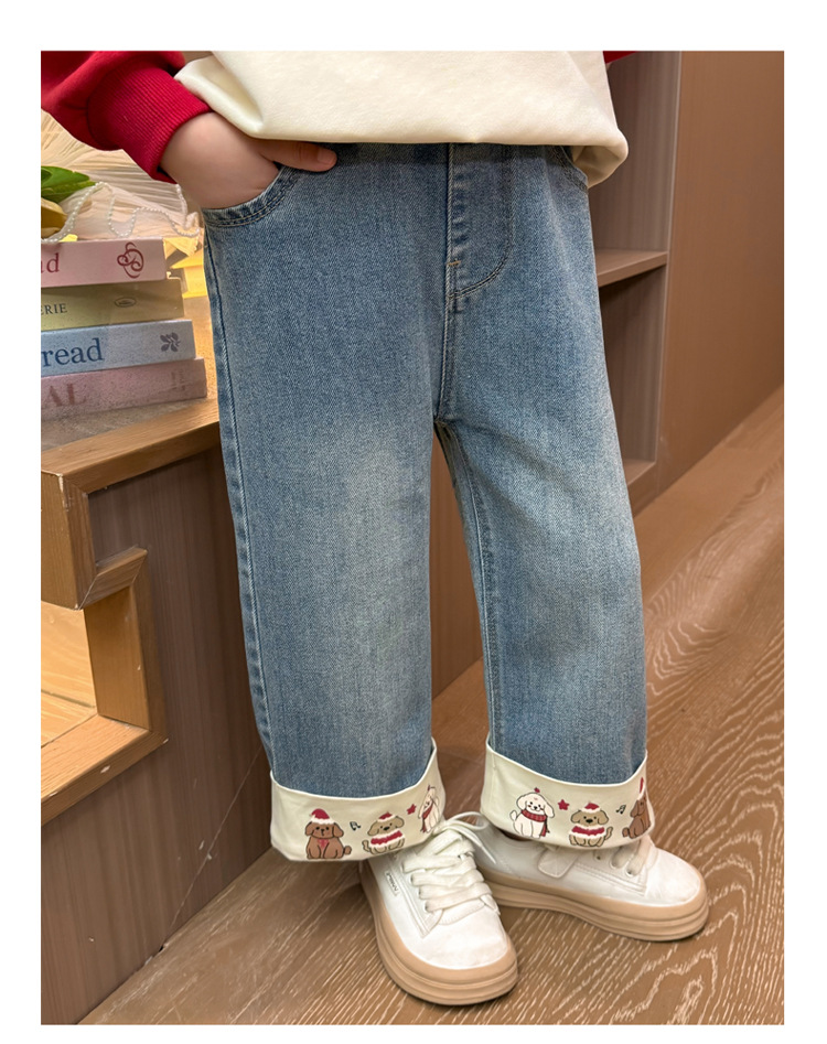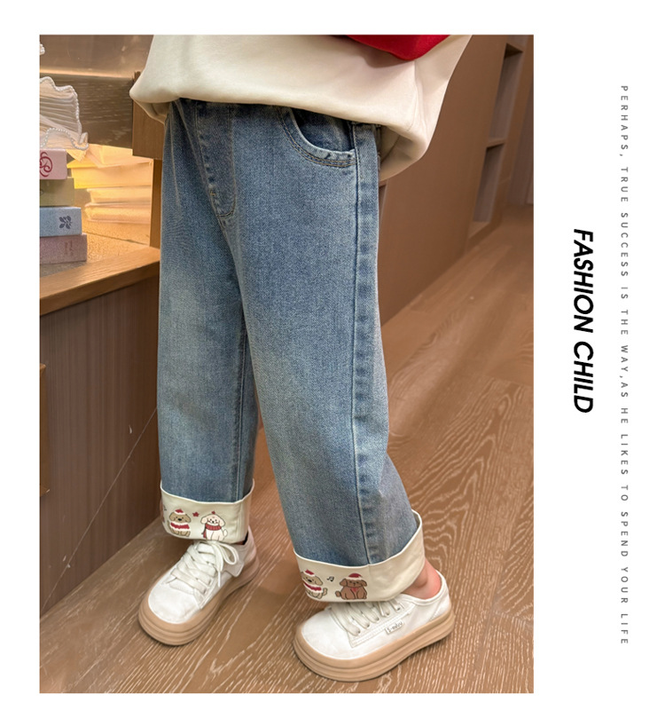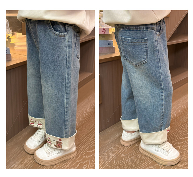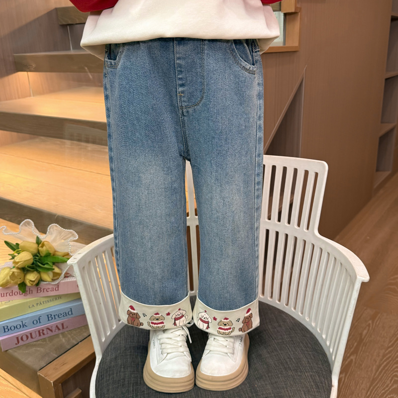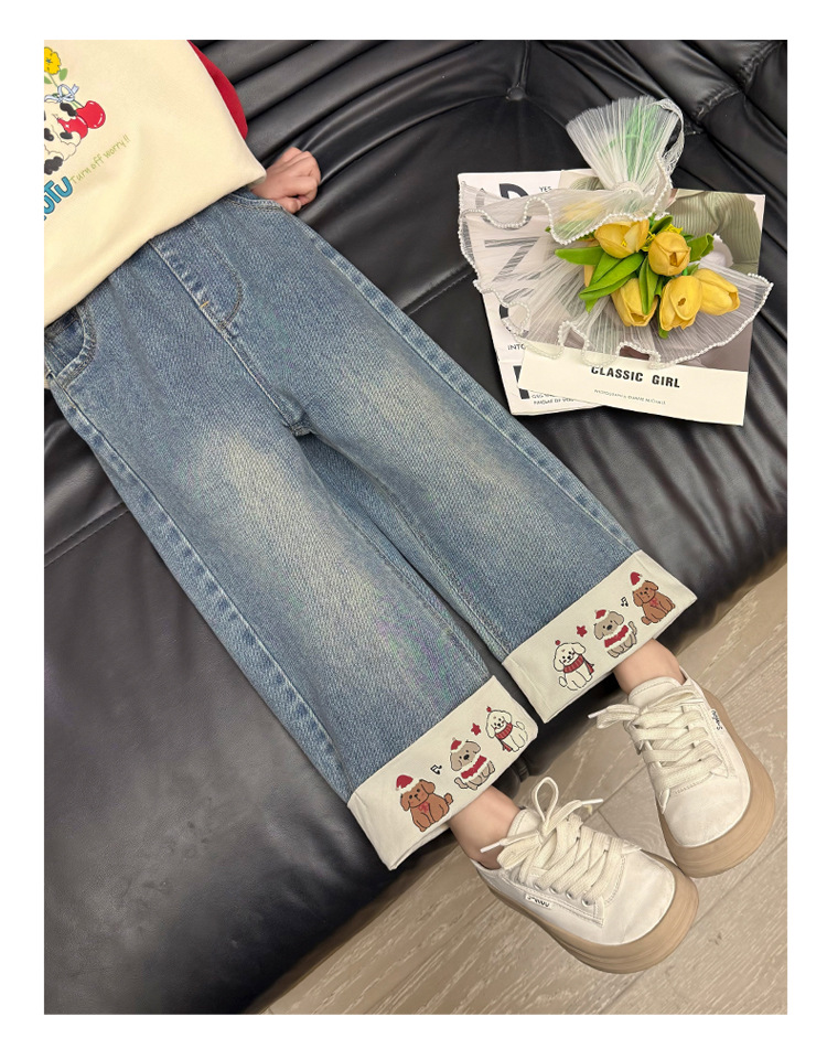 소녀의 만화 강아지 청바지 봄과 가을 2025 새로운 스타일 어린 소녀의 스트레이트-다리 바지 아이들의 넓은 다리 바지