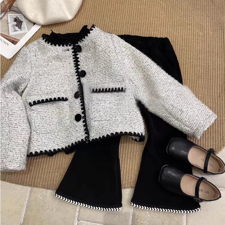 소녀 세트 2024 가을 한국 소녀 샤넬 스타일 스웨터 코트 아기 소녀 캐주얼 플래 바지