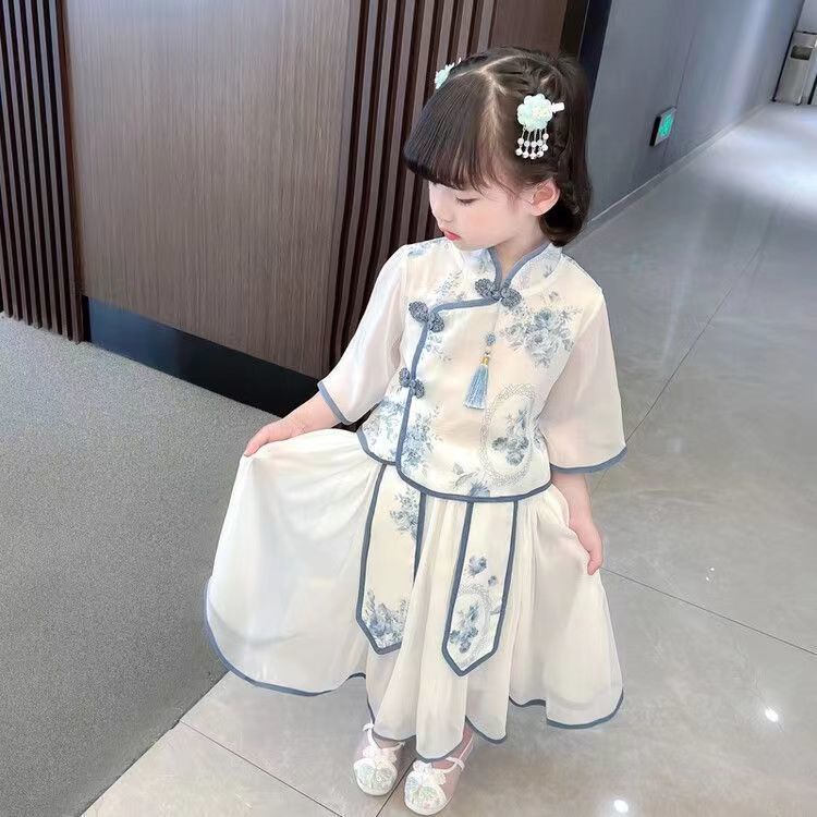 한푸 소녀의 중국 스타일 탕 세트 어린이 공주 원피스 세트 여름 고대 세트 국가 스타일 원피스 얇은 봄 스타일 원피스