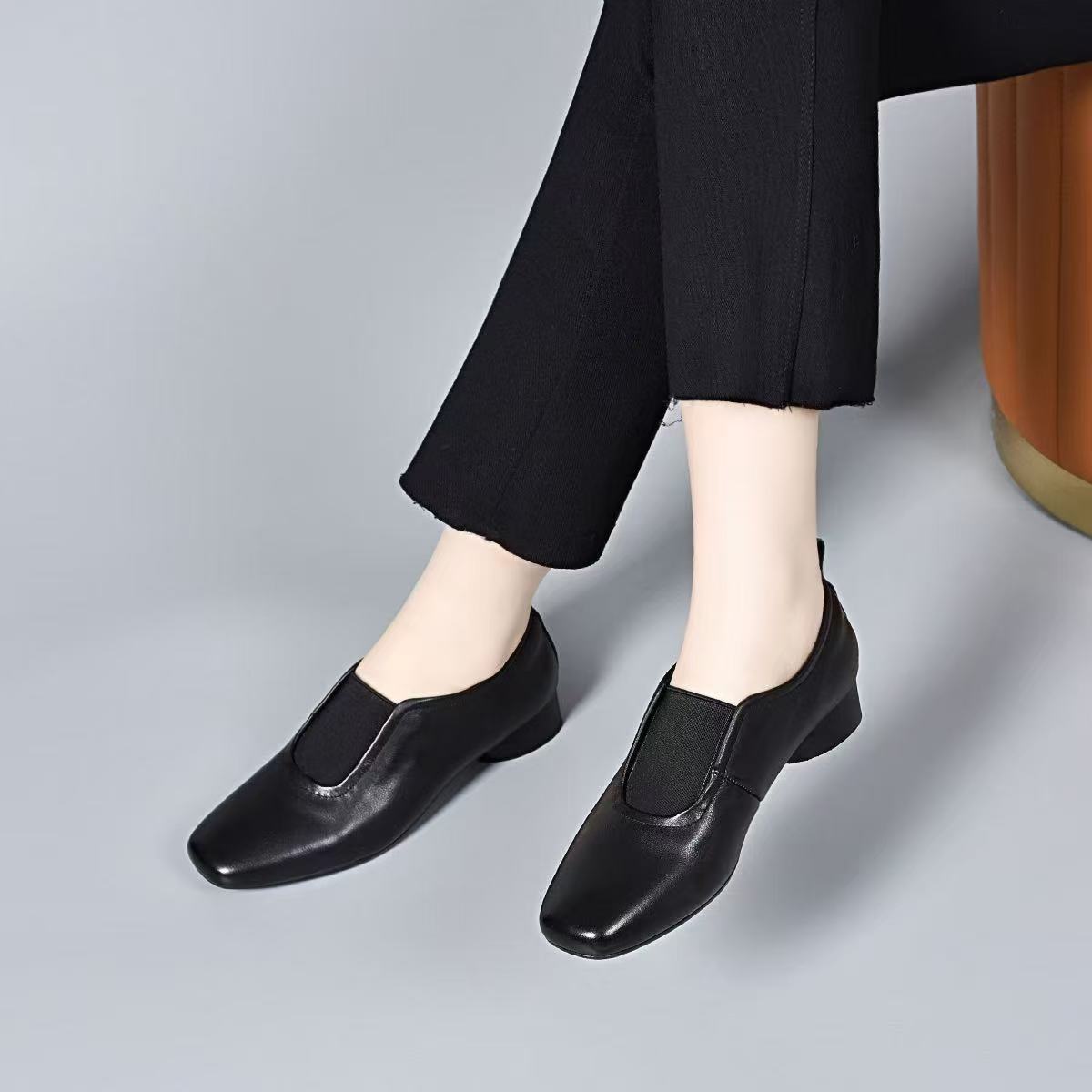 사각 발가락 신발 여성 신발 2025 봄 영국식 탄성 밴드 1 피트 로우 힐 여성 신발 간단한 기질 깊은 입 신발스토어 가기