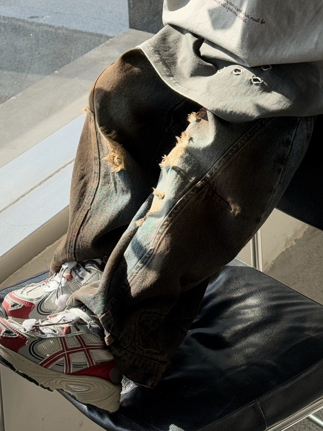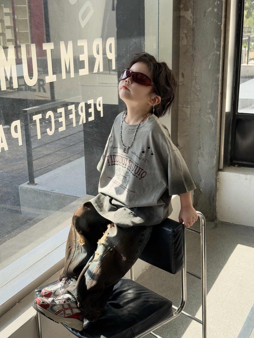 American Retro Boy의 Old Ripped Jeans Boys Mid-Waist Loose dipped Straight Scimitar Pants High Street Design