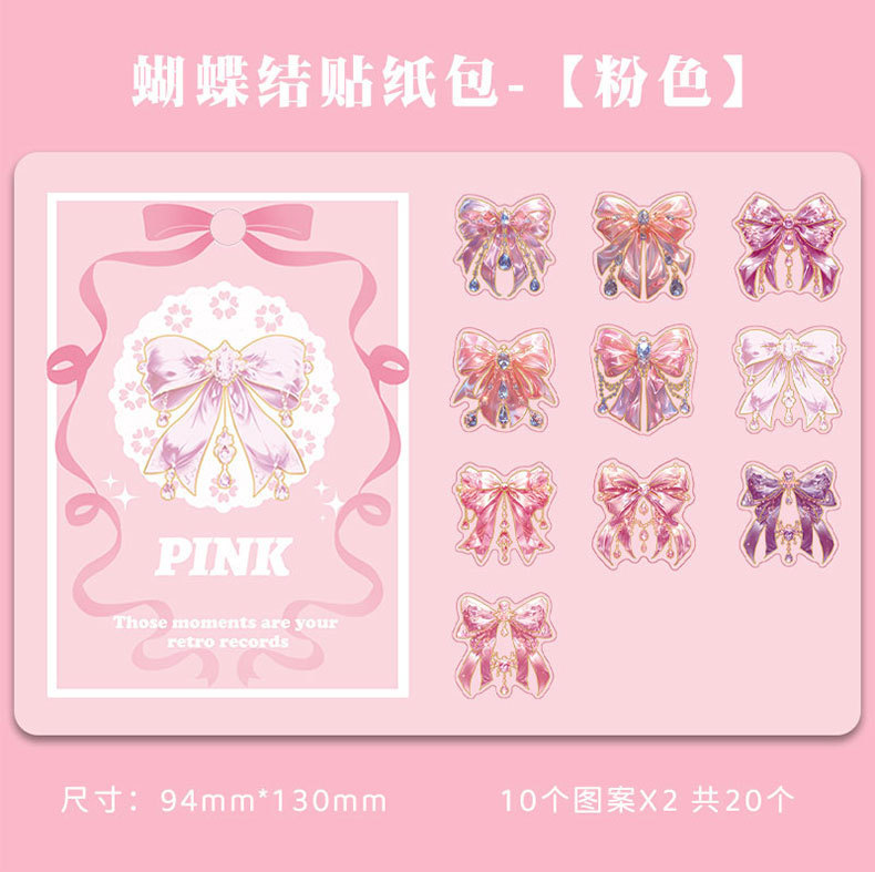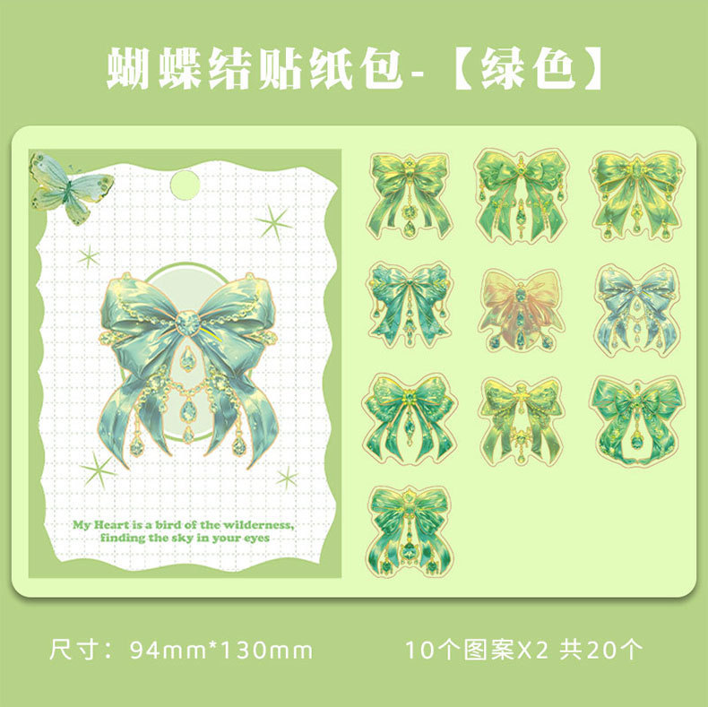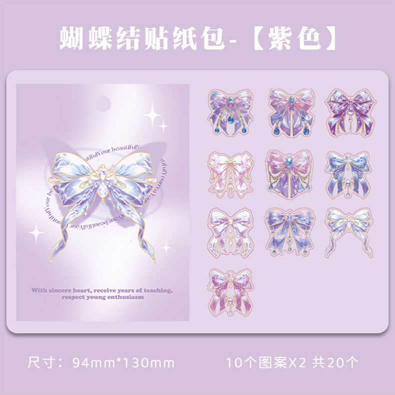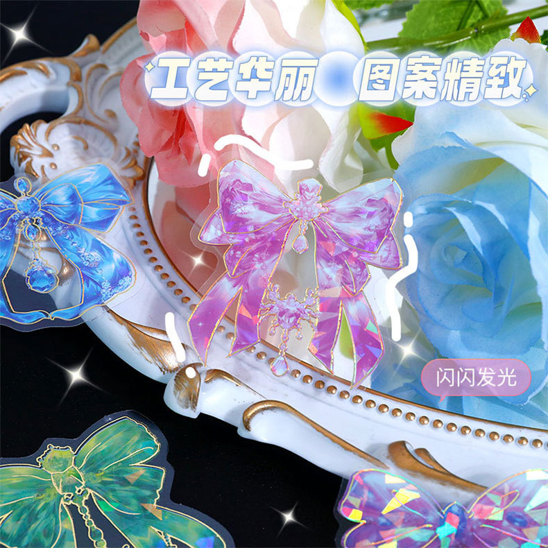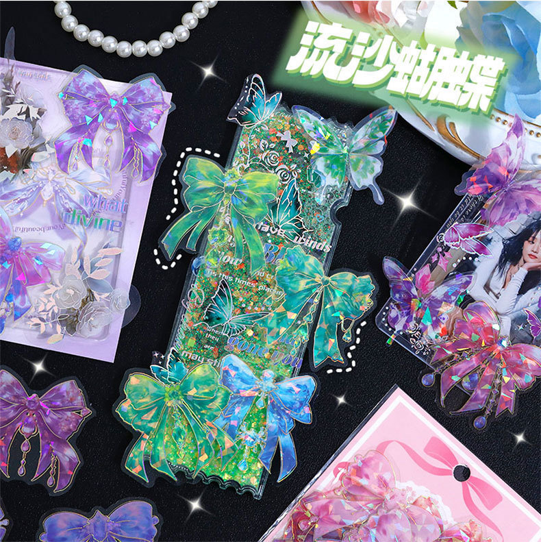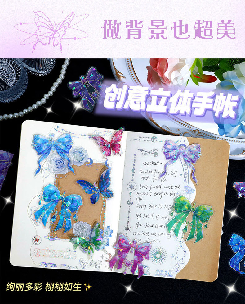 跨境炫彩蝴蝶结贴纸创意镭射PET贴画立体咕卡流麻手帐DIY装饰粘贴