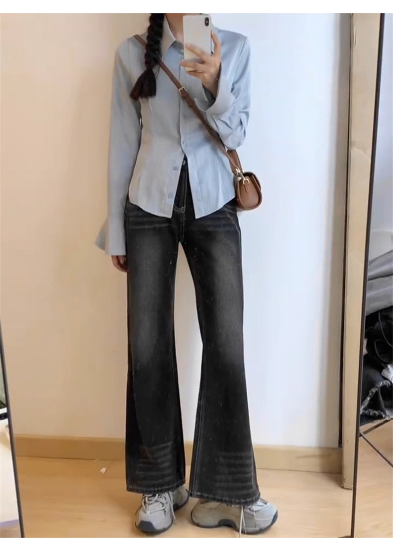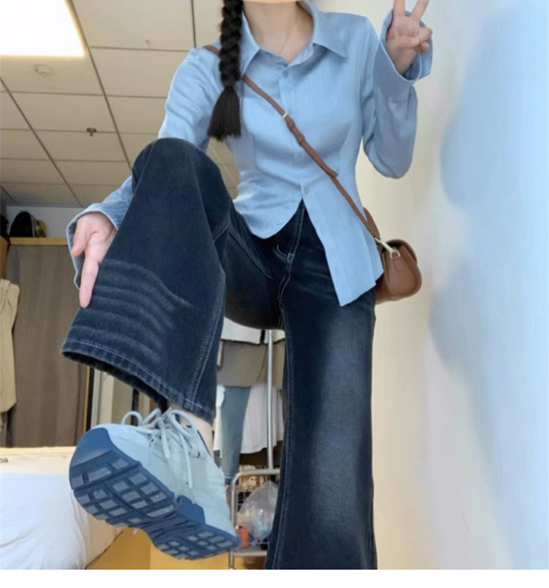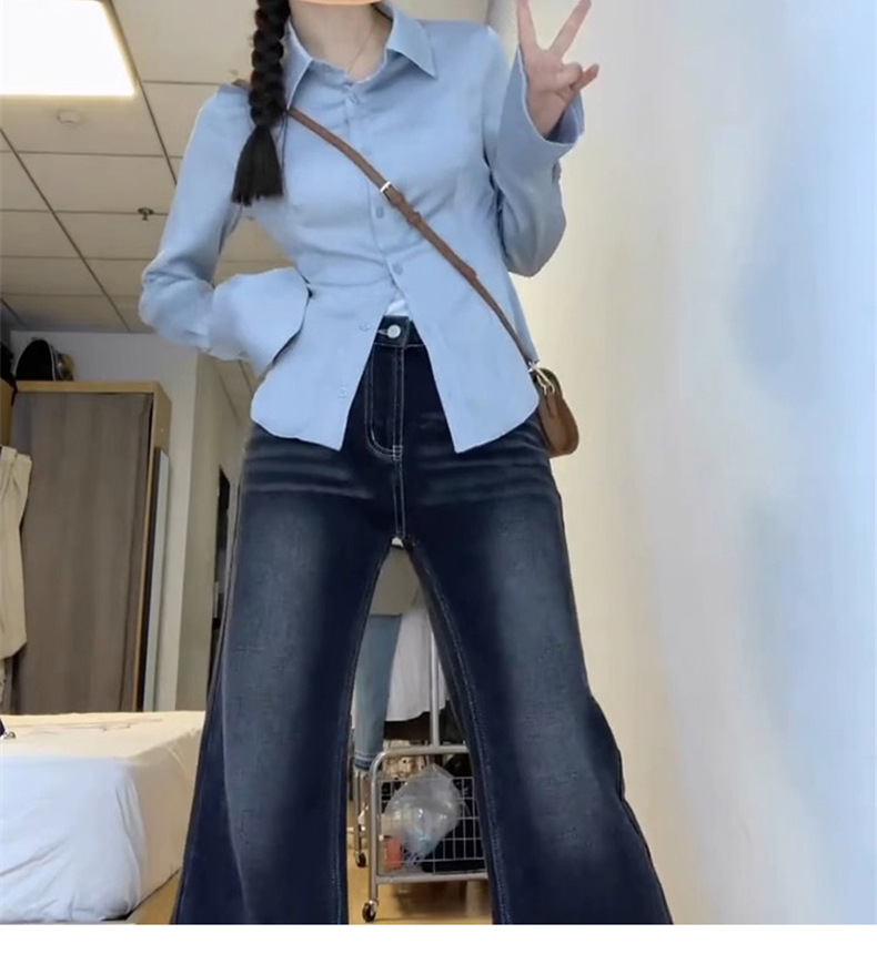 蓝色条纹女士衬衫上衣2024早秋新款修身显瘦收腰内搭长袖衬衣宽松스토어 가기