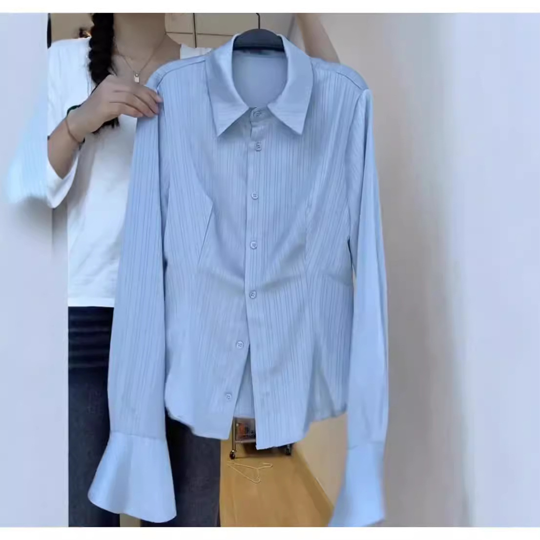 蓝色条纹女士衬衫上衣2024早秋新款修身显瘦收腰内搭长袖衬衣宽松