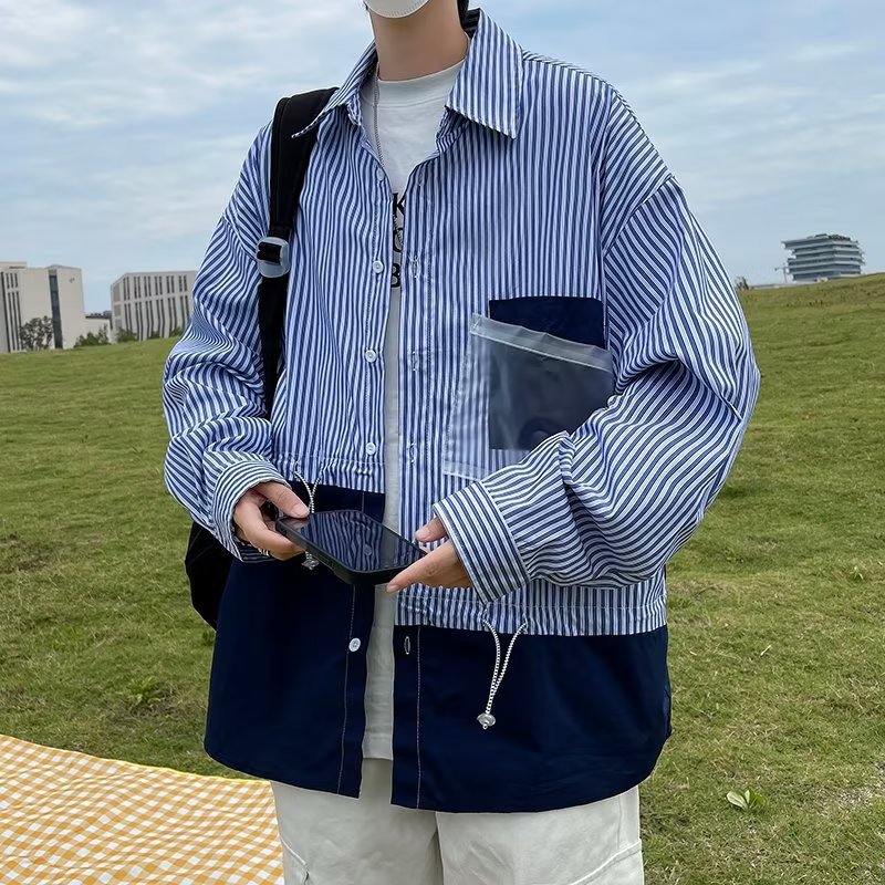 십대 봄 새로운 도착 줄무늬 셔츠 남자 홍콩 스타일 트렌디 한 색상 매칭 긴팔 재킷 유행 캐주얼 베이스 셔츠스토어 가기