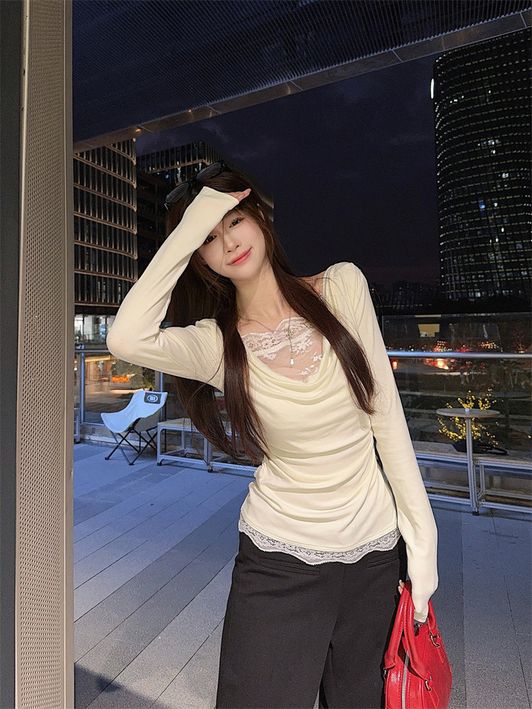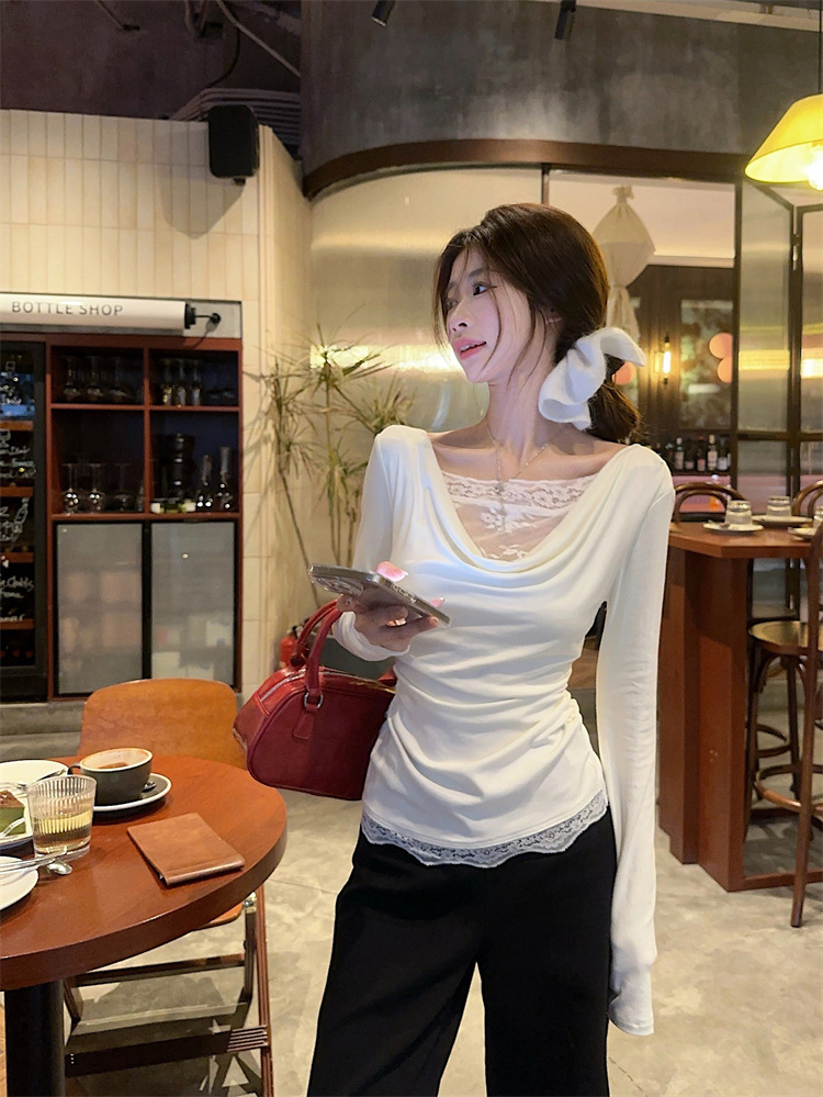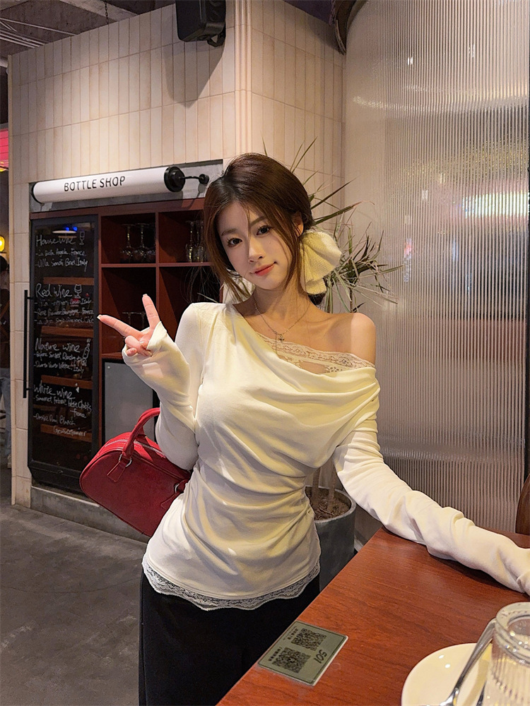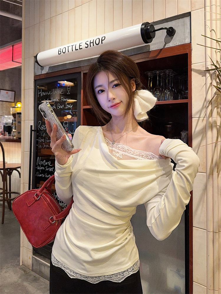 순수한 욕망 스타일 틈새 레이스 스티칭 슬리밍 긴팔 티셔츠 여성용 봄 디자인 센스 샌딩 숄더 핫 걸 탑