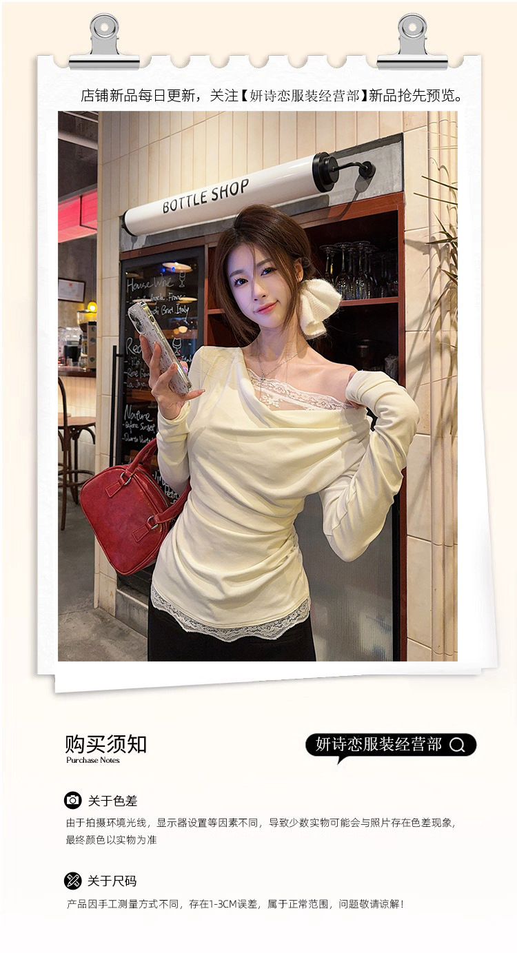 순수한 욕망 스타일 틈새 레이스 스티칭 슬리밍 긴팔 티셔츠 여성용 봄 디자인 센스 샌딩 숄더 핫 걸 탑스토어 가기