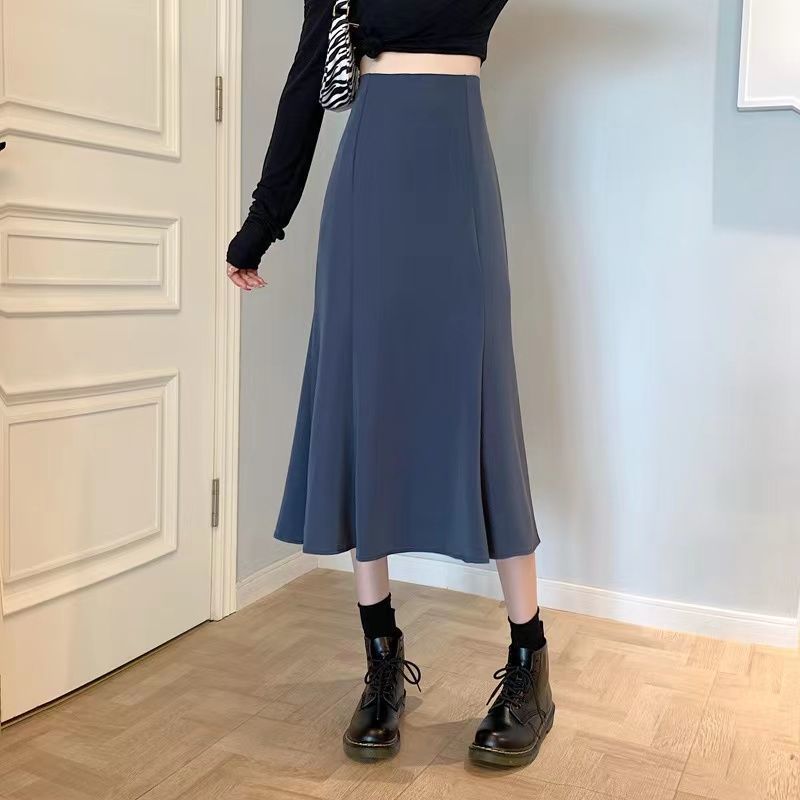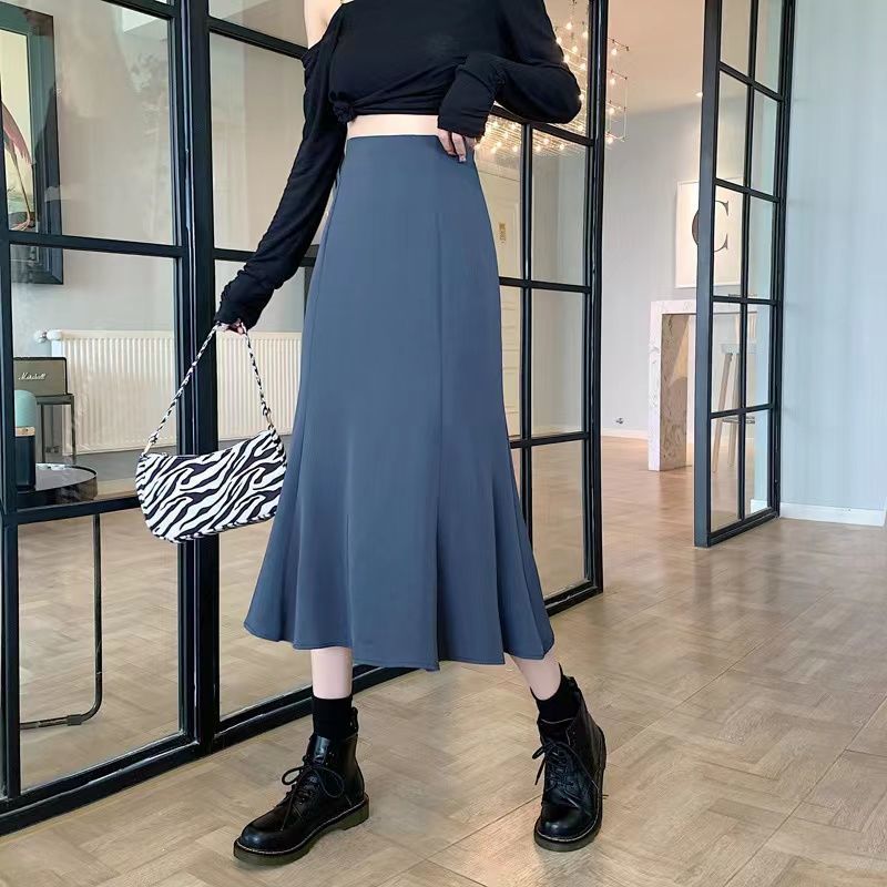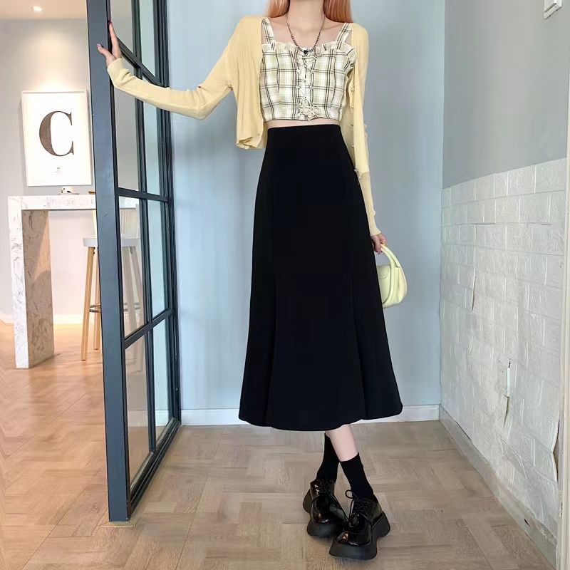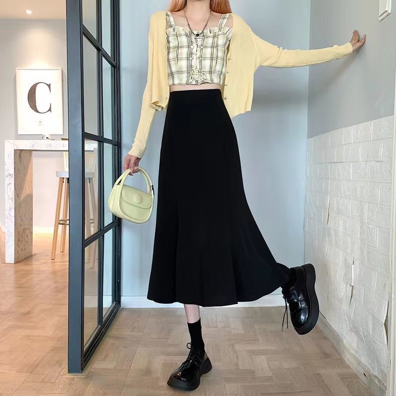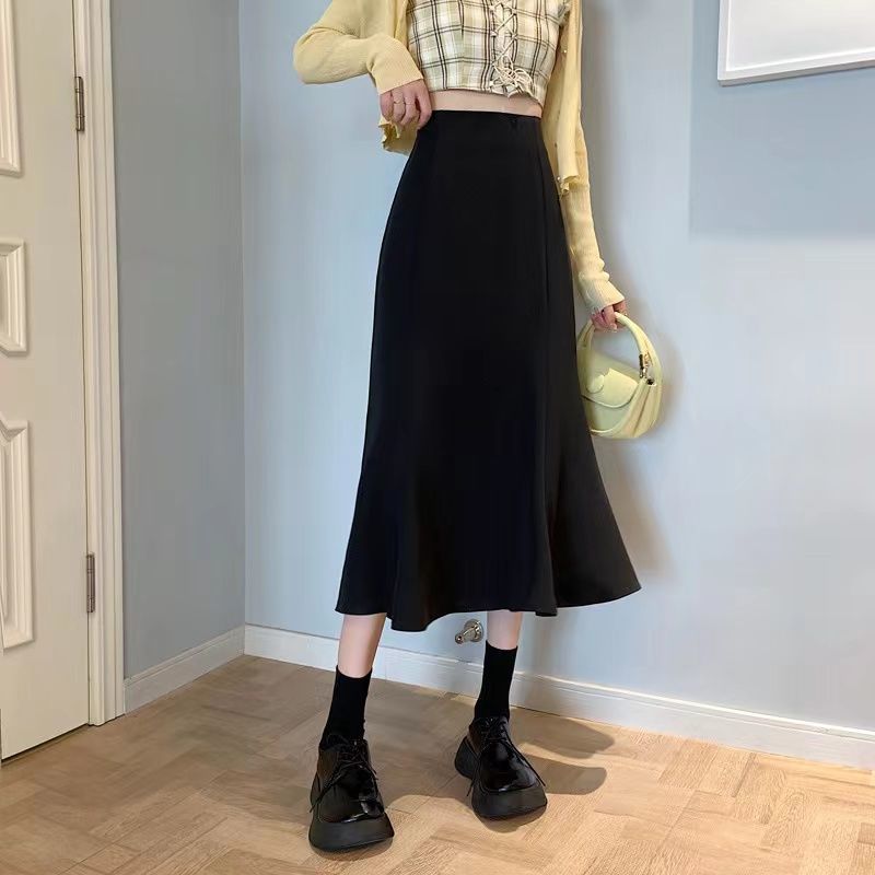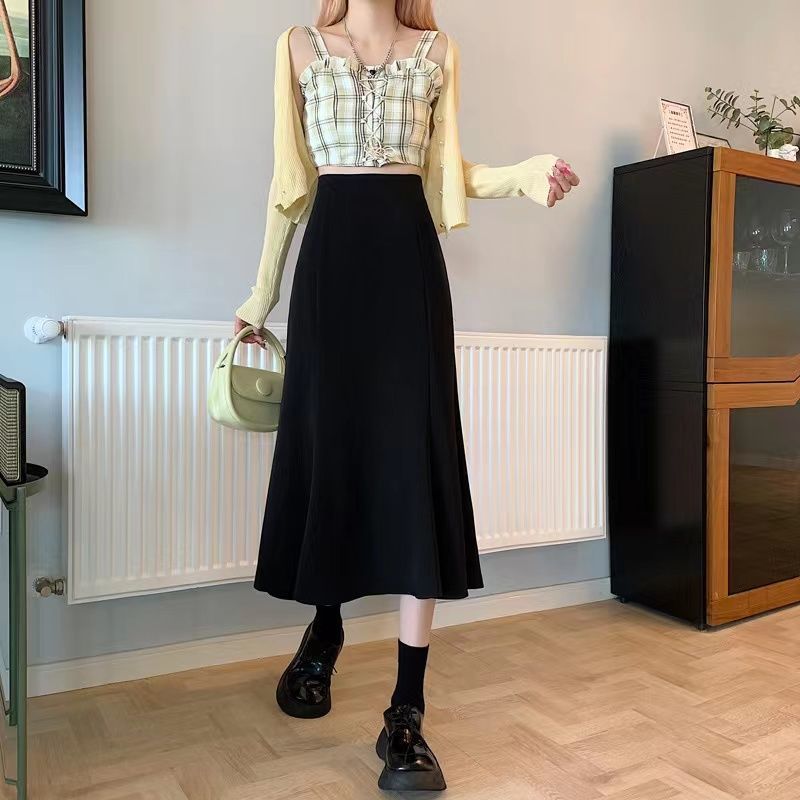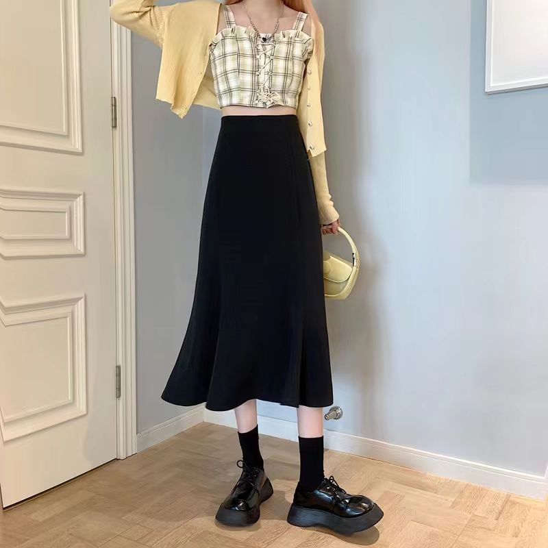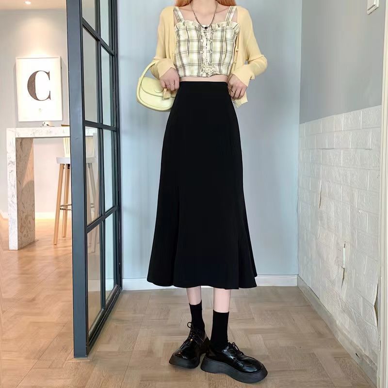 검은 세트 치마 여성의 봄 새로운 높은 허리 엉덩이 커버 슬림 A 라인 엉덩이 피쉬 스커트 중간 길이 스커트