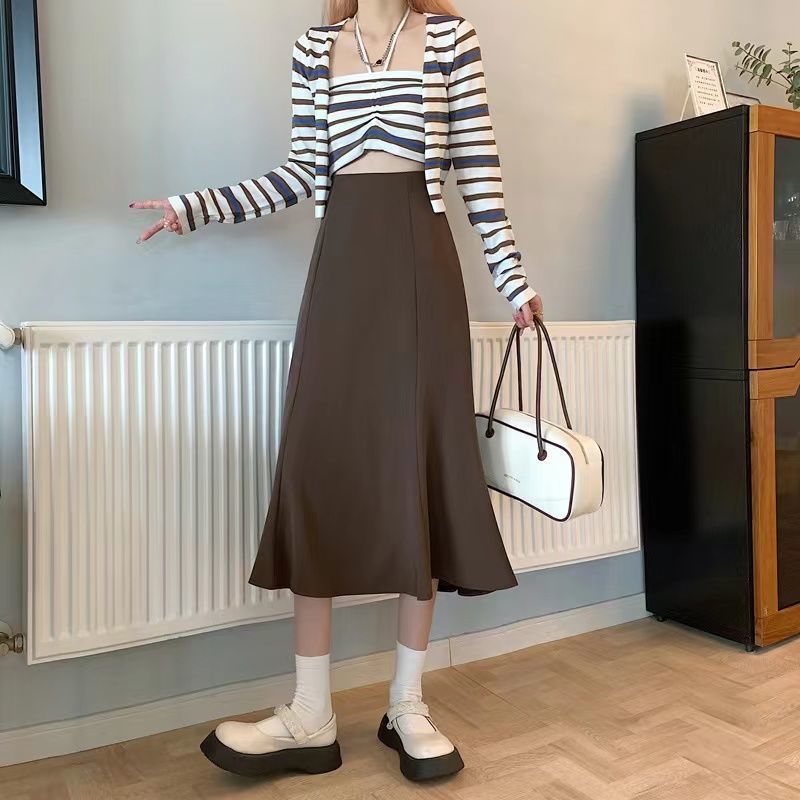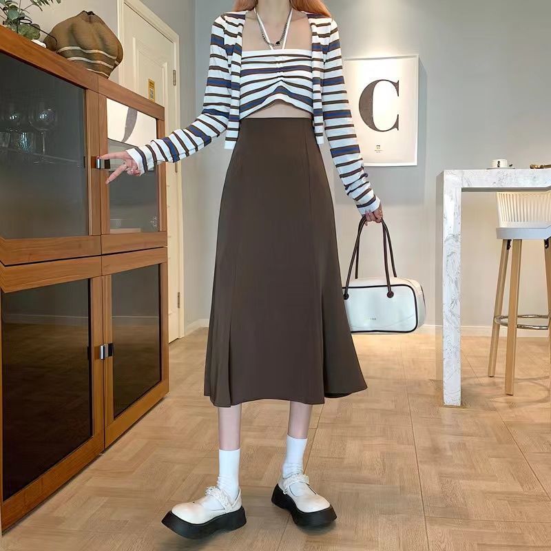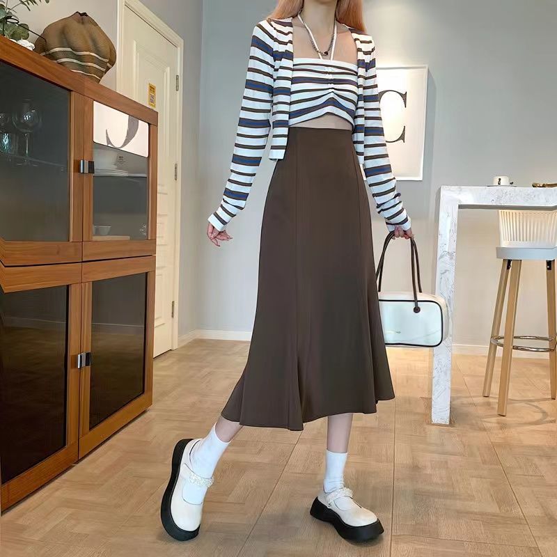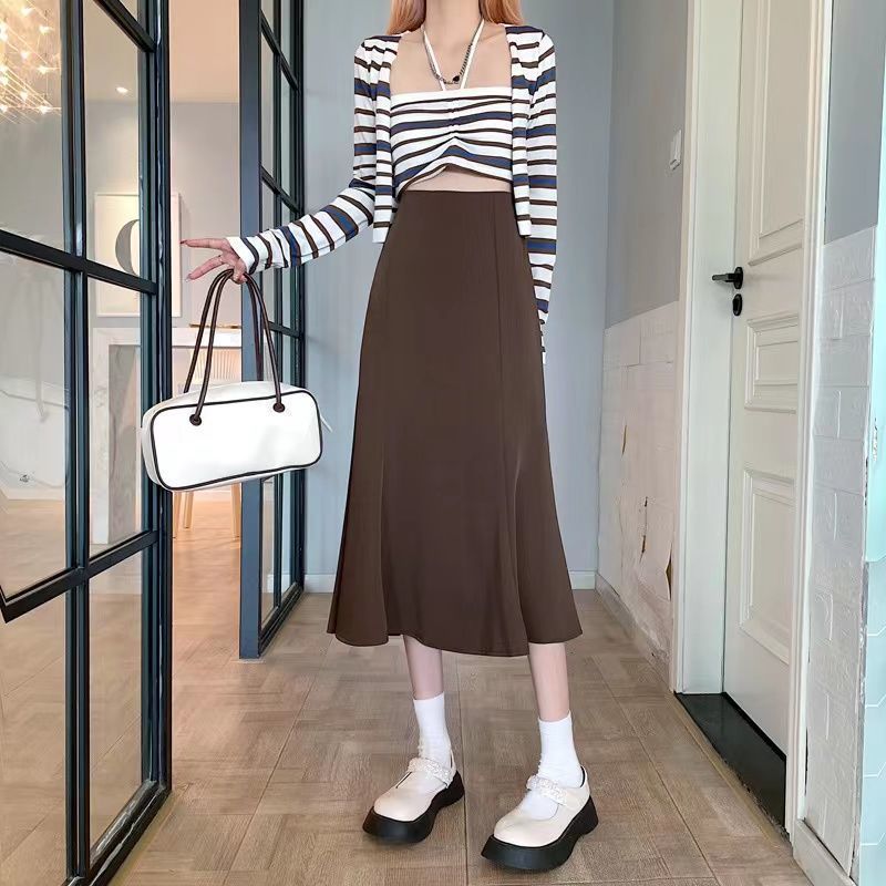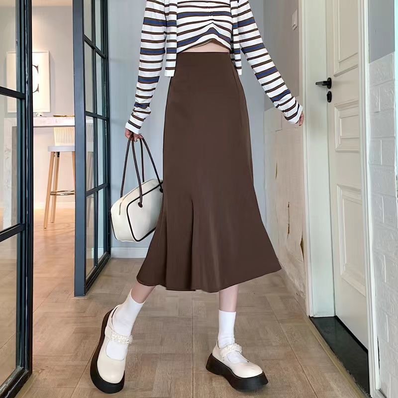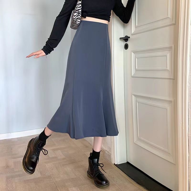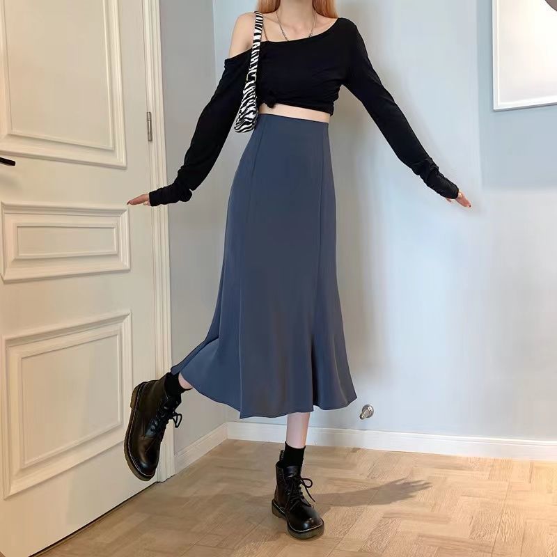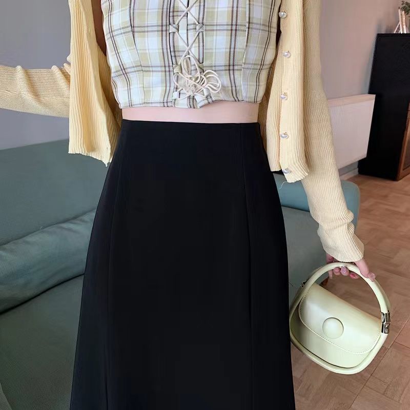 검은 세트 치마 여성의 봄 새로운 높은 허리 엉덩이 커버 슬림 A 라인 엉덩이 피쉬 스커트 중간 길이 스커트