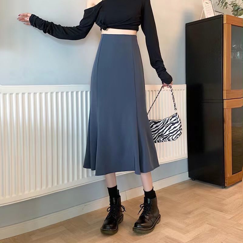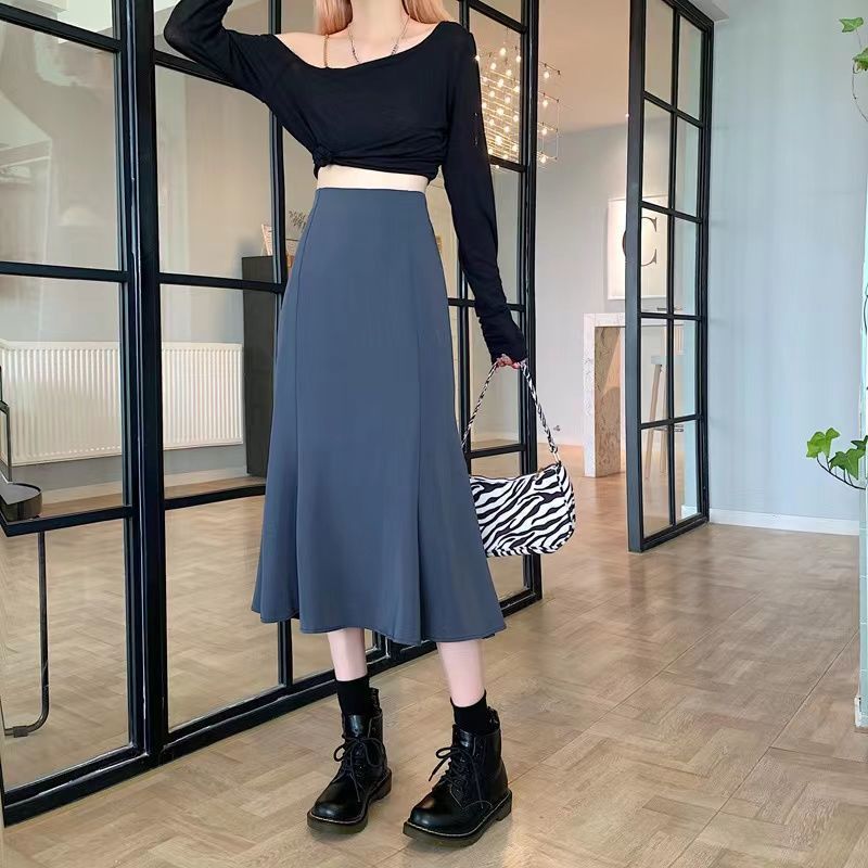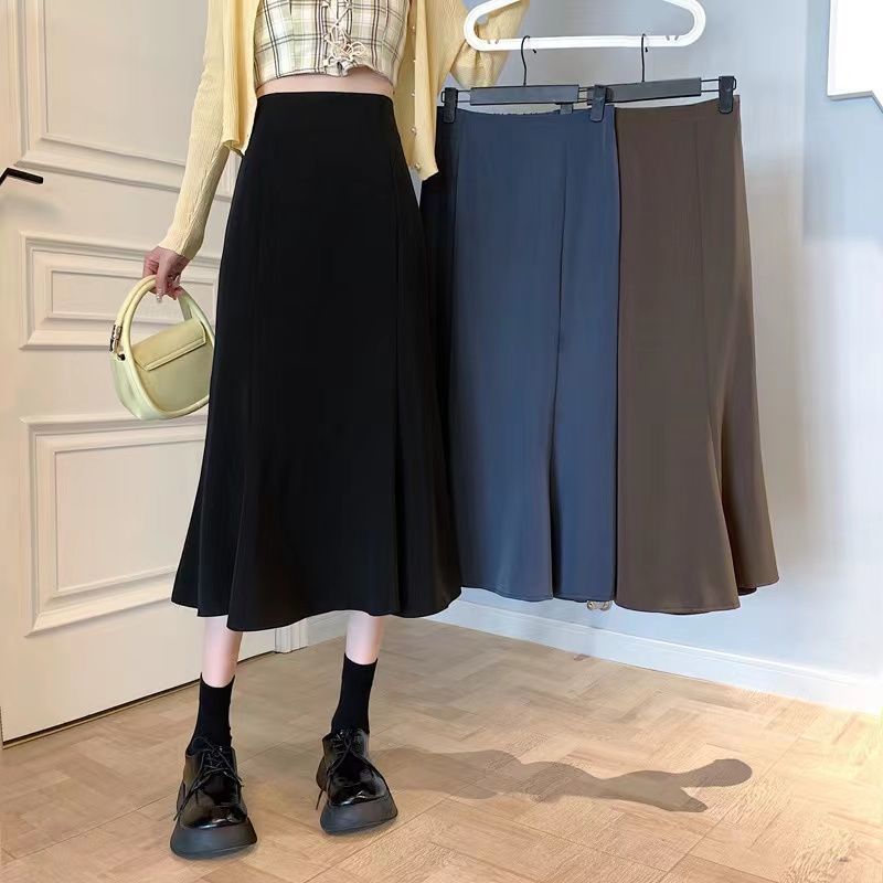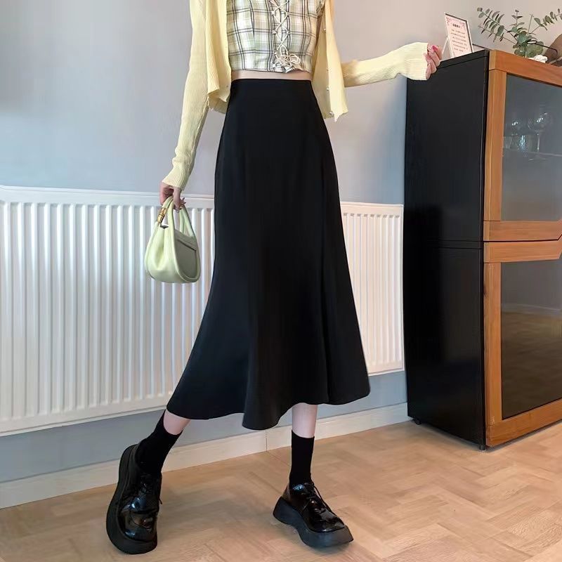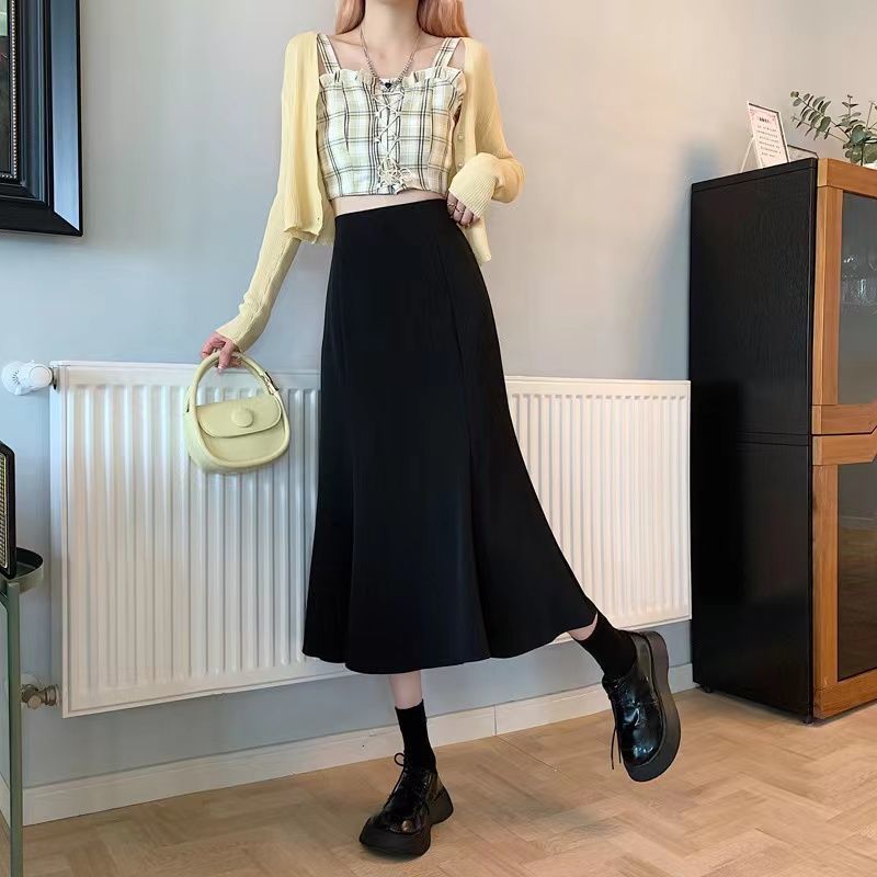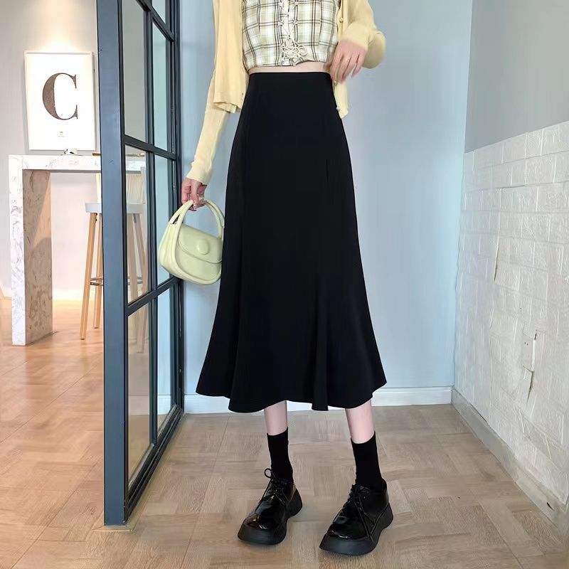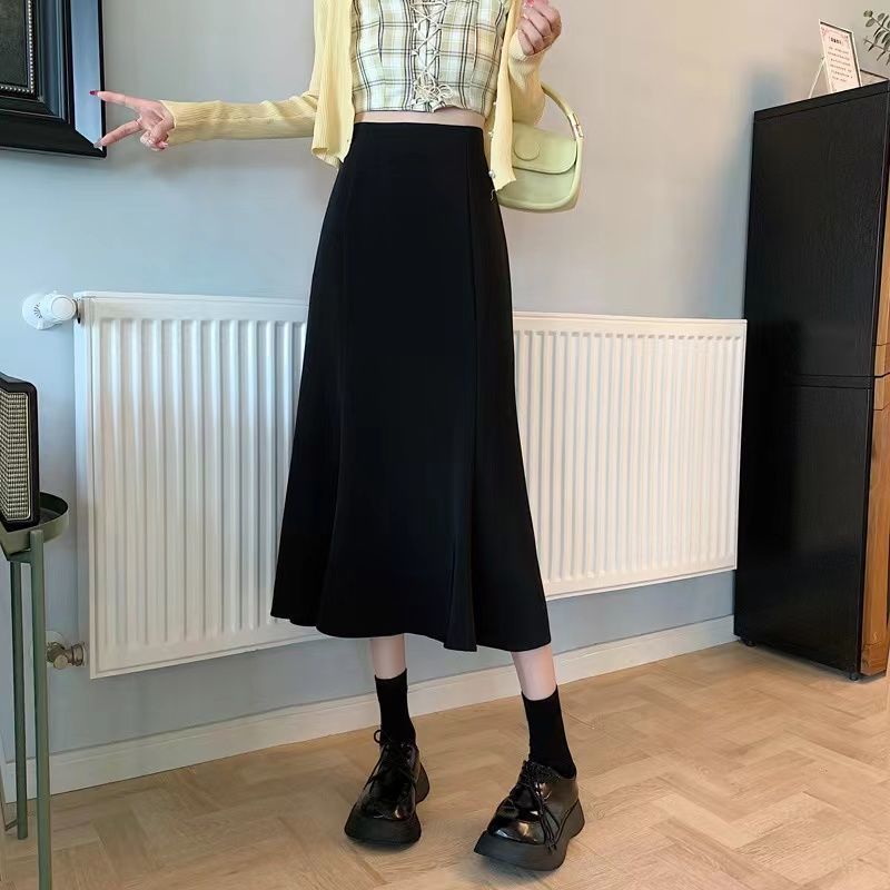 검은 세트 치마 여성의 봄 새로운 높은 허리 엉덩이 커버 슬림 A 라인 엉덩이 피쉬 스커트 중간 길이 스커트스토어 가기