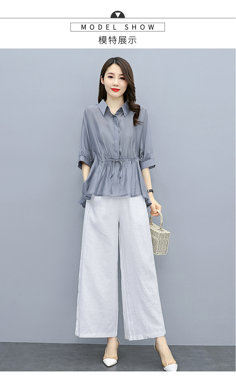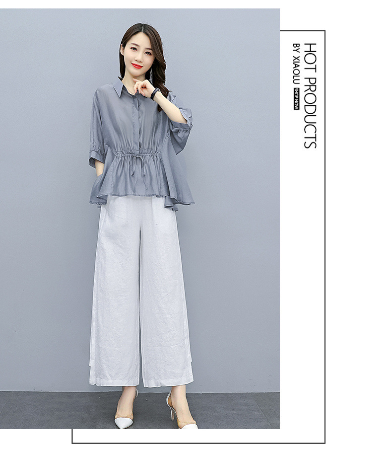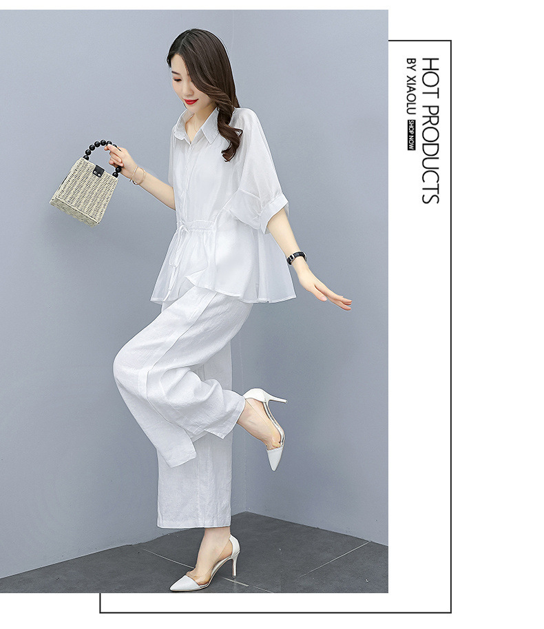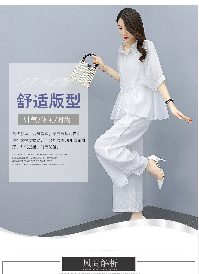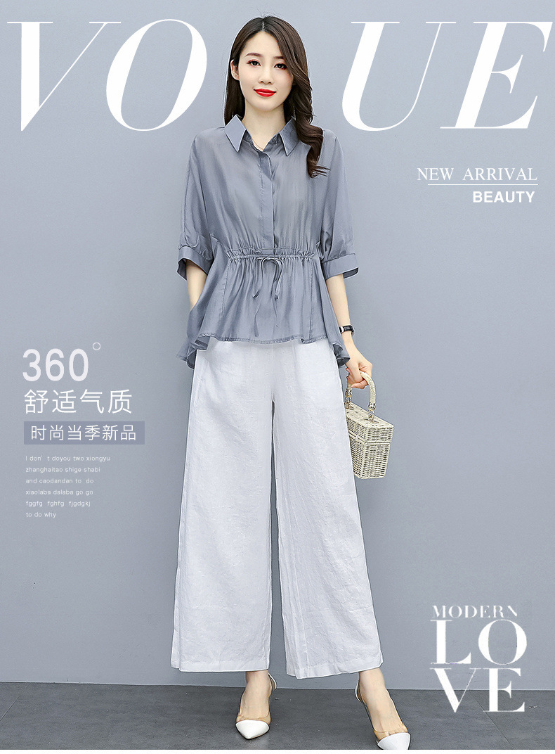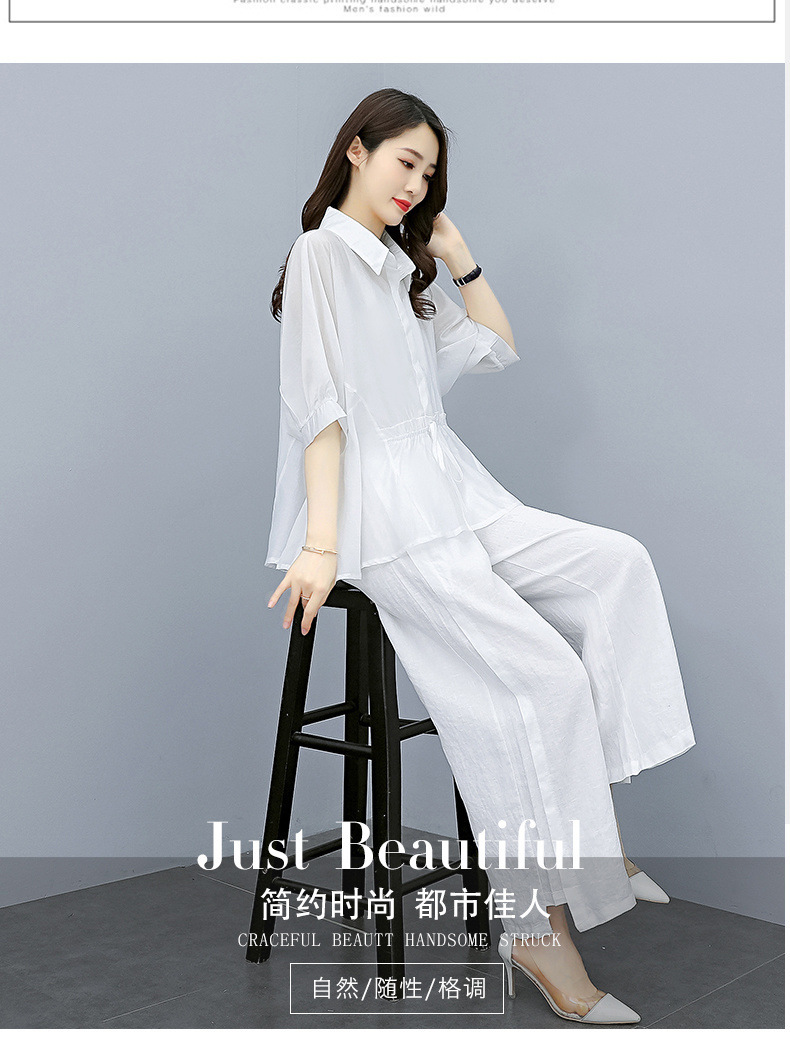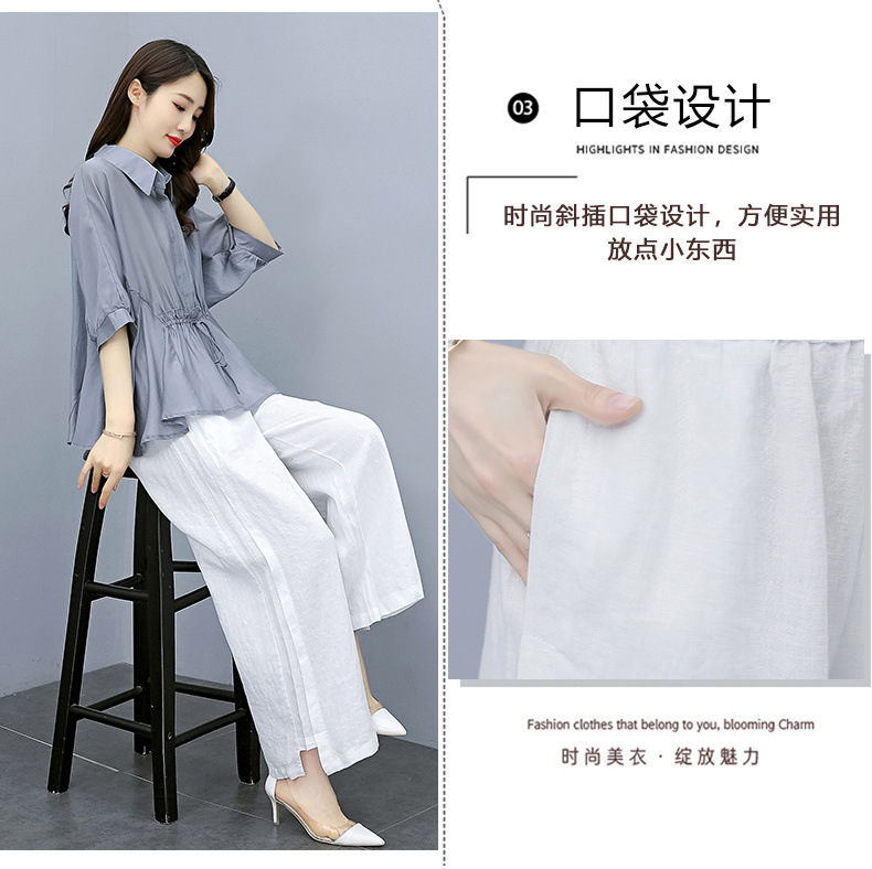 패션 코튼 및 리넨 세트 여성 유행 봄과 여름 새로운 우아한 슬리밍 서양식 연령 감소 리넨 와이드 레그 바지 투피스 세트