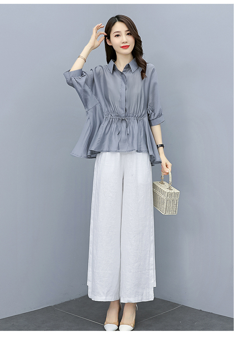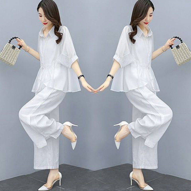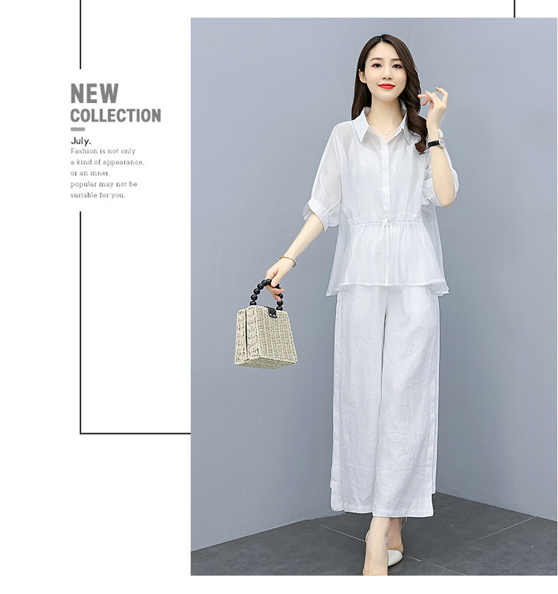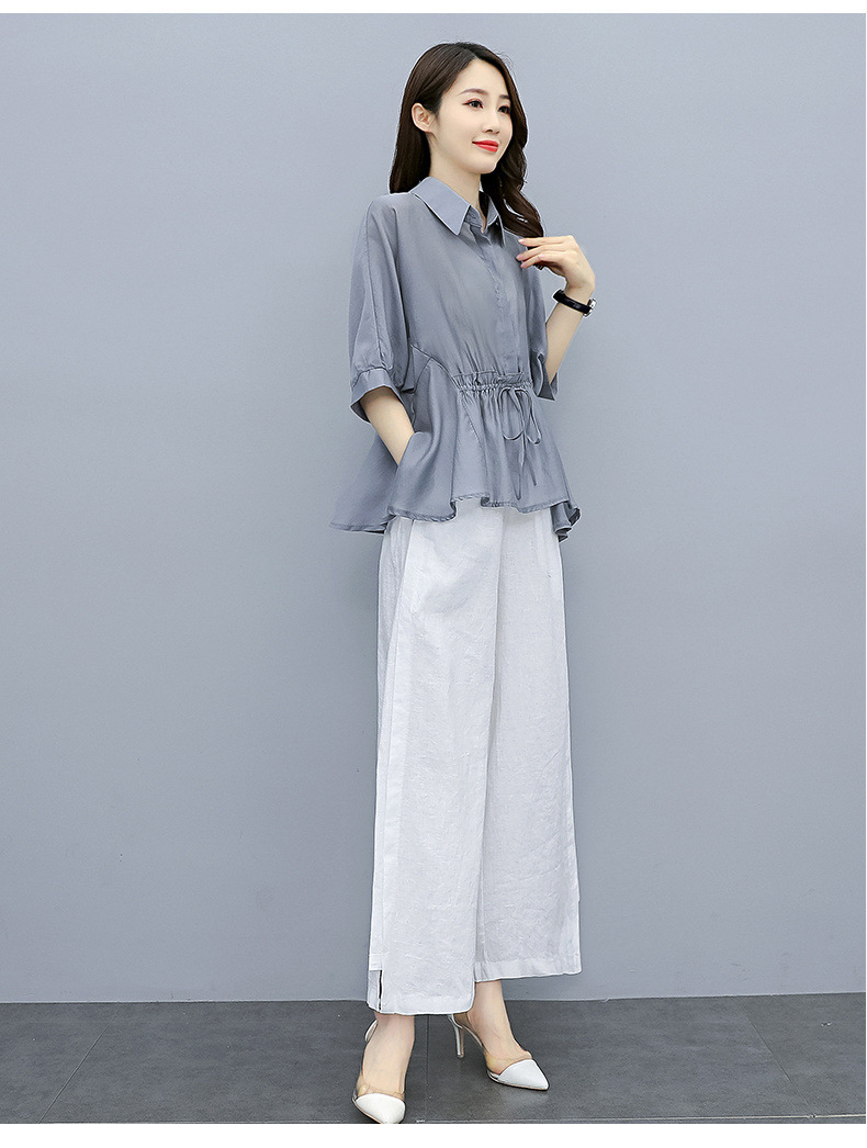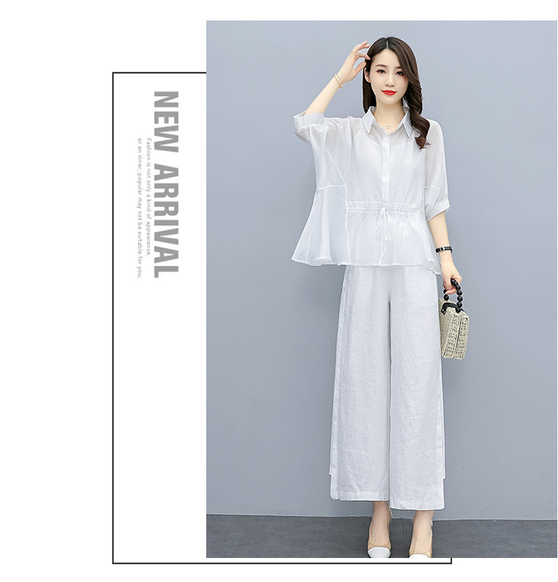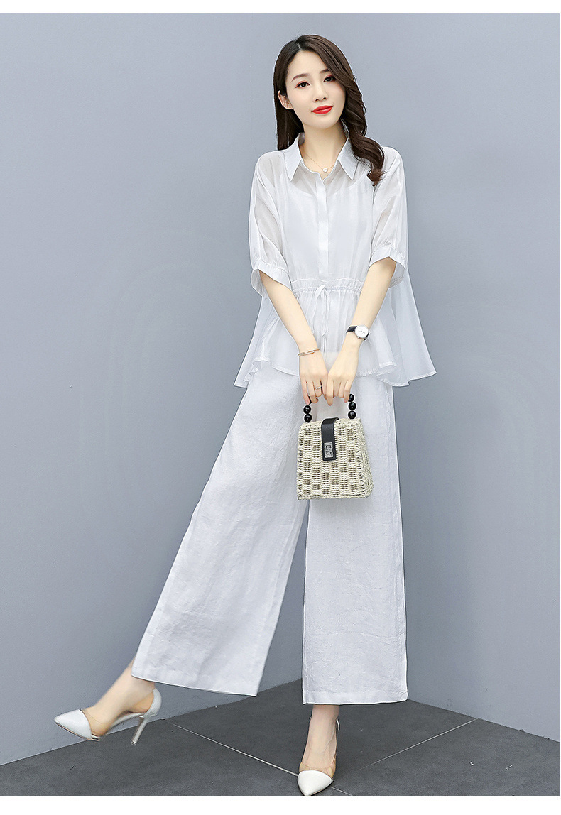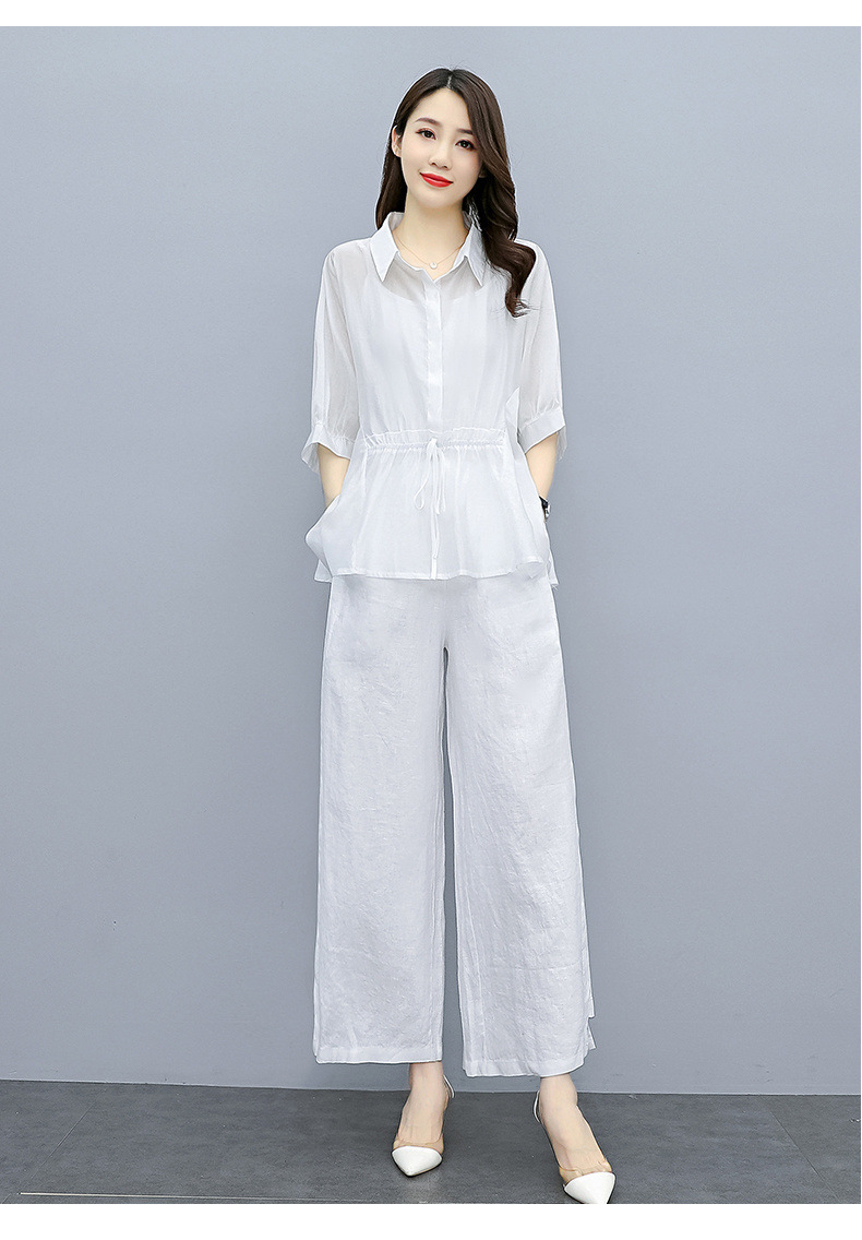 패션 코튼 및 리넨 세트 여성 유행 봄과 여름 새로운 우아한 슬리밍 서양식 연령 감소 리넨 와이드 레그 바지 투피스 세트