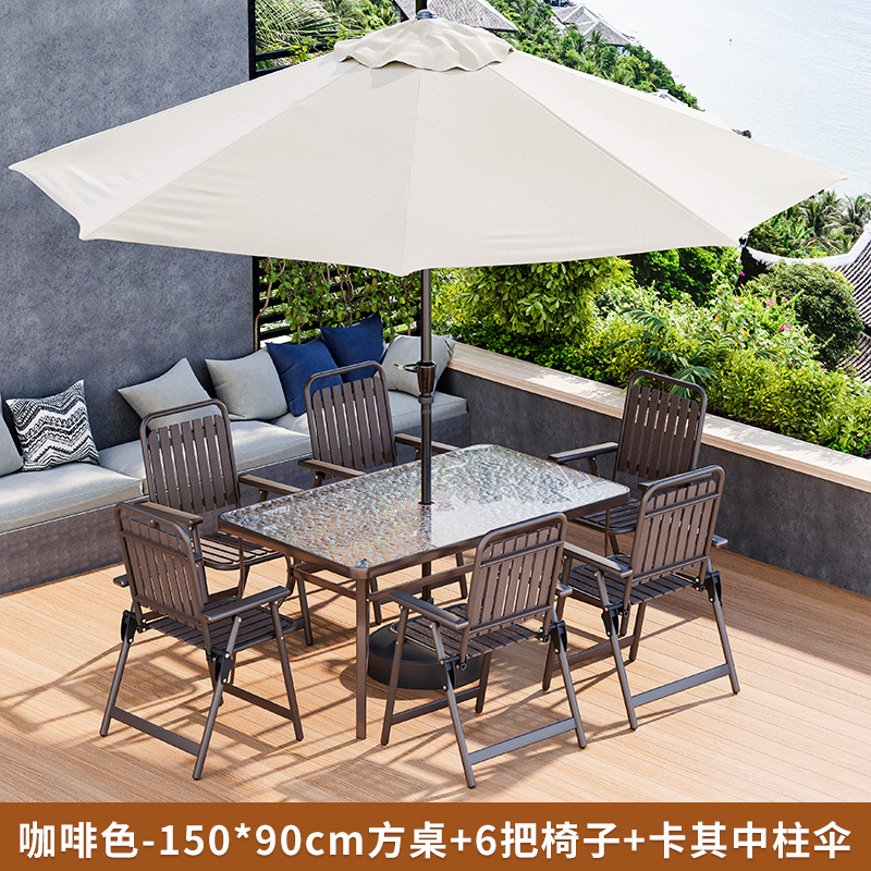 • 커피 접이식 세로무늬 의자 (의자 6개 + 물무늬 롱테이블 150*90 + 카키색 중기우산)