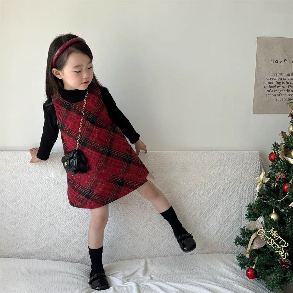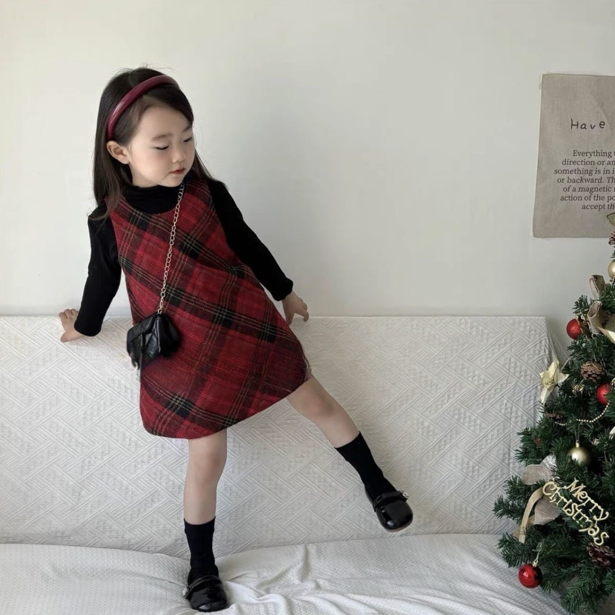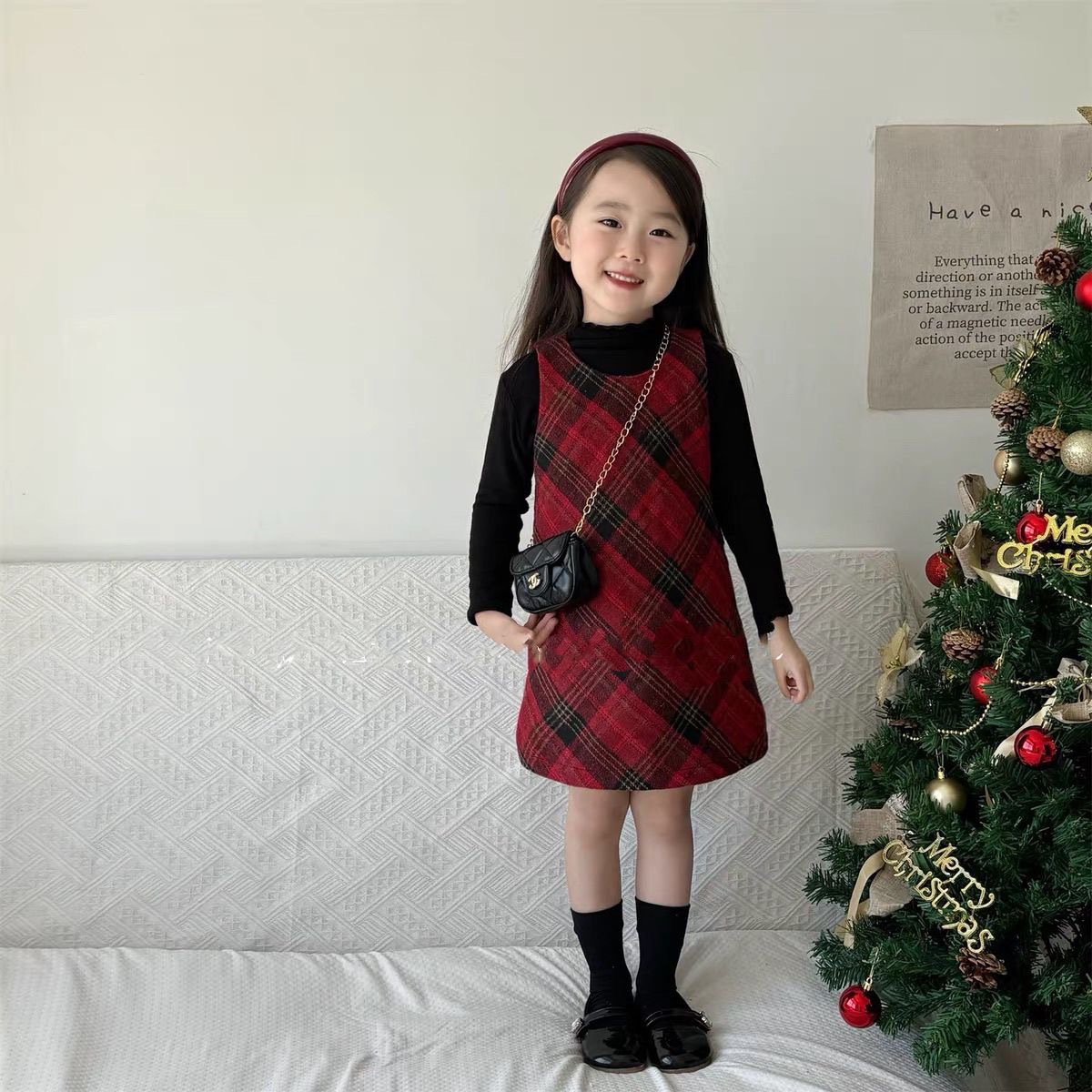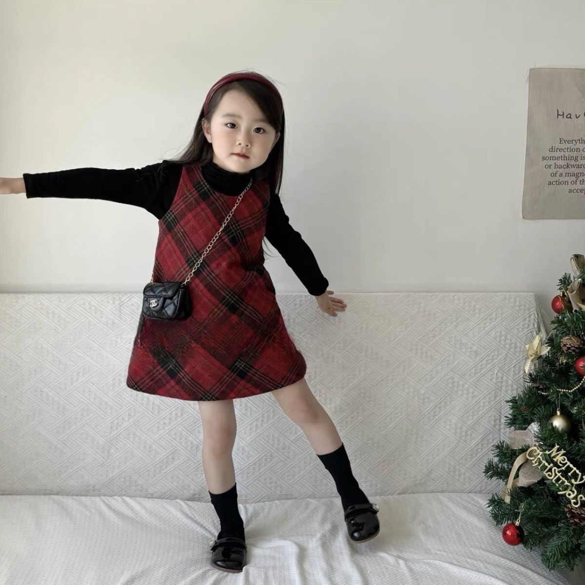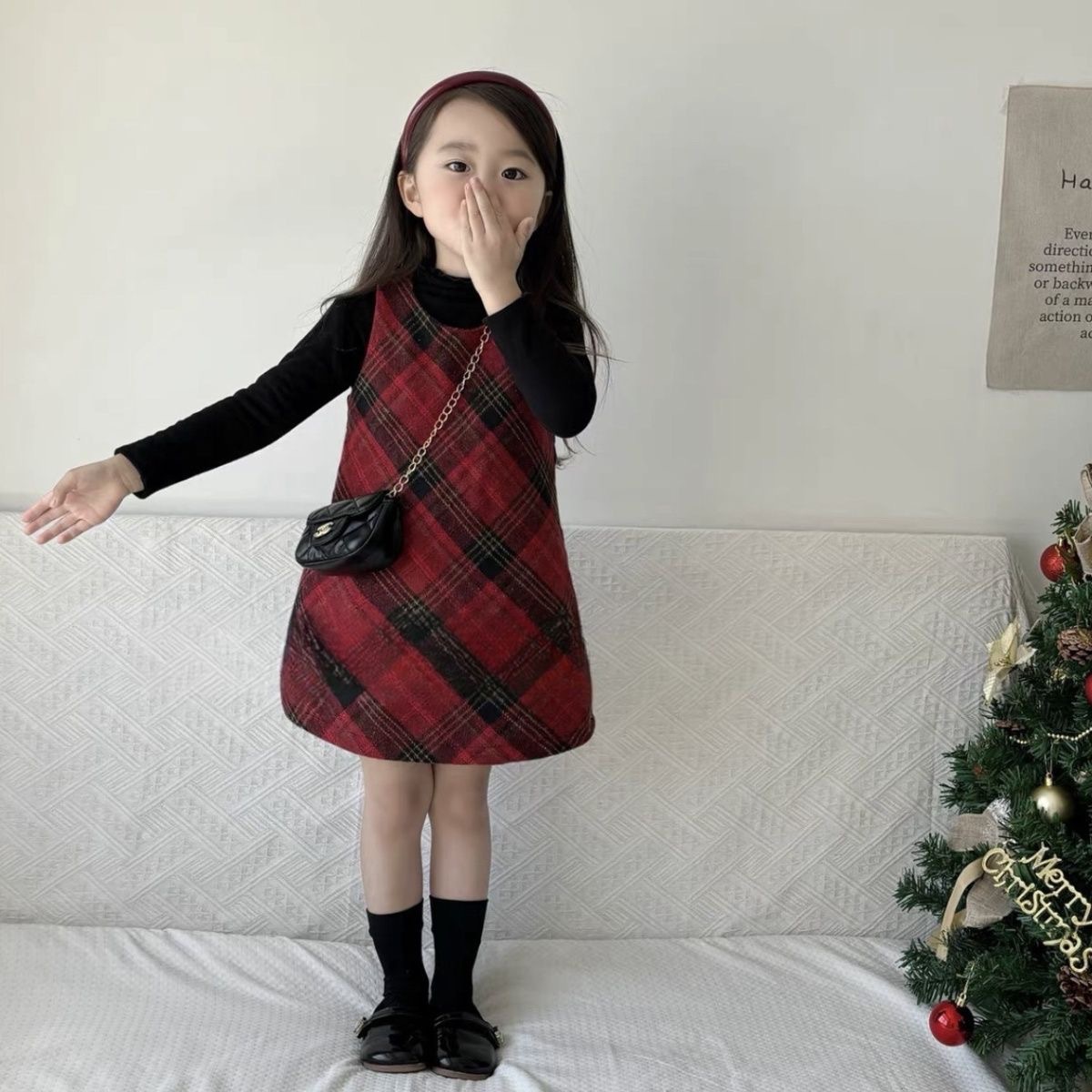 소녀의 붉은 격자 무늬 모직 조끼 원피스 2024 가을과 겨울 새로운 어린이 할로윈 크리스마스 원피스 투피스 세트스토어 가기