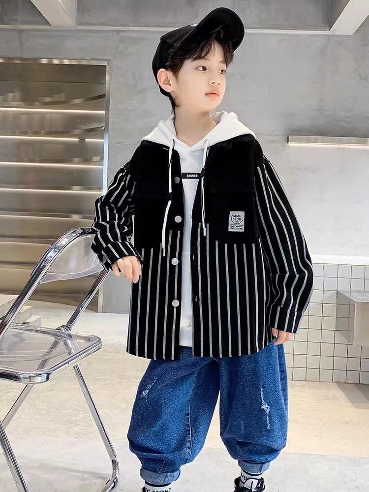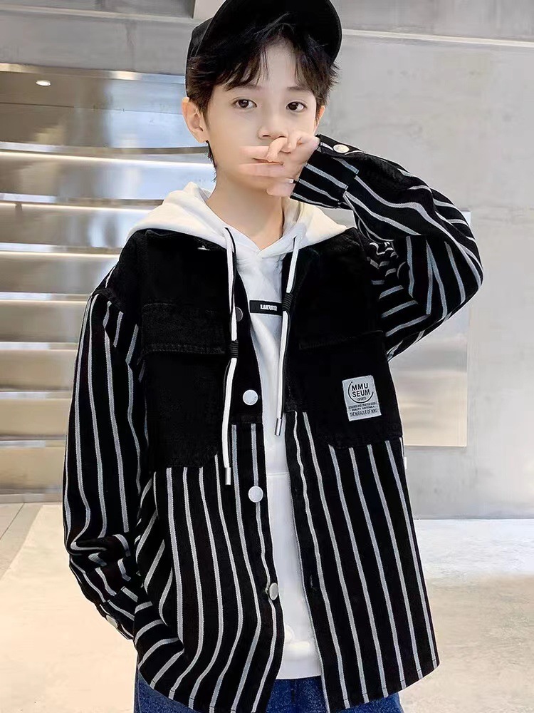 소년의 봄과 가을 줄무늬 데님 셔츠 2024 새로운 도착 중다 어린이 서양식 소년 봄과 가을 셔츠 코트 트렌디스토어 가기