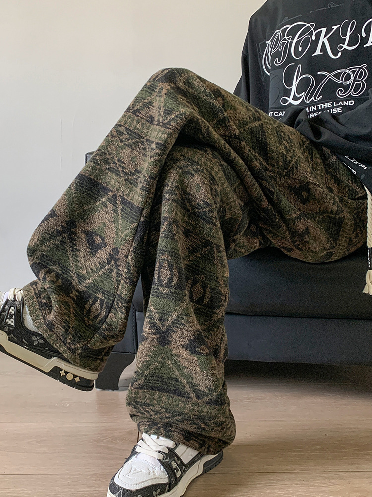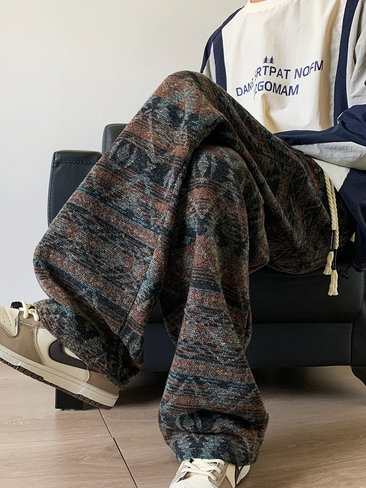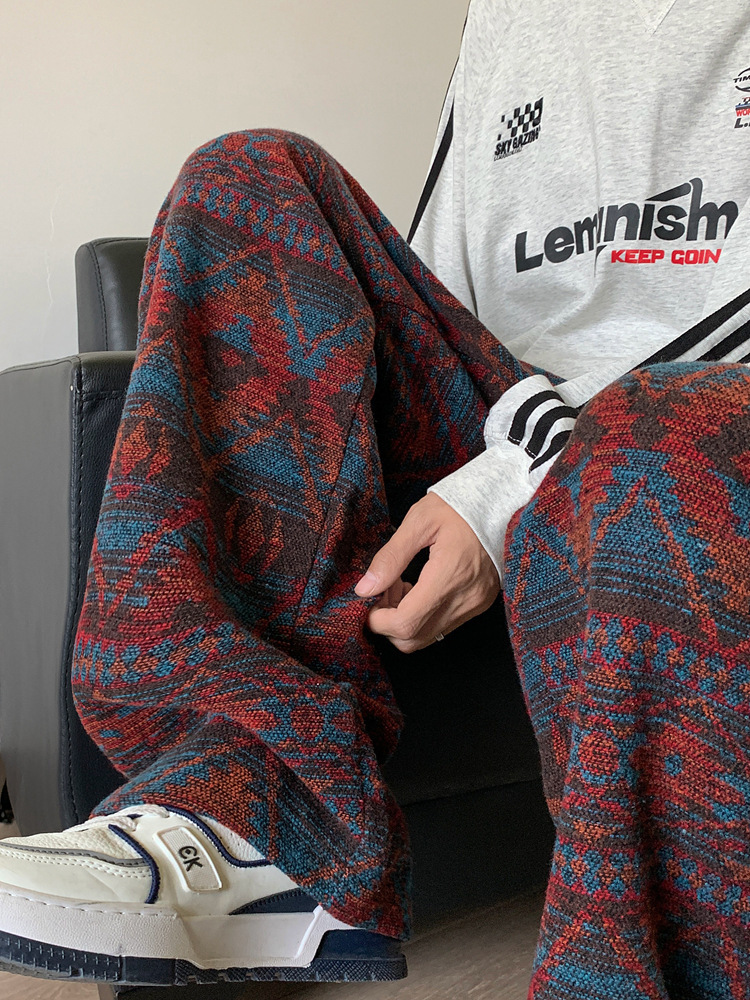 민족 스타일 자카드 바지 남성 가을 틈새 디자인 센스 니트 바지 미국 스타일 레트로 와이드 레그 캐주얼 바지
