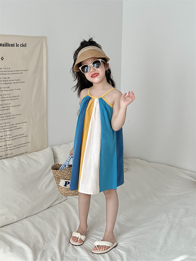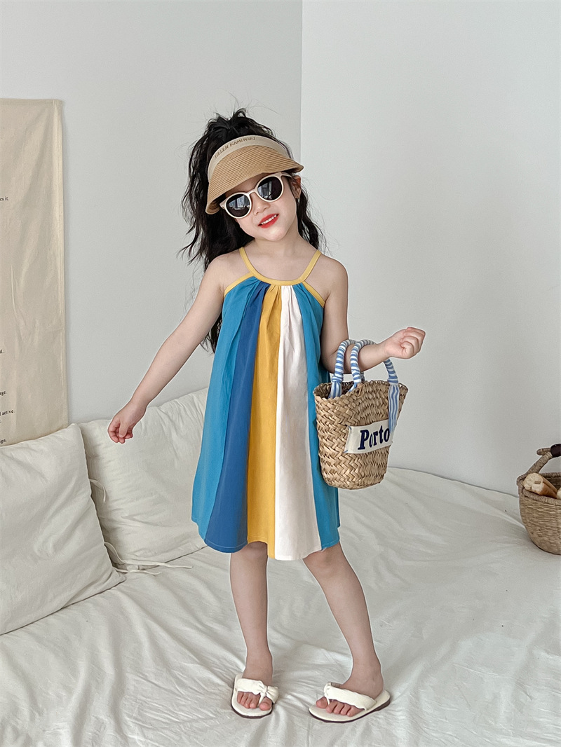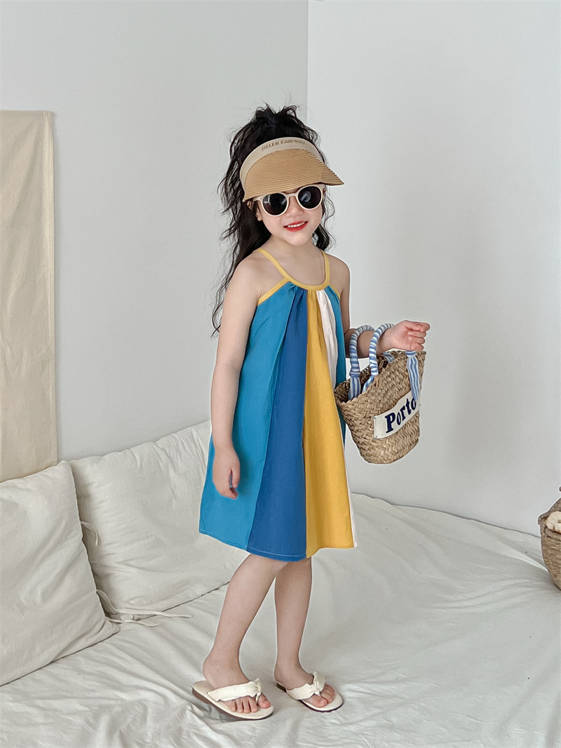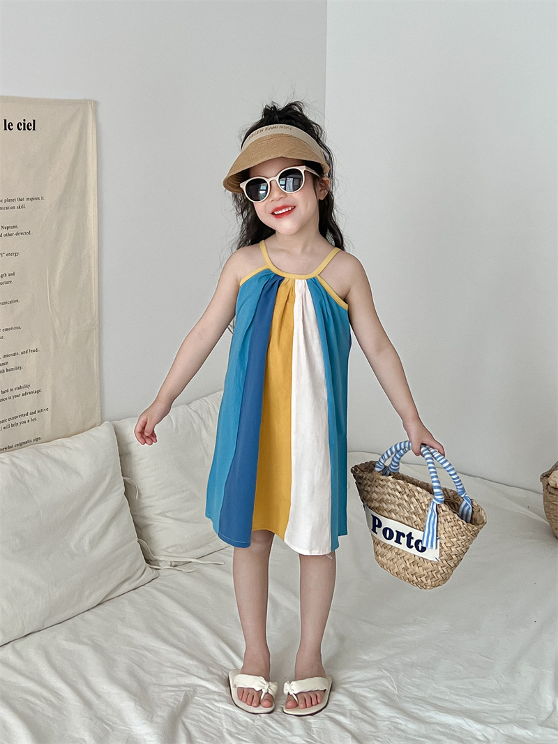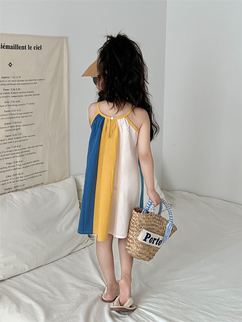 2025 봄과 여름 한국 아동복 소녀 순수한면 파란색과 노란색 색상 일치 해변 휴일 싼야 슬링 얇은 원피스스토어 가기