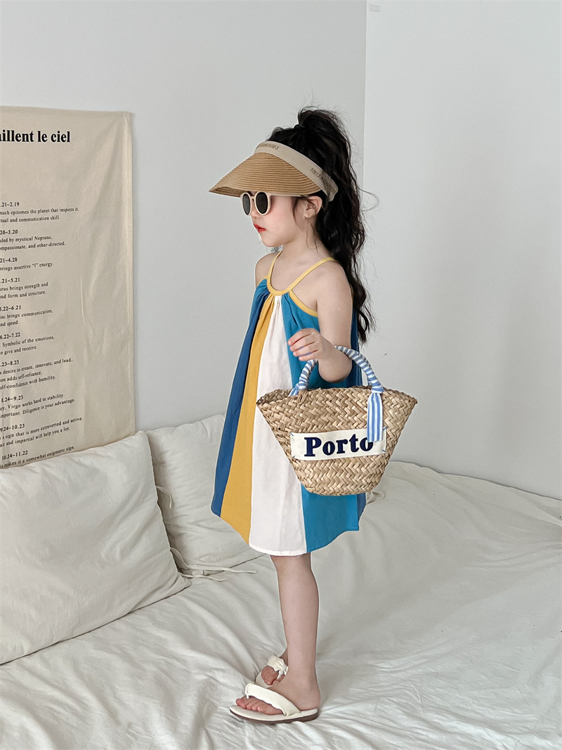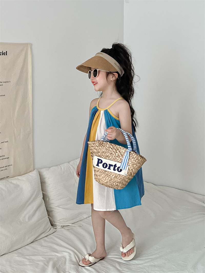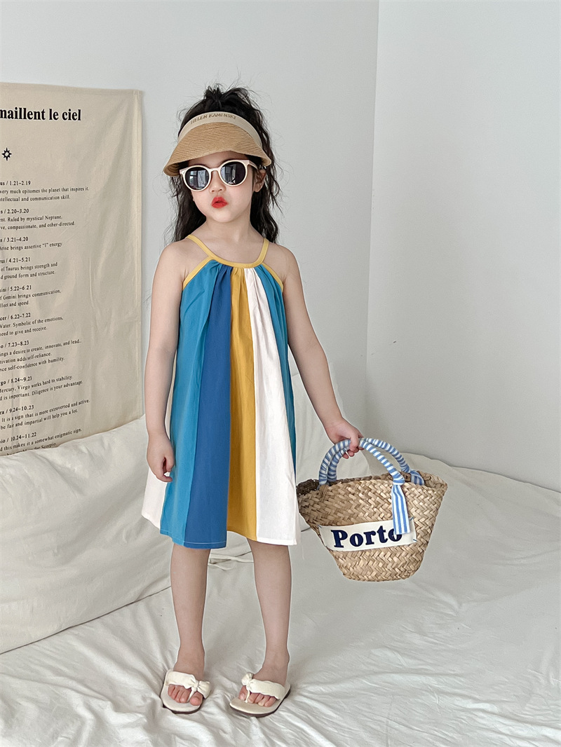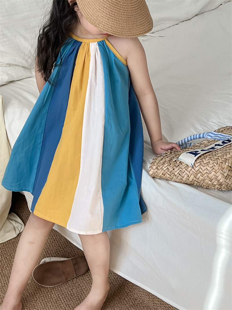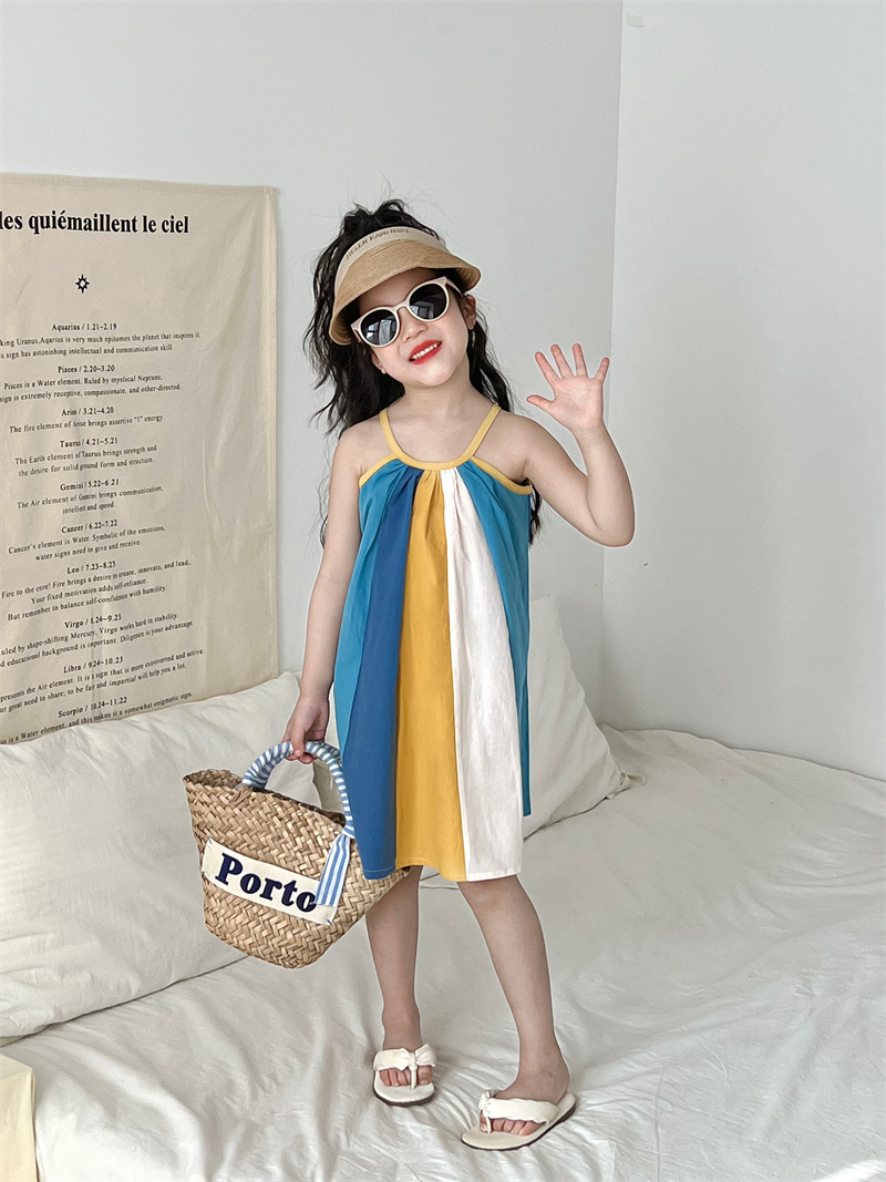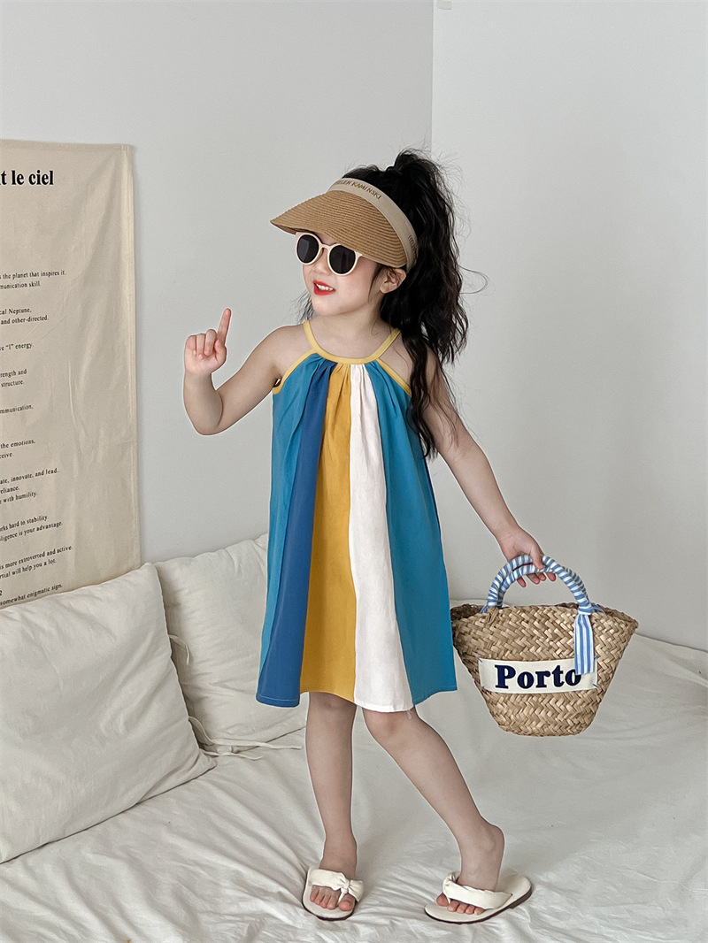 2025 봄과 여름 한국 아동복 소녀 순수한면 파란색과 노란색 색상 일치 해변 휴일 싼야 슬링 얇은 원피스스토어 가기