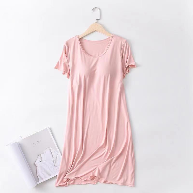가슴 패드 잠옷을 입은 모달 반팔 잠옷 브라 프리 러플 원피스 여성용 여름 의상 홈 의류