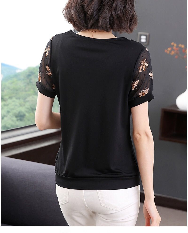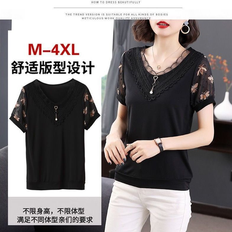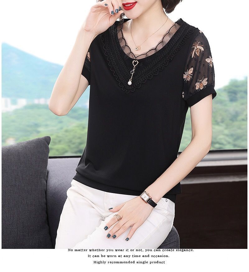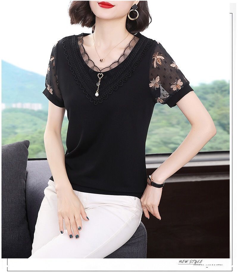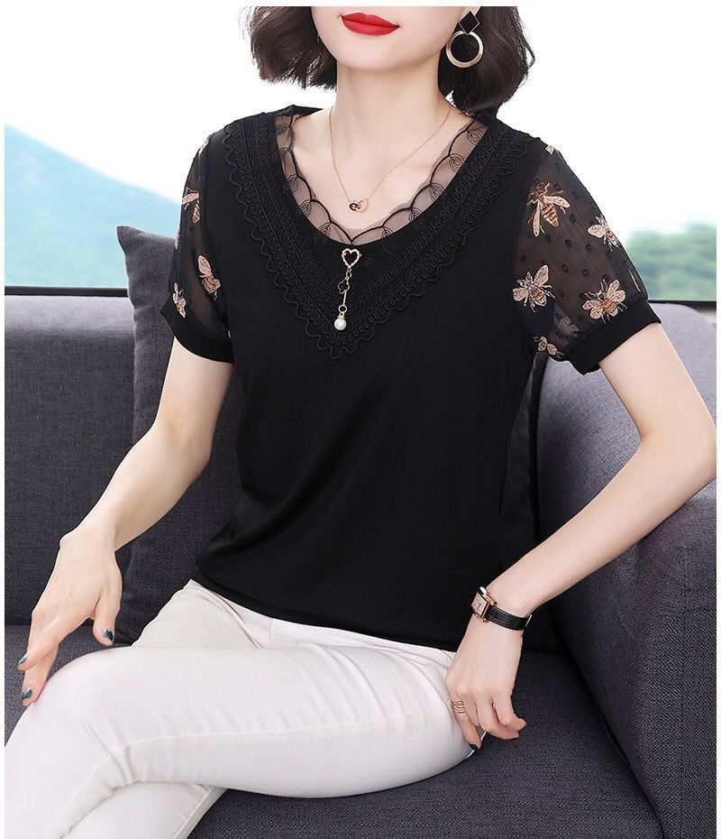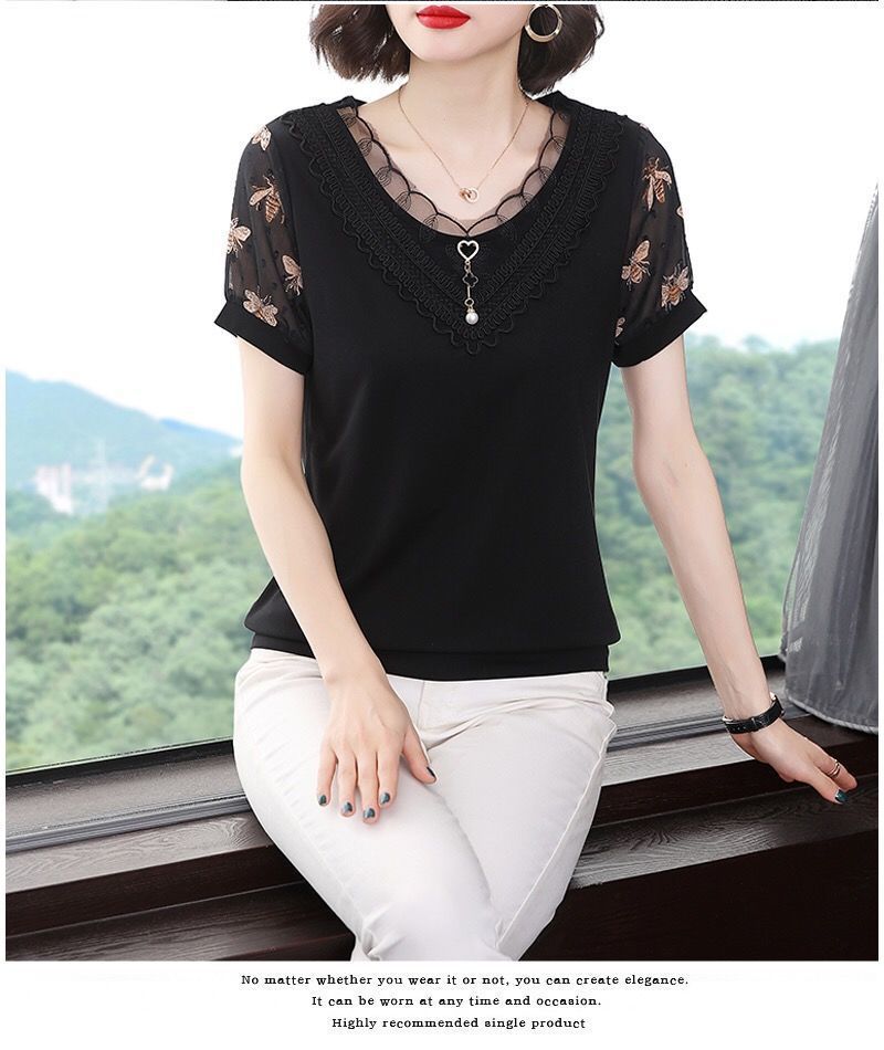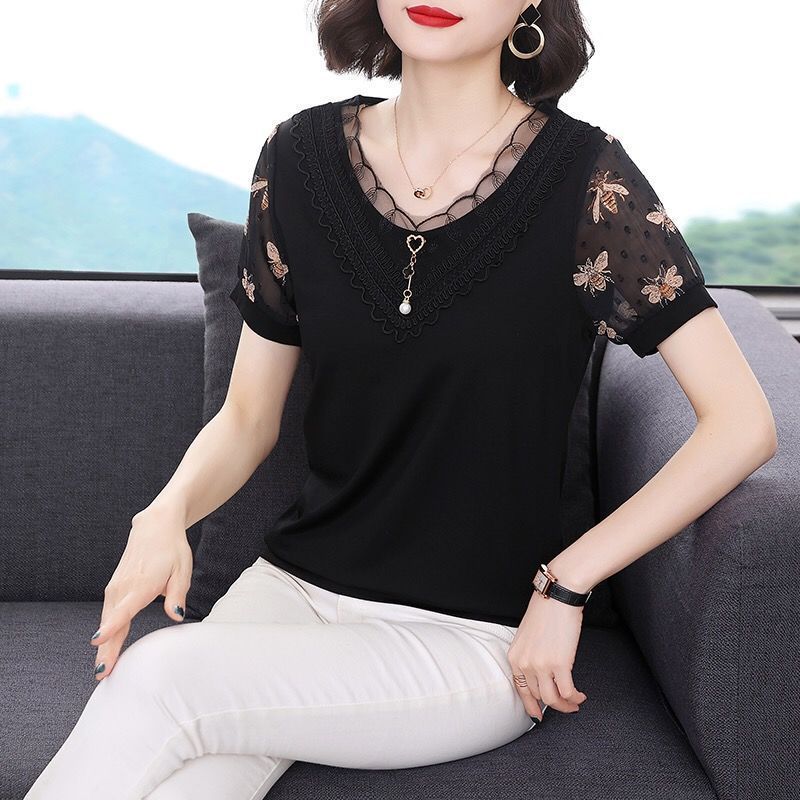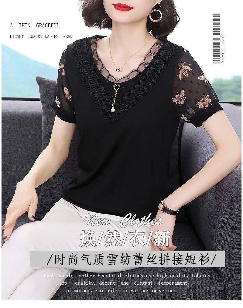 2023 년 여름 새로운 반팔 쉬폰 셔츠 여성용 레이스 셔츠 하이 엔드 웨스턴 스타일 중년 어머니 V-넥 여름 탑