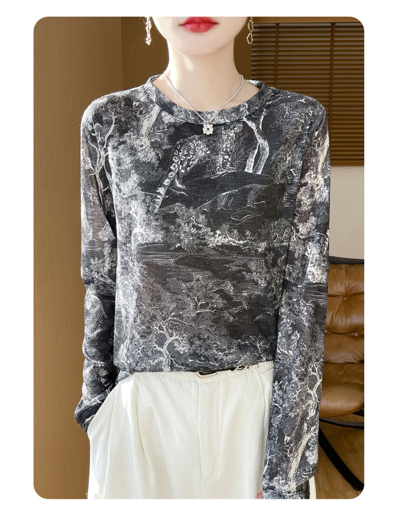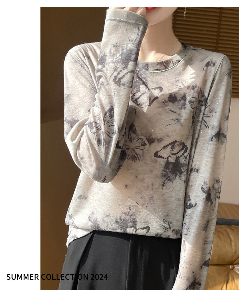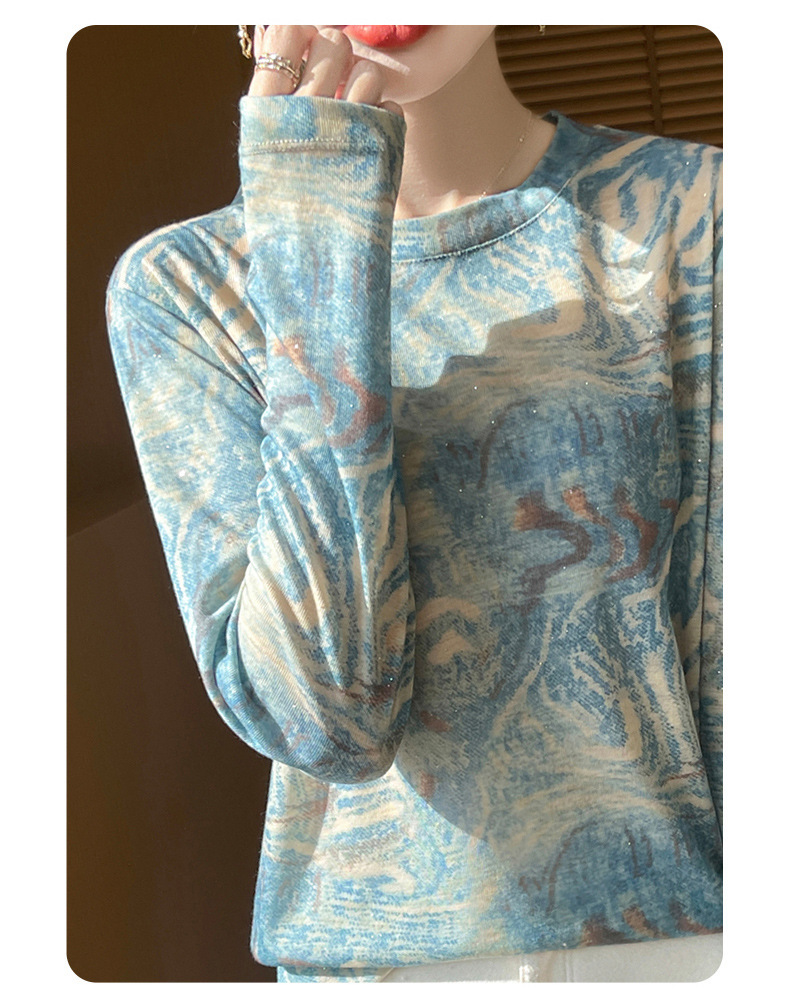 봄과 여름 크루 넥 긴팔 블라우스 여성 슬리밍 한국 스타일 캐주얼 인쇄 스웨터 유행 얇은 베이스 셔츠