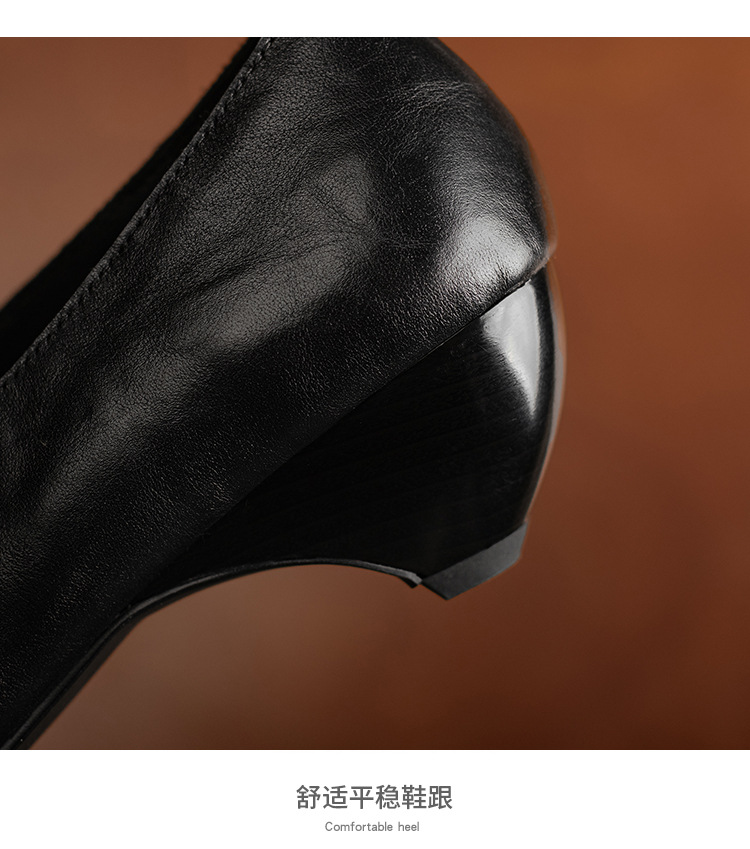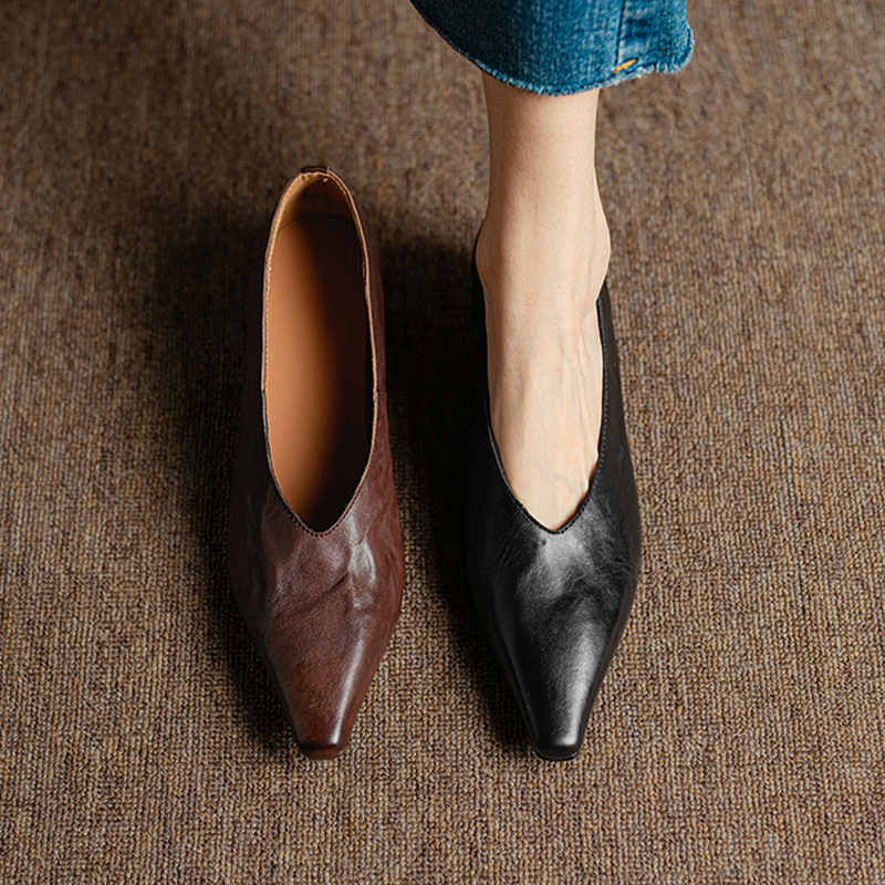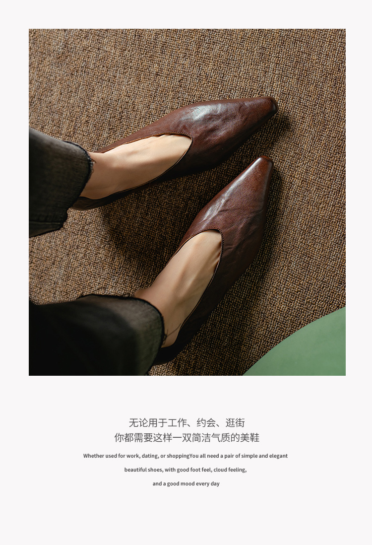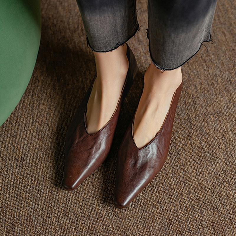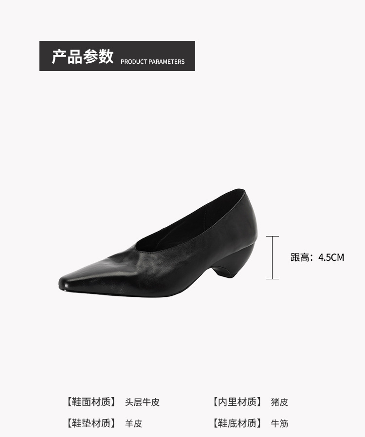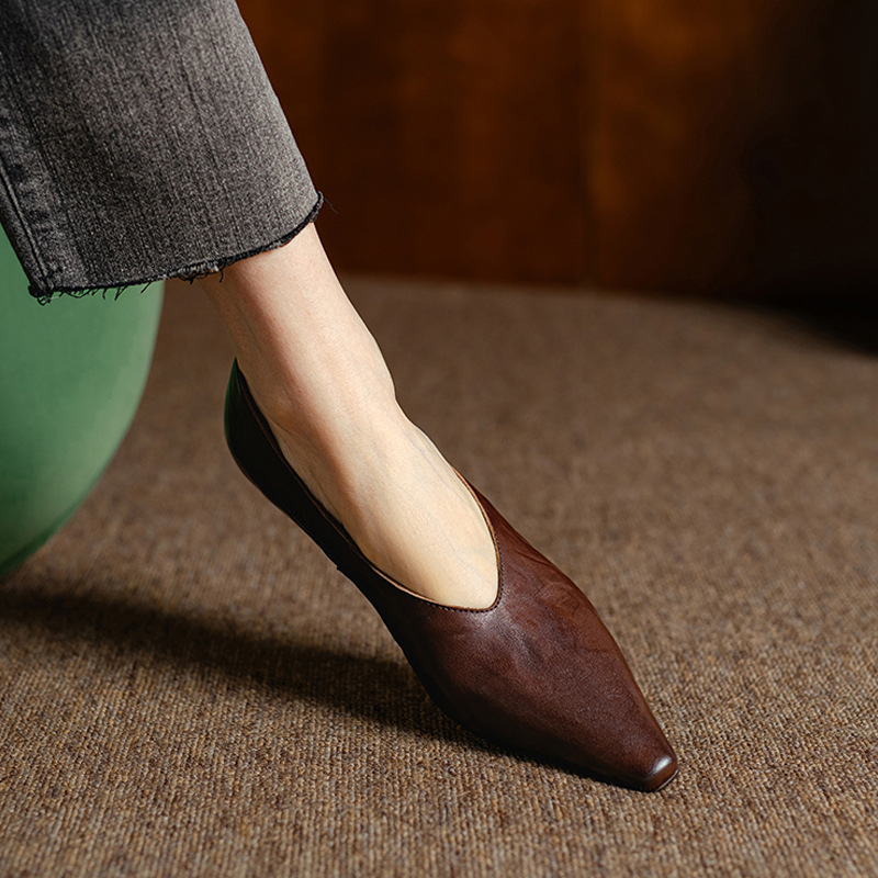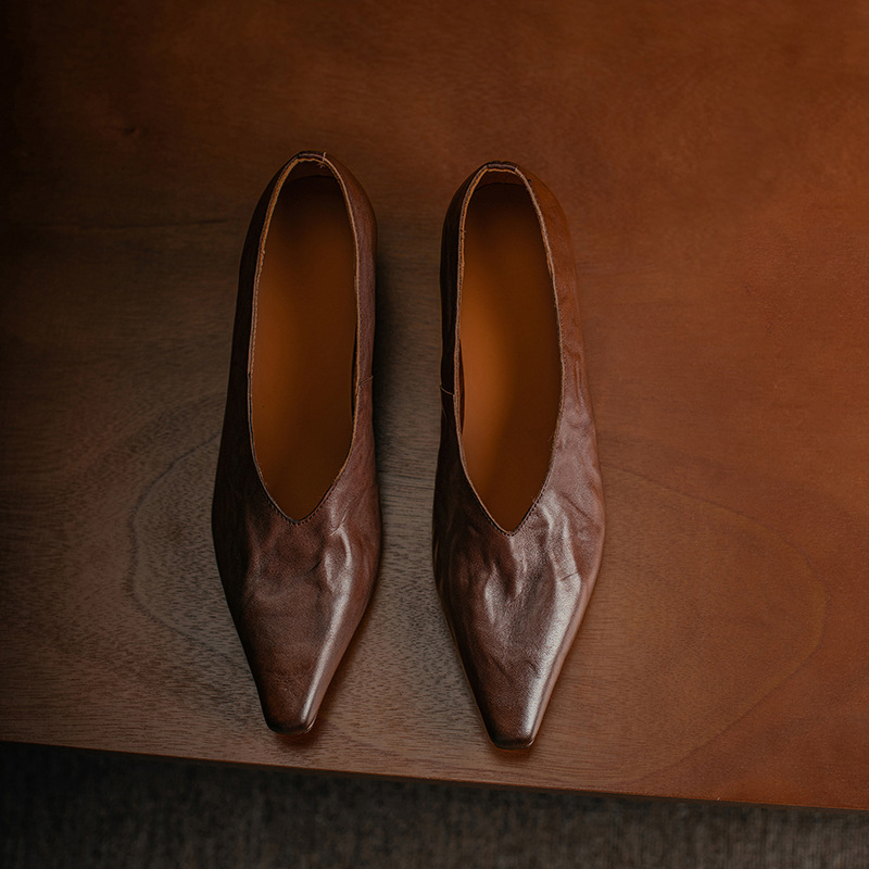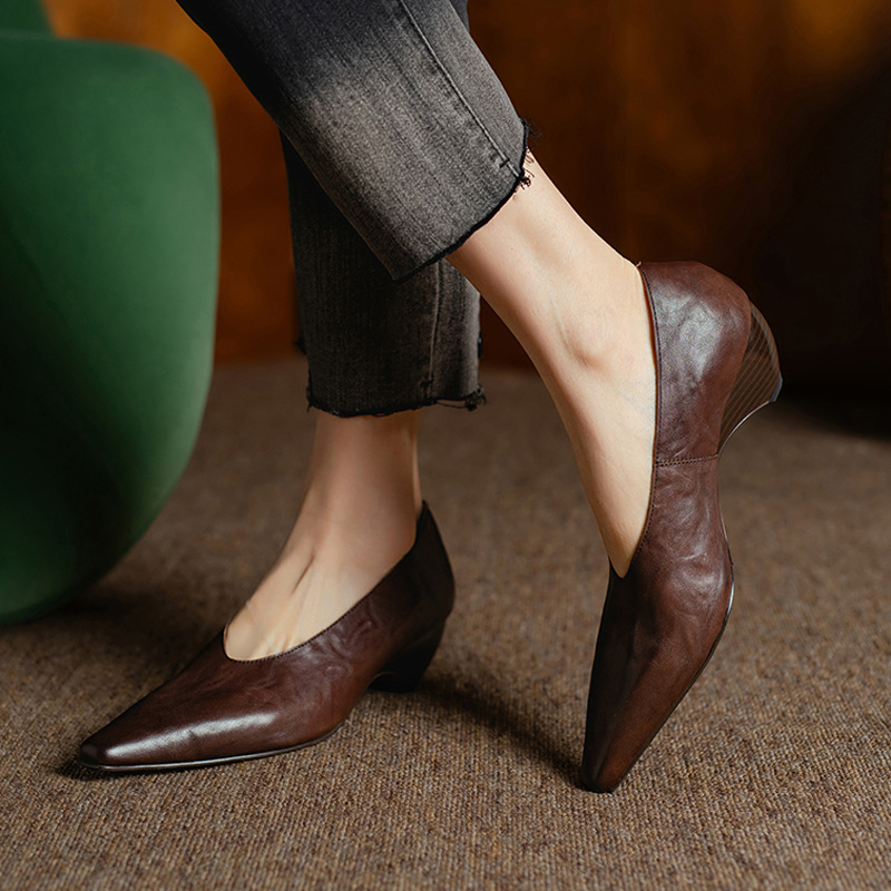 5cm 프랑스 부드러운 Cowhide V-Mouth 싱글 슈즈 여성 다크 브라운 두꺼운 힐 하이힐 슈즈 2025 봄과 가을 미드 힐 밀크 신발스토어 가기