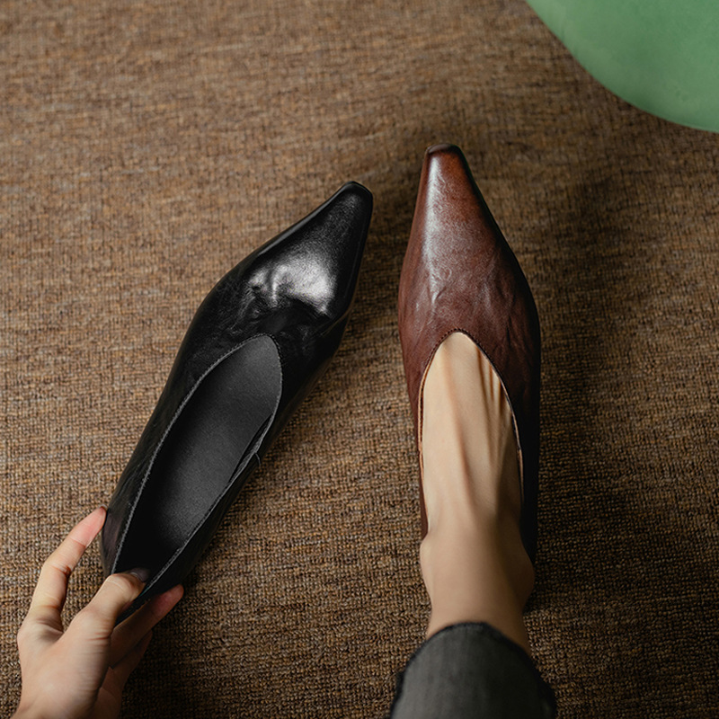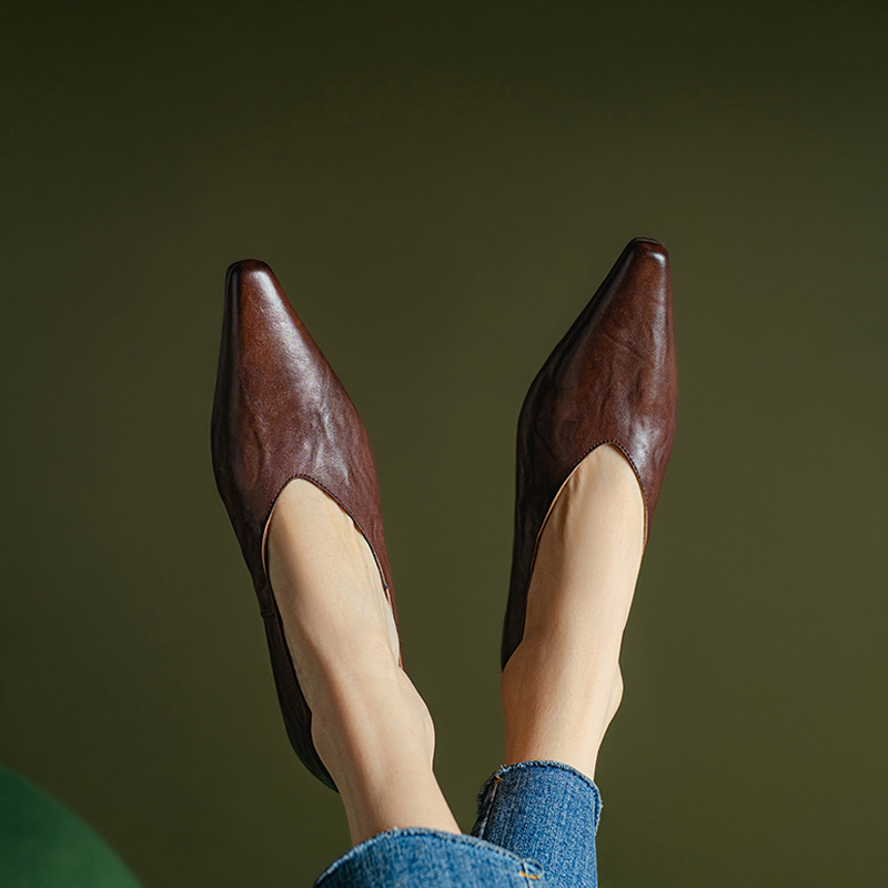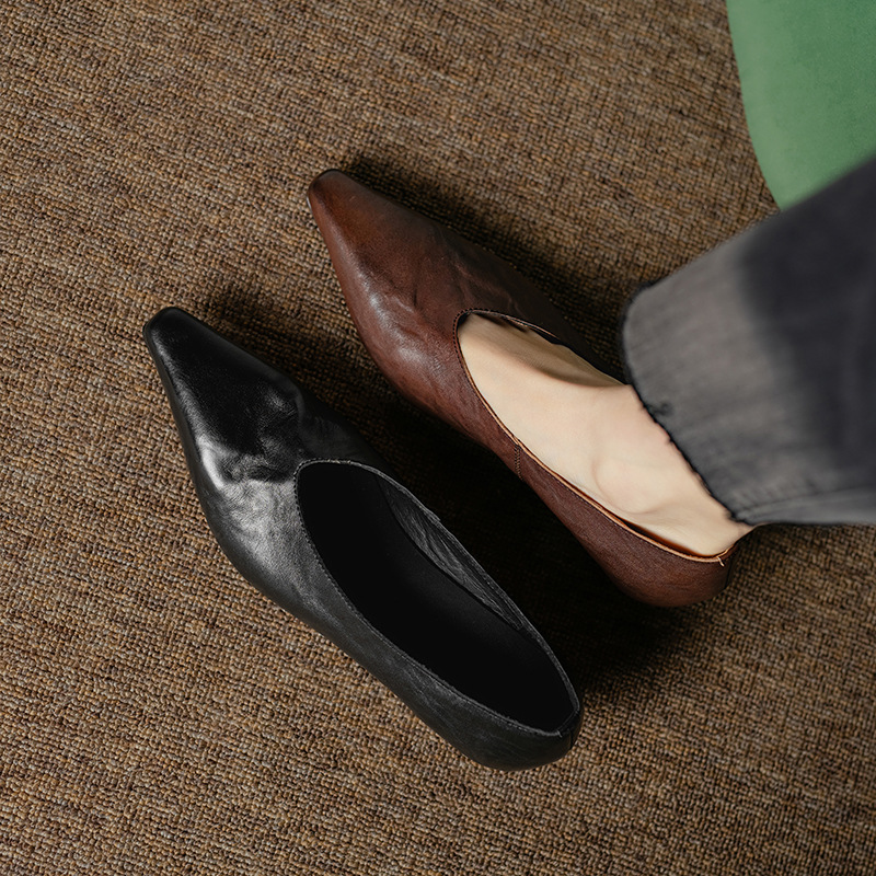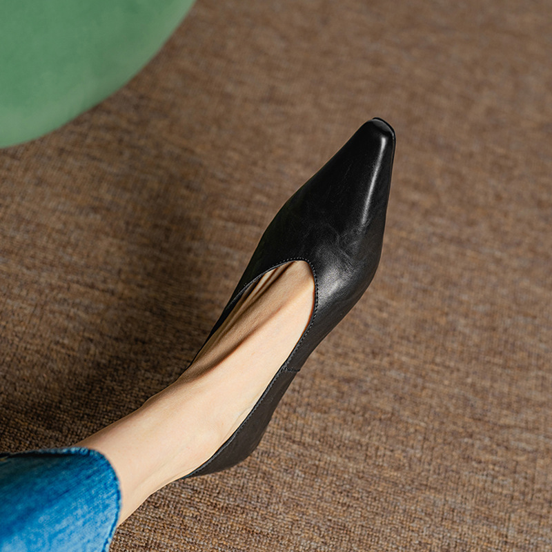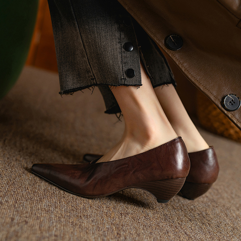 5cm 프랑스 부드러운 Cowhide V-Mouth 싱글 슈즈 여성 다크 브라운 두꺼운 힐 하이힐 슈즈 2025 봄과 가을 미드 힐 밀크 신발
